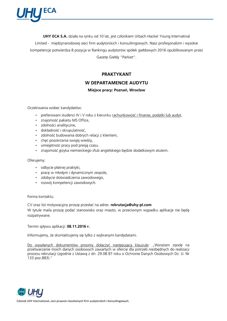 UHY ECA S.A. działa na rynku od 10 lat, jest członkiem Urbach Hacker Young Internatinal Limited - międzynarodowej sieci firm audytorskich i konsultingowych. Nasz profesjonalizm i wysokie kompetencje potwierdza 8 pozycja w Rankingu audytorów spółek giełdowych 2016 opublikowanym przez Gazetę Giełdy "Parkiet". PRAKTYKANT W DEPARTAMENCIE AUDYTU Miejsce pracy: Poznań, Wrocław Oczekiwania wobec kandydatów: • • • • • • • • preferowani studenci IV i V roku z kierunku rachunkowość i finanse, podatki lub audyt, znajomość pakietu MS Office, zdolności analityczne, dokładność i skrupulatność, zdolność budowania dobrych relacji z klientem, chęć poszerzania swojej wiedzy, umiejętność pracy pod presją czasu. znajomość języka niemieckiego i/lub angielskiego będzie dodatkowym atutem. Oferujemy: • • • • odbycie płatnej praktyki, pracę w młodym i dynamicznym zespole, zdobycie doświadczenia zawodowego, rozwój kompetencji zawodowych. Forma kontaktu: CV oraz list motywacyjny proszę przesłać na adres: [email protected] W tytule maila proszę podać stanowisko oraz miasto, w przeciwnym wypadku aplikacje nie będą rozpatrywane. Termin spływu aplikacji: 08.11.2016 r. Informujemy, że skontaktujemy się tylko z wybranymi kandydatami. Do wysyłanych dokumentów prosimy dołączyć następującą klauzulę: „Wyrażam zgodę na przetwarzanie moich danych osobowych zawartych w ofercie dla potrzeb niezbędnych do realizacji procesu rekrutacji (zgodnie z Ustawą z dn. 29.08.97 roku o Ochronie Danych Osobowych Dz. U. Nr 133 poz.883).” Członek UHY International, sieci prawnie niezależnych firm audytorskich i konsultingowych.