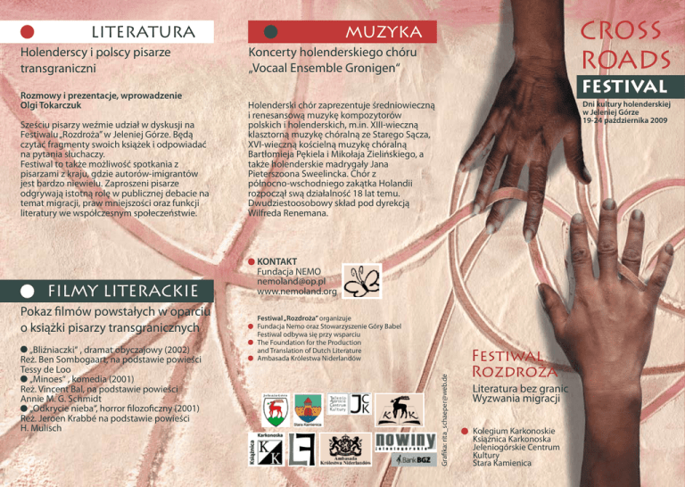 LITERATURA Rozmowy i prezentacje, wprowadzenie Olgi Tokarczuk Sześciu pisarzy weźmie udział w dyskusji na Festiwalu „Rozdroża” w Jeleniej Górze. Będą czytać fragmenty swoich książek i odpowiadać na pytania słuchaczy. Festiwal to także możliwość spotkania z pisarzami z kraju, gdzie autorów-imigrantów jest bardzo niewielu. Zaproszeni pisarze odgrywają istotną rolę w publicznej debacie na temat migracji, praw mniejszości oraz funkcji literatury we współczesnym społeczeństwie. FILMY LITERACKIE Pokaz filmów powstałych w oparciu o książki pisarzy transgranicznych „Bliźniaczki“ , dramat obyczajowy (2002) Reż. Ben Sombogaart, na podstawie powieści Tessy de Loo „Minoes“ , komedia (2001) Reż. Vincent Bal, na podstawie powieści Annie M. G. Schmidt „Odkrycie nieba“, horror filozoficzny (2001) Reż. Jeroen Krabbé na podstawie powieści H. Mulisch Koncerty holenderskiego chóru „Vocaal Ensemble Gronigen“ FESTIVAL Dni kultury holenderskiej w Jeleniej Górze 19-24 października 2009 Holenderski chór zaprezentuje średniowieczną i renesansową muzykę kompozytorów polskich i holenderskich, m.in. XIII-wieczną klasztorną muzykę chóralną ze Starego Sącza, XVI-wieczną kościelną muzykę chóralną Bartłomieja Pękiela i Mikołaja Zielińskiego, a także holenderskie madrygały Jana Pieterszoona Sweelincka. Chór z północno-wschodniego zakątka Holandii rozpoczął swą działalność 18 lat temu. Dwudziestoosobowy skład pod dyrekcją Wilfreda Renemana. KONTAKT Fundacja NEMO [email protected] www.nemoland.org Festiwal „Rozdroża” organizuje Fundacja Nemo oraz Stowarzyszenie Góry Babel Festiwal odbywa się przy wsparciu The Foundation for the Production and Translation of Dutch Literature Ambasada Królestwa Niderlandów Grafika: [email protected] Holenderscy i polscy pisarze transgraniczni CROSS ROADS MUZYKA Festiwal RozdroŻa Literatura bez granic Wyzwania migracji Kolegium Karkonoskie Książnica Karkonoska Jeleniogórskie Centrum Kultury Stara Kamienica DLACZEGO MIGRACJA ? Europę można określić jako rzeczywistość narodów, ustalonych nazw i granic. Jednak poza tą rzeczywistością istnieje jeszcze inna Europa, tworzona przez migrację; to ludzie poruszający się po rozdrożach, skrzyżowaniach, nieustannie zmieniający przestrzeń i nazwy. Tworząc i żyjąc na rozdrożach, pisarze transgraniczni stykają się z rzeczywistością migracji i stawiają zasadnicze pytanie: „Czyż wszysce nie jesteśmy migrantami…?” DLACZEGO JELENIA GÓRA ? W Holandii migracja wiąże się z rzeczywistością różnorodnych i kolorowych mniejszości, co prowadzi do gorzkich dyskusji na temat religii i integracji. W Polsce Jelenia Góra, leżąca przy granicy z Czechami i Niemcami, między Wrocławiem, Berlinem i Pragą, jest rozdrożem Europy. Tu, jak w oku cyklonu, cała europejska historia zawracała i zmieniała ludzi, nazwy i granicy, z polskich na czeskie, austriackie, pruskie/ niemieckie, a od 1945 roku ponownie na polskie. AL GALIDI urodził się w Iraku. W 1998 przyjechał do Holandii. Wydał szereg powieśći i utworów poetyckich; jest też autorem artykułów prasowych. OLGA TOKARCZUK dużo podróżuje po świecie i bierze żywy udział w dyskusjach na temat migracji. Jej książki przetłumaczono na ponad 20 języków. Rodzina Olgi przybyła do Polski po II wojnie światowej z terenu obecnej Ukrainy. YASMINE ALLAS urodziła się w Somalii i przybyła do Holandii w młodym wieku, by zostać aktorką. Wydała kilka powieści. Yasmine często bierze udział w debatach i spotkaniach; pisze również artykuły prasowe na temat migracji. NATASZA GOERKE urodziła się w Poznaniu, lecz od ponad dwudziestu lat mieszka w Niemczech. Często podróżuje do Nepalu i Tibetu. Jest autorką krótkich filozoficznych opowiadań zabarwionych absurdem. VAMBA SHERIF FESTIWAL „ROZDROŻA“ zbliża do siebie polskie i holenderskie historie migracji, próbując dotrzeć do oka cyklonu i opisywać go, sięgając po stare i nowe mity. Może zapoczątkuje zupełnie nowe spojrzenie na problematykę migracji... urodził się w Liberii, a wczesną młodość spędził w Kuwejcie. Po wojnie w Zatoce Perskiej Vamba przyjechał do Holandii, gdzie studiował prawo międzynarodowe. Jego powieści często poruszają problemy afrykańskich emigrantów. IGNACY KARPOWICZ urodził się na północnym wschodzie Polski. Jest tłumaczem, pisarzem i podróżnikiem. Dłuższy czas mieszkał w Etiopii i w Kostaryce. PROGRAM Poniedziałek, 19 października godz. 18.00 Uroczyste otwarcie festiwalu i film „Bliźniaczki“ JCK, ul. Bankowa 28, Jelenia Góra Wtorek, 20 października godz. 10.00 Holenderscy i polscy pisarze transgraniczni Konferencja Kolegium Karkonoskie, Aula Rektoratu, ul. Lwówecka 18, Jelenia Góra Środa, 21 października godz. 17.00 Holenderscy i polscy pisarze transgraniczni Książnica Karkonoska, ul. Bankowa 27, Jelenia Góra godz. 18.00 Koncert chóru „Vocaal Ensemble Groningen“ Muzyka średniowieczna i renesansowa Kościół w Kopańcu Czwartek, 22 października godz. 18.00 Koncert chóru „Vocaal Ensemble Groningen“ Muzyka średniowieczna i renesansowa Kościół w Wojcieszycach godz. 19.00 Film „Minoes“ JCK, ul. Bankowa 28, Jelenia Góra Piątek, 23 października godz. 10.00 i 16.00 „Wolność wyboru“, krótkie filmy o migracji i film „Krótkie życie Anny Frank“ godz. 19.00 Film „Odkrycie nieba“ Książnica Karkonoska, ul. Bankowa 27, Jelena Góra godz.18.00 Koncert chóru „Vocaal Ensemble Groningen“ Muzyka średniowieczna i renesansowa Hala Spacerowa, Świeradów Zdrój Sobota, 24 października godz. 19.00 Koncert chóru „Vocaal Ensemble Groningen“ Muzyka średniowieczna i renesansowa Kościół Św. Krzyża, Jelenia Góra