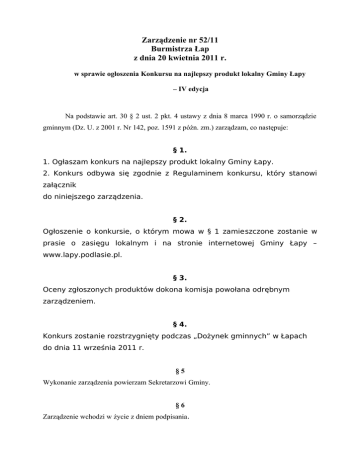 Zarządzenie nr 52/11 Burmistrza Łap z dnia 20 kwietnia 2011 r. w sprawie ogłoszenia Konkursu na najlepszy produkt lokalny Gminy Łapy – IV edycja Na podstawie art. 30 § 2 ust. 2 pkt. 4 ustawy z dnia 8 marca 1990 r. o samorządzie gminnym (Dz. U. z 2001 r. Nr 142, poz. 1591 z późn. zm.) zarządzam, co następuje: § 1. 1. Ogłaszam konkurs na najlepszy produkt lokalny Gminy Łapy. 2. Konkurs odbywa się zgodnie z Regulaminem konkursu, który stanowi załącznik do niniejszego zarządzenia. § 2. Ogłoszenie o konkursie, o którym mowa w § 1 zamieszczone zostanie w prasie o zasięgu lokalnym i na stronie internetowej Gminy Łapy – www.lapy.podlasie.pl. § 3. Oceny zgłoszonych produktów dokona komisja powołana odrębnym zarządzeniem. § 4. Konkurs zostanie rozstrzygnięty podczas „Dożynek gminnych” w Łapach do dnia 11 września 2011 r. §5 Wykonanie zarządzenia powierzam Sekretarzowi Gminy. §6 Zarządzenie wchodzi w życie z dniem podpisania. Załącznik do Zarządzenia Nr 52/11 Burmistrza Łap z dnia 20.04.2011 r. w sprawie ogłoszenia konkursu na najlepszy produkt lokalny Gminy Łapy – IV edycja Konkurs na najlepszy produkt lokalny Gminy Łapy – IV edycja W ramach IV edycji konkursu na „Najlepszy produkt lokalny Gminy Łapy 2011” wystawcy będą mogli pokazać się w trzech kategoriach: kulinaria, rękodzieło i inne. Konkurs ma uchronić przed zapomnieniem dawne tradycje wytwarzania oraz podkreślić wartość produktu lokalnego – jego unikalność i oryginalność ściśle związaną z Gminą Łapy, a także zrealizować główny cel, który dotyczy efektywnej promocji Gminy Łapy. Ubiegłoroczny konkurs odbył się podczas „Dożynek gminnych” w Bokinach. Zwycięzcom przyznano nagrody i wyróżnienia w każdej z kategorii (wyniki konkursu na stronie internetowej gminy www.lapy.podlasie.pl). W związku z dużym zainteresowaniem konkursem, zarówno ze strony zgłaszających, oglądających, jak i „smakujących”, a także widocznych efektów promocyjnych, pragniemy kontynuować kreowanie i promowanie produktu lokalnego. W tym roku, żeby ułatwić ocenę i konsultacje komisji konkursowej, najpierw odbędzie się prezentacja produktów lokalnych podczas festynu „Sobieski w Płonce”, który odbędzie się w dniu 10 lipca 2011 r., a na „Dożynkach gminnych” w Łapach nastąpi ogłoszenie wyników. REGULAMIN KONKURSU Cel konkursu Celem konkursu jest identyfikacja i wykreowanie produktów lokalnych wytwarzanych tradycyjnymi metodami na terenie Gminy Łapy, stanowiących element dziedzictwa kulinarnego i kulturowego gminy oraz tożsamości społeczności lokalnej, które będą stanowić niezwykle ważny element promocyjny Gminy Łapy. Konkurs ma za zadanie także wzmocnienie pozycji rynkowej tych produktów, wzbudzenie większego zainteresowania wśród potencjalnych konsumentów, a w rezultacie doprowadzenie do powstania rynku produktów wysokiej jakości. Pod pojęciem „produkt lokalny” rozumie się wyrób lub usługę, z którą utożsamiają się mieszkańcy regionu, produkowaną w sposób niemasowy i przyjazny dla środowiska, z surowców lokalnie dostępnych. Produkt lokalny staje się wizytówką regionu poprzez wykorzystanie jego specyficznego i niepowtarzalnego charakteru oraz angażowanie mieszkańców w rozwój przedsiębiorczości lokalnej. Efektem konkursu będzie powstanie produktów lokalnych, które będą utożsamiane z Gminą Łapy, a ich wizerunek będzie kreowany w świadomości konsumentów nie tylko z województwa podlaskiego. Laureaci konkursu będą promowani także podczas innych imprez organizowanych przez Gminę Łapy oraz zapraszani do udziału w targach. Konkurs ogłoszony zostaje w następujących dziedzinach i kategoriach: Kategoria: Kulinaria - Dania mięsne - Potrawy z ryb - Pieczywo wiejskie - Ciasta i desery - Napoje i trunki Kategoria: Rękodzieło i artystyczna twórczość lokalna - Kowalstwo artystyczne i twórczość w drewnie - Wikliniarstwo i plecionki (z traw i in. materiałów) - Haft, koronczarstwo i dziewiarstwo - Obrazy (technika różna) Kategoria: Inne - Agroturystyka, gospodarstwa wiejskie i atrakcje turystyczne - Zespoły muzyczne, wokalne i taneczne, poezja i proza, fotografia - Inne (tylko dla produktu, którego nie można przyporządkować do żadnej z powyższych kategorii) Uczestnicy Do udziału w konkursie zapraszamy osoby fizyczne, organizacje pozarządowe, nieformalne grupy (koła gospodyń wiejskich itp.), a także przedsiębiorstwa z terenu Gminy Łapy. UWAGA! Produkty, które zajęły I, II i III miejsca w I,II i III edycji konkursu „Najlepszy produkt lokalny”, są oficjalnie promowane jako produkt lokalny, w związku z tym nie mogą być zgłaszane do IV edycji konkursu. Produkty wyróżnione w poprzednich edycjach konkursu mogą ponownie brać udział w konkursie. Etapy IV edycji konkursu „Najlepszy produkt lokalny Gminy Łapy” I etap: Eliminacje konkursowe – 4 lipca 2011 r. Wprowadzenie eliminacji ma na celu zebranie deklaracji konkursowych, wstępne ich ocenienie i ewentualne uzupełnienie. Na podstawie zgłoszeń, opisów i załączników komisja wytypuje produkty, które mają potencjał stać się produktem lokalnym utożsamianym z Gminą Łapy. Propozycje należy zgłaszać od 15 maja do 4 lipca 2011 r. osobiście lub drogą mailową do Urzędu Miejskiego w Łapach, do koordynatora konkursu, Inspektora ds. promocji i rolnictwa, w pok. 110 (e-mail: [email protected]). Zgłaszany produkt należy opisać zgodnie z deklaracją załączoną do regulaminu. Do zgłoszenia należy również dołączyć załączniki, np. zdjęcie produktu, dokumenty potwierdzające tradycję wytwarzania, dokładna recepturę, czy dodatkowe wskazówki itp. W deklaracji zgłoszenia do konkursu należy podać następujące informacje o produkcie: Nazwa (historyczna, lokalna lub ludowa), Opis produktu z wyszczególnieniem jego cech charakterystycznych, Opis sposobu wytwarzania produktu, Związ