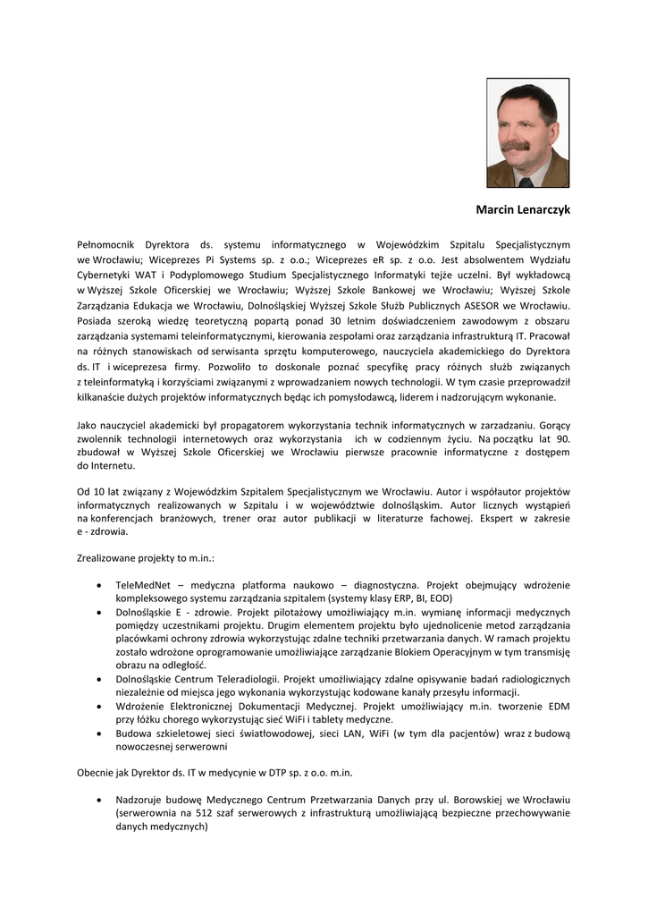 Marcin Lenarczyk Pełnomocnik Dyrektora ds. systemu informatycznego w Wojewódzkim Szpitalu Specjalistycznym we Wrocławiu; Wiceprezes Pi Systems sp. z o.o.; Wiceprezes eR sp. z o.o. Jest absolwentem Wydziału Cybernetyki WAT i Podyplomowego Studium Specjalistycznego Informatyki tejże uczelni. Był wykładowcą w Wyższej Szkole Oficerskiej we Wrocławiu; Wyższej Szkole Bankowej we Wrocławiu; Wyższej Szkole Zarządzania Edukacja we Wrocławiu, Dolnośląskiej Wyższej Szkole Służb Publicznych ASESOR we Wrocławiu. Posiada szeroką wiedzę teoretyczną popartą ponad 30 letnim doświadczeniem zawodowym z obszaru zarządzania systemami teleinformatycznymi, kierowania zespołami oraz zarządzania infrastrukturą IT. Pracował na różnych stanowiskach od serwisanta sprzętu komputerowego, nauczyciela akademickiego do Dyrektora ds. IT i wiceprezesa firmy. Pozwoliło to doskonale poznać specyfikę pracy różnych służb związanych z teleinformatyką i korzyściami związanymi z wprowadzaniem nowych technologii. W tym czasie przeprowadził kilkanaście dużych projektów informatycznych będąc ich pomysłodawcą, liderem i nadzorującym wykonanie. Jako nauczyciel akademicki był propagatorem wykorzystania technik informatycznych w zarzadzaniu. Gorący zwolennik technologii internetowych oraz wykorzystania ich w codziennym życiu. Na początku lat 90. zbudował w Wyższej Szkole Oficerskiej we Wrocławiu pierwsze pracownie informatyczne z dostępem do Internetu. Od 10 lat związany z Wojewódzkim Szpitalem Specjalistycznym we Wrocławiu. Autor i współautor projektów informatycznych realizowanych w Szpitalu i w województwie dolnośląskim. Autor licznych wystąpień na konferencjach branżowych, trener oraz autor publikacji w literaturze fachowej. Ekspert w zakresie e - zdrowia. Zrealizowane projekty to m.in.: TeleMedNet – medyczna platforma naukowo – diagnostyczna. Projekt obejmujący wdrożenie kompleksowego systemu zarządzania szpitalem (systemy klasy ERP, BI, EOD) Dolnośląskie E - zdrowie. Projekt pilotażowy umożliwiający m.in. wymianę informacji medycznych pomiędzy uczestnikami projektu. Drugim elementem projektu było ujednolicenie metod zarządzania placówkami ochrony zdrowia wykorzystując zdalne techniki przetwarzania danych. W ramach projektu zostało wdrożone oprogramowanie umożliwiające zarządzanie Blokiem Operacyjnym w tym transmisję obrazu na odległość. Dolnośląskie Centrum Teleradiologii. Projekt umożliwiający zdalne opisywanie badań radiologicznych niezależnie od miejsca jego wykonania wykorzystując kodowane kanały przesyłu informacji. Wdrożenie Elektronicznej Dokumentacji Medycznej. Projekt umożliwiający m.in. tworzenie EDM przy łóżku chorego wykorzystując sieć WiFi i tablety medyczne. Budowa szkieletowej sieci światłowodowej, sieci LAN, WiFi (w tym dla pacjentów) wraz z budową nowoczesnej serwerowni Obecnie jak Dyrektor ds. IT w medycynie w DTP sp. z o.o. m.in. Nadzoruje budowę Medycznego Centrum Przetwarzania Danych przy ul. Borowskiej we Wrocławiu (serwerownia na 512 szaf serwerowych z infrastrukturą umożliwiającą bezpieczne przechowywanie danych medycznych) Opiniuje i konsultuje projekty Systemu Informacji Medycznej w województwie podkarpackim, małopolskim, dolnośląskim, lubuskim i mazowieckim. Nagrody i wyróżnienia: Nagrody resortowe Ministra Obrony Narodowej Złoty Skalpel (Puls Medycyny) – 2010 za innowacyjne projekty w dziedzinie medycyny oraz za wykorzystanie urządzeń mobilnych to tworzenia EDM Lider Informatyki (Computerworld) – 2010 za w kategorii innowacje za utworzenie DCT Lider Informatyki (Computerworld) – 2013 w kategorii Ochrona Zdrowia Dobrzykowice, 09.06.2014 W związku z wejściem w życie Ustawy o ochronie danych osobowych z dnia 29.08.97 (Dz.U. 133, poz. 833/1997) oświadczam, że wyrażam zgodę na przetwarzanie moich danych osobowych do celów konkursowych. Jednocześnie informuję, że zdaję sobie sprawę z przysługującego mi prawa uaktualniania uzupełniania, a nawet usunięcia danych ze zbioru oraz możliwości wglądu do przesłanych przeze mnie dokumentów. Swoje dane osobowe udostępniam dobrowolnie.