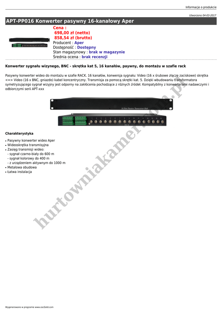 Informacje o produkcie Utworzono 04-03-2017 APT-PP016 Konwerter pasywny 16-kanałowy Aper Cena : 698,00 zł (netto) 858,54 zł (brutto) Producent : Aper Dostępność : Dostępny Stan magazynowy : brak w magazynie Średnia ocena : brak recenzji Konwerter sygnału wizynego, BNC - skrętka kat 5, 16 kanałów, paywny, do montażu w szafie rack er .c om .p l Pasywny konwerter wideo do montażu w szafie RACK. 16 kanałów, konwersja sygnału: Video (16 x śrubowe złącze zaciskowe) skrętka <=> Video (16 x BNC, gniazdo) kabel koncentryczny. Transmisja za pomocą skrętki kat. 5. Dzięki wbudowaniu transformatora symetryzującego sygnał wizyjny jest odporny na zakłócenia pochodzące z różnych źródeł. Kompatybilny z konwerterami nadawczymi i odbiorczymi serii APT-xxx ● ● ● ● hu rt ow ● Pasywny konwerter wideo Aper Wideoskrętka transmisyjna Zasięg transmisji wideo: - sygnał czarno-biały do 600 m - sygnał kolorowy do 400 m - z urządzeniem aktywnym do 1000 m Metalowa obudowa Łatwa instalacja ni ak am Charakterystyka Wygenerowano w programie www.oscGold.com .p l er .c om ni ak am Specyfikacja: ow Wejścia Wyjścia Typ kabla transmisyjnego hu Warunki pracy Wymiary (szer. x wys. x dł.) Obudowa rt Zasięg transmisji 16 x Video (BNC) 1 V p-p, 75 Ω, koncentryczne 16 x Video (śrubowe zaciskowe) (+/-), skrętka Skrętka kat. 5, UTP (24 AWG) 600 m sygnał monochromatyczny 400 m sygnał kolorowy 1000 m z urządzeniem aktywnym Od -20°C do 70°C 482 x 105 x 44 mm (1U) Metalowa obudowa z uchwytem do montażu w szafie RACK 19" Katalog/Cennik: Akcesoria firmy Aper – Transmisja po skrętce TRANSMISJA PO SKRĘTCE Konwertery wideo - pasywne Informacje o produkcie Konwerter sygnału wizynego, BNC - skrętka kat 5. Pasywny. Ograniczenie przeciwprzepięciowe. Współpraca z rejestertorami APER. kod produktu APT-P101C1 cena netto 19,00 APT-P101C2 Konwerter sygnału wizynego, BNC - skrętka kat 5. Pasywny. Ograniczenie przeciwprzepięciowe. Na przewodzie. 20,00 APT-P111VLH Konwerter sygnału wizynego, BNC - skrętka kat 5. Pasywny. Filtr przeciwzakłóceniowy. 55,00 APT-P111VTS Konwerter sygnału wizynego, BNC - skrętka kat 5. Pasywny, zabezpieczenie przeciwprzepięciowe, uziemienie. 55,00 Konwerter sygnału wizynego, BNC na skrętkę kat 5, 4 kanały, pasywny. APT-P414V .p l Konwerter sygnału wizynego, BNC - skrętka kat 5, 16 kanałów, paywny, do montażu w szafie rack. APT-PP016 Konwertery wideo - aktywne Konwerter nadawczy sygnału wizynego, BNC na skrętkę, aktywny. Zabezpieczenie przeciwprzepięciowe, uziemienie. er .c om kod produktu APT-A111VT 129,00 799,00 cena netto 149,00 Konwerter wideo, Odbiornik, aktywny, koncentryk (BNC) / skrętka (złącze śrubowe), zasilanie 12VDC, zabezpieczenie przeciwprzepięciowe, regulacja 149,00 APT-A101AT Konwerter wideo, Nadajnik, aktywny, koncentryk (BNC) / skrętka (złącze śrubowe), zasilanie 12VDC, zabezpieczenie przeciwprzepięciowe, regulacja 149,00 APT-PA008 Konwerter odbiorczy sygnału wizynego, BNC - skrętka kat 5, 8 kanałów, aktywny, z regulacją. Zabezpieczenie przeciwprzepięciowe, uziemienie, do montażu w szafie rack. 1 299,00 APT-PA016 Konwerter odbiorczy sygnału wizynego, BNC na skrętkę, 16 kanałów, aktywny, z regulacją. Zabezpieczenie przeciwprzepięciowe, uziemienie, do montażu w szafie rack. 2 299,00 APT-A111VH Konwertert odbiorczy sygnału wizynego, BNC - skrętka kat 5, aktywny, z zaawansowaną regulacją. Zabezpieczenie przeciwprzepięciowe, uziemienie. 299,00 Rozdzielacze wideo APD-CD816A hu APD-CD1632A Rozgałęziacz wideo, aktywny, 1 wejście, 4 wyjścia. APD-CD1664 cena netto 159,00 Rozgałęziacz wideo, aktywny, 8 - kanałowy. 8x (1 wejście / 2 wyjścia BNC), do montażu w szafie rack. 699,00 Rozgałęziacz wideo, aktywny, 16 - kanałowy. 16x (1 wejście / 2 wyjścia BNC), do montażu w szafie rack. 1 269,00 Rozgałęziacz wideo, aktywny, 16 - kanałowy. 16x (1 wejście / 4 wyjścia BNC), do montażu w szafie rack. 1 999,00 rt kod produktu APD-CD104 ow ni ak am APT-A101AR Transmisja VGA kod produktu APE-A111VGA Zestaw nadawczo - odbiorczy konwerterów VGA(D-SUB) - skrętka kat 5 (RJ45). Aktywny, regulowany. Zasięg do 300 m (UXGA). cena netto 599,00 Przedłużacz (konwerter) VGA, pasywny VGA / skrętka cat 5(RJ-45), zasięg do 75m, rozdzielczość do 1024x768. 299,00 Odbiornik aktywny APE-A801VGA-R i nadajnik APE-A801VGA-T przedłużacz VGA + audio , VGA / skrętka (RJ-45). Zasięg do 300 m. APE-A801VGA-R, APE-A801VGA-T Rozdzielczość maksymalna 1600*1200, 350MHz. Wbudowane zabezpieczenie antyprzepieciowe. Zasilanie 12V (osobno). 939,00 APE-P801VGA Transmisja sterowania RS-485 kod produktu APC-RS001 APR-RS001R Wygenerowano w programie www.oscGold.com Konwerter telemetrii RS232 na RS-485, zasilany ze złącza DB9 (RS-232). Regenarator (repeater) telemetrii RS-485. Złącza zaciskowe, zasilanie 10 - 20 VDC. cena netto 59,00 299,0 APD-RS004 Rozdzielacz / konwerter telemetrii, 1x RS-232, 5x RS-485. Izolacja napięciowa, zabezpieczenie, zasilanie 12 VDC. 369,00 APD-RS016 Rozdzielacz / konwerter telemetrii, 1x RS-232, 16x RS-485. Izolacja napięciowa, zabezpieczenie, zasilanie 12 VDC. 699,00 kod produktu APP-P001 Ogranicznik przepięć dla sygnału wizyjnego. Wejście i wyjście BNC (gniazdo/wtyk). Przewód uziemiający. cena netto 59,00 APP-P006 Ogranicznik przepięć do 4kV dla sygnałów przesyłanych skrętką cat 5, Ethernetu. Złącza RJ45. 259,00 ZABEZPIECZENIA WIDEO Ograniczniki wideo Ogranicznik przepięć do 4kV dla PoE. Zgodny z normą 802.3af. Złącza RJ45. APP-P006P 259,00 Ogranicznik przepięć Ethernet (RJ-45), z uziemieniem. Zgodny ze standardem IEC61643-21:2000. 339,00 APP-P016C Ogranicznik przepięć dla sygnału wizyjnego, 16-kanałowy, BNC. Uziemienie, do montażu w szafie rack. 899,00 kod produktu API-1201XP Separator wideo o wysokim stopniu izolacji, BNC / BNC, izolacja do 800V, zabezpieczenie przeciwprzepięciowe. cena netto 59,00 API-1301XP Separator wideo o wysokim stopniu izolacj