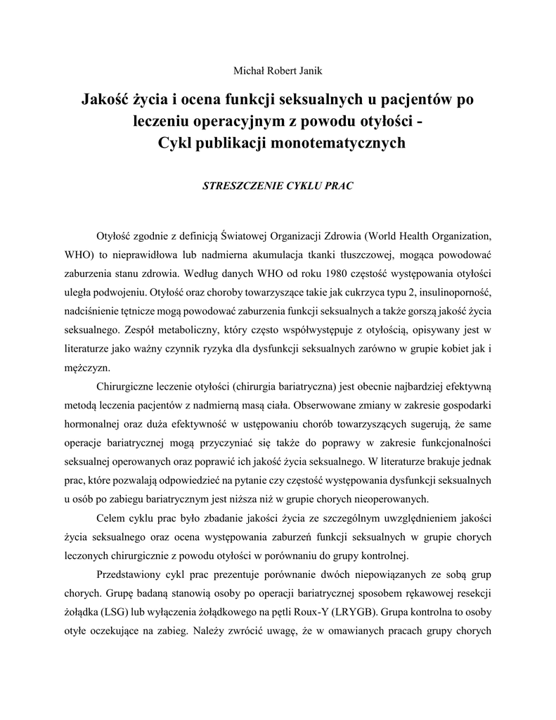 Michał Robert Janik Jakość życia i ocena funkcji seksualnych u pacjentów po leczeniu operacyjnym z powodu otyłości Cykl publikacji monotematycznych STRESZCZENIE CYKLU PRAC Otyłość zgodnie z definicją Światowej Organizacji Zdrowia (World Health Organization, WHO) to nieprawidłowa lub nadmierna akumulacja tkanki tłuszczowej, mogąca powodować zaburzenia stanu zdrowia. Według danych WHO od roku 1980 częstość występowania otyłości uległa podwojeniu. Otyłość oraz choroby towarzyszące takie jak cukrzyca typu 2, insulinoporność, nadciśnienie tętnicze mogą powodować zaburzenia funkcji seksualnych a także gorszą jakość życia seksualnego. Zespół metaboliczny, który często współwystępuje z otyłością, opisywany jest w literaturze jako ważny czynnik ryzyka dla dysfunkcji seksualnych zarówno w grupie kobiet jak i mężczyzn. Chirurgiczne leczenie otyłości (chirurgia bariatryczna) jest obecnie najbardziej efektywną metodą leczenia pacjentów z nadmierną masą ciała. Obserwowane zmiany w zakresie gospodarki hormonalnej oraz duża efektywność w ustępowaniu chorób towarzyszących sugerują, że same operacje bariatrycznej mogą przyczyniać się także do poprawy w zakresie funkcjonalności seksualnej operowanych oraz poprawić ich jakość życia seksualnego. W literaturze brakuje jednak prac, które pozwalają odpowiedzieć na pytanie czy częstość występowania dysfunkcji seksualnych u osób po zabiegu bariatrycznym jest niższa niż w grupie chorych nieoperowanych. Celem cyklu prac było zbadanie jakości życia ze szczególnym uwzględnieniem jakości życia seksualnego oraz ocena występowania zaburzeń funkcji seksualnych w grupie chorych leczonych chirurgicznie z powodu otyłości w porównaniu do grupy kontrolnej. Przedstawiony cykl prac prezentuje porównanie dwóch niepowiązanych ze sobą grup chorych. Grupę badaną stanowią osoby po operacji bariatrycznej sposobem rękawowej resekcji żołądka (LSG) lub wyłączenia żołądkowego na pętli Roux-Y (LRYGB). Grupa kontrolna to osoby otyłe oczekujące na zabieg. Należy zwrócić uwagę, że w omawianych pracach grupy chorych różniły się od siebie w zakresie średniej masy ciała. Dodatkowo przeprowadzona analiza zmiany masy ciała w grupie pacjentów operowanych na przestrzeni czasu wykazała, istotny spadek masy ciała wyrażony jako zmiana BMI (delta BMI) oraz całkowita utrata masy ciała (%TWL). Co więcej obie techniki chirurgiczne okazały się być tak samo efektywne w zakresie deltaBMI oraz %TWL. Oznacza to, że w przypadku obu technik chirurgicznych uzyskiwano porównywalny efekt kliniczny w zakresie utraty masy ciała. Świadczy to o dużej skuteczności chirurgicznego leczenia otyłości. Prezentowane prace wykazały lepszą jakość życia oraz jakość życia seksualnego u osób po operacji. Jest to dowód na polepszenie jakości życia po chirurgicznym leczeniu otyłości. W procesie tym zasadniczy jest sam fakt poddania się operacji oraz związana z tym utrata masy ciała. Jednak stopień utraty masy ciała, mierzony ilością utraconych kilogramów, nie koreluje z jakością życia. Jest to potwierdzenie tego, że w procesie leczenia bariatrycznego nie jest najważniejsza liczba utraconych kilogramów a ogólny efekt operacji, na który składa między innymi ustępowanie chorób towarzyszących otyłości, związana z tym redukcja stosowanych leków oraz poprawa funkcjonowania w społeczeństwie. Po uwzględnieniu rodzajów operacji, wynik jakości życia nie różnił się istotnie statycznie pomiędzy grupami. Należy przez to rozumieć, że rodzaj techniki chirurgicznej (restrykcyjna versus restrykcyjno-wyłączająca) nie ma wpływu na jakość życia w grupie chorych bariatrycznych. Nowością jest zdeterminowanie czynników, które są związane z wyższym poziomem jakości życia u pacjentów z otyłością. Te czynniki to: młodszy wiek, męska płeć, brak partnera oraz fakt poddania się leczeniu bariatrycznemu. Biorąc pod uwagę jakość życia seksualnego osób po operacji bariatrycznej wykazano, że zarówno u mężczyzn jaki i kobiet obserwuje się lepszą jakości życia seksualnego w stosunku do grupy kontrolnej. W przypadku kobiet lepsza jakość życia seksualnego wydaje się mieć podłoże psychologiczne. Co ciekawe nie zaobserwowano istotnych różnic w częstości występowania zaburzeń funkcji seksualnych pomiędzy kobietami po chirurgicznym leczeniu otyłości w porównaniu do pacjentek oczekujących na operację. W grupie mężczyzn poza poprawą jakości życia stwierdzono rzadsze występowanie zaburzeń erekcji co świadczy o poprawie funkcjonalności seksualnej. Wyniki te są istotne przez co omawiane prace stanowią ważne pozycje w literaturze bariatrycznej. Publikacje wchodzące w skład zaprezentowanego cyklu prac były omawiane a także komentowane na łamach międzynarodowych czasopism medycznych co świadczy o unikatowości przeprowadzonych badań. Wnioski: 1. Lepsza jakość życia oraz jakość życia seksualnego w grupie osób po operacji bariatrycznej stanowi dodatkową zaletę chirurgicznego leczenia otyłości. 2. Rodzaj operacji (LSG versus LRYGB) nie ma wpływu na jakość życia u osób po leczeniu bariatrycznym. 3. Liczba utraconych kilogramów nie koreluje z lepszą jakością życia. 4. U kobiet po operacji bariatrycznej nie stwierdza się istotnych różnic w występowaniu zaburzeń funkcji seksualnych. 5. U mężczyzn po operacji obserwuje się istotnie niższy odsetek zaburzeń erekcji.