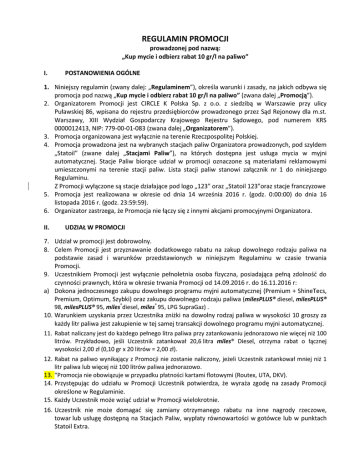 REGULAMIN PROMOCJI prowadzonej pod nazwą: „Kup mycie i odbierz rabat 10 gr/l na paliwo” I. POSTANOWIENIA OGÓLNE 1. Niniejszy regulamin (zwany dalej: „Regulaminem”), określa warunki i zasady, na jakich odbywa się promocja pod nazwą „Kup mycie i odbierz rabat 10 gr/l na paliwo” (zwana dalej „Promocją”). 2. Organizatorem Promocji jest CIRCLE K Polska Sp. z o.o. z siedzibą w Warszawie przy ulicy Puławskiej 86, wpisana do rejestru przedsiębiorców prowadzonego przez Sąd Rejonowy dla m.st. Warszawy, XIII Wydział Gospodarczy Krajowego Rejestru Sądowego, pod numerem KRS 0000012413, NIP: 779-00-01-083 (zwana dalej „Organizatorem”). 3. Promocja organizowana jest wyłącznie na terenie Rzeczpospolitej Polskiej. 4. Promocja prowadzona jest na wybranych stacjach paliw Organizatora prowadzonych, pod szyldem „Statoil” (zwane dalej „Stacjami Paliw”), na których dostępna jest usługa mycia w myjni automatycznej. Stacje Paliw biorące udział w promocji oznaczone są materiałami reklamowymi umieszczonymi na terenie stacji paliw. Lista stacji paliw stanowi załącznik nr 1 do niniejszego Regulaminu. Z Promocji wyłączone są stacje działające pod logo „123” oraz „Statoil 123”oraz stacje franczyzowe 5. Promocja jest realizowana w okresie od dnia 14 września 2016 r. (godz. 0:00:00) do dnia 16 listopada 2016 r. (godz. 23:59:59). 6. Organizator zastrzega, że Promocja nie łączy się z innymi akcjami promocyjnymi Organizatora. II. UDZIAŁ W PROMOCJI 7. Udział w promocji jest dobrowolny. 8. Celem Promocji jest przyznawanie dodatkowego rabatu na zakup dowolnego rodzaju paliwa na podstawie zasad i warunków przedstawionych w niniejszym Regulaminu w czasie trwania Promocji. 9. Uczestnikiem Promocji jest wyłącznie pełnoletnia osoba fizyczna, posiadająca pełną zdolność do czynności prawnych, która w okresie trwania Promocji od 14.09.2016 r. do 16.11.2016 r: a) Dokona jednoczesnego zakupu dowolnego programu myjni automatycznej (Premium + ShineTecs, Premium, Optimum, Szybki) oraz zakupu dowolnego rodzaju paliwa (milesPLUS® diesel, milesPLUS® 98, milesPLUS® 95, miles®diesel, miles® 95, LPG SupraGaz) . 10. Warunkiem uzyskania przez Uczestnika zniżki na dowolny rodzaj paliwa w wysokości 10 groszy za każdy litr paliwa jest zakupienie w tej samej transakcji dowolnego programu myjni automatycznej. 11. Rabat naliczany jest do każdego pełnego litra paliwa przy zatankowaniu jednorazowo nie więcej niż 100 litrów. Przykładowo, jeśli Uczestnik zatankował 20,6 litra miles® Diesel, otrzyma rabat o łącznej wysokości 2,00 zł (0,10 gr x 20 litrów = 2,00 zł). 12. Rabat na paliwo wynikający z Promocji nie zostanie naliczony, jeżeli Uczestnik zatankował mniej niż 1 litr paliwa lub więcej niż 100 litrów paliwa jednorazowo. 13. “Promocja nie obowiązuje w przypadku płatności kartami flotowymi (Routex, UTA, DKV). 14. Przystępując do udziału w Promocji Uczestnik potwierdza, że wyraża zgodę na zasady Promocji określone w Regulaminie. 15. Każdy Uczestnik może wziąć udział w Promocji wielokrotnie. 16. Uczestnik nie może domagać się zamiany otrzymanego rabatu na inne nagrody rzeczowe, towar lub usługę dostępną na Stacjach Paliw, wypłaty równowartości w gotówce lub w punktach Statoil Extra. III. REKLAMACJE 17. Reklamacje związane z przeprowadzeniem Promocji można przesyłać listem poleconym na adres Organizatora: CIRCLE K Polska Sp. z o.o., ul. Puławska 86, 02-603 Warszawa, z dopiskiem na kopercie „Rabat na paliwo przy zakupie mycia” w okresie trwania Promocji oraz w okresie 30 dni od dnia jej zakończenia (liczy się data stempla pocztowego). 18. Zgłoszenie reklamacji powinno zawierać dokładny opis reklamacji oraz dane Uczestnika niezbędne do udzielenia mu odpowiedzi. Dane osobowe udostępniane przez Uczestników w związku ze zgłoszeniem reklamacji wykorzystywane będą przez Organizatora wyłącznie w celu rozpatrzenia i odpowiedzi na reklamację, a po zakończeniu procedury reklamacyjnej dane zostaną usunięte przez Organizatora. 19. Reklamacje będą rozpatrywane przez Organizatora w terminie 30 dni kalendarzowych od daty ich otrzymania. Organizator rozpatrując reklamację stosować będzie postanowienia niniejszego Regulaminu. O decyzji Organizatora Uczestnik zostanie powiadomiony e-mailem (o ile będzie podany) albo listem zwykłym (decyduje data stempla pocztowego albo data umieszczenia oświadczenia Organizatora do środka komunikacji elektronicznej zgodnie z art. 61 § 2 Kodeksu Cywilnego). IV. POSTANOWIENIA KOŃCOWE 20. Organizator zastrzega sobie możliwość dokonywania w każdym czasie zmian w postanowieniach niniejszego Regulaminu, w szczególności z przyczyn techniczno-organizacyjnych, przy czym zmiana ta nie może w jakikolwiek sposób naruszać praw już nabytych przez Uczestników Promocji. Zmiany Regulaminu zostaną ogłoszone na stronie internetowej www.statoil.pl oraz będą dostępne w siedzibie Organizatora oraz na stacjach Paliw w terminie co najmniej 7 dni kalendarzowych przed ich wejściem w życie. 21. Materiały reklamowo-promocyjne związane z Promocją mają jedynie charakter informacyjny. Wiążącą moc prawną mają wyłącznie postanowienia niniejszego Regulaminu. 22. Wszelkie spory i roszczenia związane z Promocją podlegają rozstrzygnięciu przez właściwe sądy powszechne. 23. Promocja, której warunki zostały określone w niniejszym Regulaminie, nie jest grą losową, loterią fantową, zakładem wzajemnym ani loterią promocyjną, których wynik zależy od przypadku, w rozumieniu art. 2 Ustawy z dnia 19 listopada 2009 r. o grach hazardowych (Dz. U. z 2009 r. nr 201, poz. 1540 ze zm.). 24. Regulamin Promocji, jest dostępny przez czas trwania Promocji, począwszy od dnia jej rozpoczęcia, na stronie internetowej www.statoil.pl, w siedzibie Organizatora oraz na Stacjach Paliw. 25. W sprawach nieuregulowanych w niniejszym Regulaminie zastosowanie znajdują przepisy ust