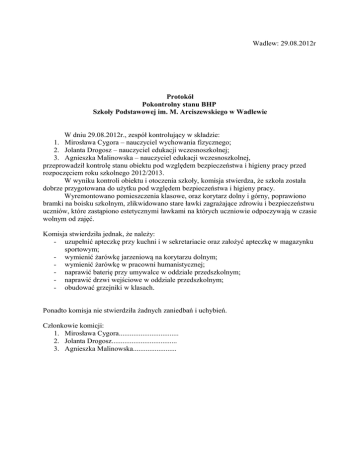 Wadlew: 29.08.2012r Protokół Pokontrolny stanu BHP Szkoły