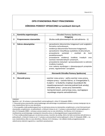 Załącznik Nr 1 OPIS STANOWISKA PRACY PRACOWNIKA OŚRODKA POMOCY SPOŁECZNEJ w Łaziskach Górnych 1 Komórka organizacyjna 2 Proponowane stanowisko 3 Zakres obowiązków 4 Przełożeni 5 Warunki pracy Ośrodek Pomocy Społecznej Księgowy (liczba osób planowanych do zatrudnienia - 1) sprawdzanie dokumentów księgowych pod względem formalno-rachunkowym, ewidencja dokumentów finansowo-księgowych, sprawdzanie i klasyfikacja wydatków strukturalnych, prowadzenie syntetyki i analityki do kont pozabilansowych, prowadzenie ewidencji środków trwałych oraz wartości niematerialnych i prawnych, prowadzenie statystyki i sprawozdawczości w zakresie środków trwałych, inne zadania wynikające z obowiązujących przepisów prawa, regulaminów i zarządzeń. Kierownik Ośrodka Pomocy Społecznej - wymiar czasu pracy – pełny wymiar czasu pracy, - miejsce pracy – Łaziska Górne, ul. Energetyków 5, (I piętro – w budynku znajduje się podjazd dla niepełnosprawnych niemniej jednak brak windy), - charakter pracy – praca przy stanowisku komputerowym, pod presją czasu, wymagająca wysokiego stopnia samodzielności. UWAGA! Zgodnie z art. 16 ustawy o pracownikach samorządowych z dnia 21 listopada 2008 r.: 1. Stosunek pracy pracownika samorządowego zatrudnionego na podstawie umowy o pracę nawiązuje się na czas nieokreślony lub na czas określony. 2. W przypadku osób podejmujących po raz pierwszy pracę na stanowisku urzędniczym, w tym kierowniczym stanowisku urzędniczym, w jednostkach, o których mowa w art. 2 ustawy o pracownikach samorządowych z dnia 21 listopada 2008 r. umowę o pracę zawiera się na czas określony, nie dłuższy niż 6 miesięcy, z możliwością wcześniejszego rozwiązania stosunku pracy za dwutygodniowym wypowiedzeniem. 3. Przez osobę podejmującą po raz pierwszy pracę, rozumie się osobę, która nie była wcześniej zatrudniona w jednostkach, o których mowa w art. 2 ustawy o pracownikach samorządowych z dnia 21 listopada 2008 r., na czas nieokreślony albo na czas określony, dłuższy niż 6 miesięcy, i nie odbyła służby przygotowawczej zakończonej zdaniem egzaminu z wynikiem pozytywnym.
