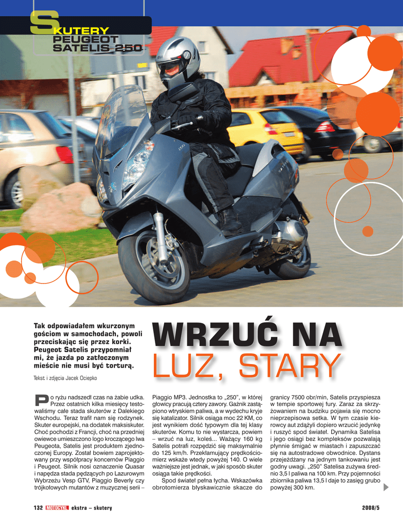 S KUTERY PEUGEOT SATELIS 250 Tak odpowiadałem wkurzonym gościom w samochodach, powoli przeciskając się przez korki. Peugeot Satelis przypomniał mi, że jazda po zatłoczonym mieście nie musi być torturą. Tekst i zdjęcia Jacek Ociepko P o ryżu nadszedł czas na żabie udka. Przez ostatnich kilka miesięcy testowaliśmy całe stada skuterów z Dalekiego Wschodu. Teraz trafił nam się rodzynek. Skuter europejski, na dodatek maksiskuter. Choć pochodzi z Francji, choć na przedniej owiewce umieszczono logo kroczącego lwa Peugeota, Satelis jest produktem zjednoczonej Europy. Został bowiem zaprojektowany przy współpracy koncernów Piaggio i Peugeot. Silnik nosi oznaczenie Quasar i napędza stada pędzących po Lazurowym Wybrzeżu Vesp GTV, Piaggio Beverly czy trójkołowych mutantów z muzycznej serii – 132 ekstra – skutery WRZUĆ NA LUZ, STARY Piaggio MP3. Jednostka to „250”, w której głowicy pracują cztery zawory zawory. Gaźnik zastąpiono wtryskiem paliwa, a w wydechu kryje się katalizator. Silnik osiąga moc 22 KM, co jest wynikiem dość typowym dla tej klasy skuterów. Komu to nie wystarcza, powiem – wrzuć na luz, koleś... Ważący 160 kg Satelis potrafi rozpędzić się maksymalnie do 125 km/h. Przekłamujący prędkościomierz wskaże wtedy powyżej 140. O wiele ważniejsze jest jednak, w jaki sposób skuter osiąga takie prędkości. Spod świateł pełna łycha. Wskazówka obrotomierza błyskawicznie skacze do granicy 7500 obr/min, Satelis przyspiesza w tempie sportowej fury fury. Zaraz za skrzyżowaniem na budziku pojawia się mocno nieprzepisowa setka. W tym czasie kierowcy aut zdążyli dopiero wrzucić jedynkę i ruszyć spod świateł. Dynamika Satelisa i jego osiągi bez kompleksów pozwalają płynnie śmigać w miastach i zapuszczać się na autostradowe obwodnice. Dystans przejeżdżany na jednym tankowaniu jest godny uwagi. „250” Satelisa zużywa średnio 3,5 l paliwa na 100 km. Przy pojemności zbiornika paliwa 13,5 l daje to zasięg grubo powyżej 300 km. 2008/5 z BFS, czyli bardzo fajny schowek pośrodku kierownicy. Pomieści okulary albo komórkę. x Niesymetryczna przednia felga Satelisa. 134 ekstra – skutery W parze z osiągami Satelisa idą hamulce. Zdecydowano cy się na użycie w nich elementów w jjapońskiego Nissina. W ładnej i asymetrycznej etry przedniej feldze osadzono j jedną ttarczę o sporej średnicy 260 mm. Z tylu klasyka: tarcza o średnicy 226 mm w połączeniu z pływającym zaciskiem. Ja jeździłem podstawową wersją Premium. Kto zdecyduje się na zakup najbogatszej, Executive, w układzie hamulcowym znajdzie systemy ABS i PBS. Satelis hamuje skutecznie, choć wymaga silnej ręki. Przód jest dość precyzyjny. Ze względu na konieczność użycia dużej siły, tylny hamulec będą krytykowały dziewczyny. Skoro o nich mowa, nie można zapomnieć o jednym drobiazgu: Satelisa wyposażono w dwie podstawki – boczną i centralną. Ponieważ zatankowany i załadowany zakupami skuter waży prawie 200 kg, postawienie go na centralną podstawkę powinno być dla nich zadaniem nie do wykonania. Nic z tych rzeczy! Wystarczy delikatnie nacisnąć na specjalny występ, by Satelis stanął na dwóch łapach. Inni mogą się uczyć od Peugeota. Kto będzie dojeżdżał Peugeotem do pracy, doceni, że w schowku zmieści się laptop i spore zakupy albo upchnięte ciasno dwa integrale. Bajer, na którego widok szczęki przechodniów na bank uderzą o chodnik, polega na tym, że po mocniejszym przekręceniu kluczyka (za pozycję – włączony zapłon) kanapa pasażera wraz z tylną częścią owiewek uniesie się, odsłaniając dostęp do bagażnika. Tak na wszelki wypadek, by nie robić z siebie głupka i nie jeździć z otwartym siedzeniem, gubiąc po drodze rzeczy, w kokpicie pojawiła się kontrolka otwartego bagażnika. Przypadłością Satelisa jest brak podświetlenia schowka, a wadą testowanego egzemplarza – nieprecyzyjnie działający zamek pokrywy. By ją zamknąć, często trzeba było trzasnąć mocno jak klapą od śmietnika. Do wad trzeba też zaliczyć bardzo miękką i szybko rysującą się szybę. Na szczęście wady Peugeota nie przesłaniają jego zalet. A wśród tych drugich nie wolno zapomnieć o zawieszeniach. Z przodu pracuje widelec teleskopowy o średnicy goleni 37 mm. Z tyłu zamontowano dwa amortyzatory, z regulacją twardości sprężyny. Zawieszenia Peugeota są dosyć twarde i pozwalają jak po sznurku prowadzić skuter. Podczas jazdy w dwie osoby i z pełnym obciążeniem nie było mowy o dobijaniu. Nieco gorzej wygląda sytuacja przy wjechaniu na dziurawe ulice. Skuter nerwowo reaguje na wzdłużne rowki, takie jak łączenie dwóch rodzajów asfaltów. Satelisa zbudowano w tej części Europy, gdzie nawierzchnie są o wiele lepsze. Kolesie w Peugeocie mają łeb na karku i dobrze wiedzą, że dobry skuter to taki, w którym jest sporo łatwo dostępnych schowków. Pierwszy z nich mamy w nietypowym miejscu, bo na środku kierownicy. Zamyka go srebrna klapka i zmieszczą się w nim okulary lub portfel. Naprzeciw lewego kolana znalazł miejsce potężny schowek zamykany na kluczyk. Jest on tak ogromny, że komórka ginie w jego otchłani jak kamień wrzucony do studni. O wiele sensowniej będzie zapakować tam płaszcz przeciwdeszczowy lub rękawice. Trzeci ze schowków wygospodarowano w przedniej części kanapy. Sądząc po rozmiarach, zmieści się w nim paczka fajek oraz zapalniczka. I chyba nic więcej. Minus c Sezamie, otwórz się – bagażnik pod kanapą. Minus za brak podświetlenia schowka. x Quasar to silnik napędzający między ędzy innymi włoskie skutery Vespa i Piaggio.. 2008/5 c Wygodna kanapa, sporo miejsca dla jeźdźca i pasażera, znakomite wykonanie – oto najkrótszy opis Peugeota Satelisa. jest taki, że nie jest on ani zamykany, ani też wodoszczelny. Peugeot Satelis jest duży, wygodny, ma agresywną, nowoczesną stylistykę. Kto lubi krągłości, będzie zawi