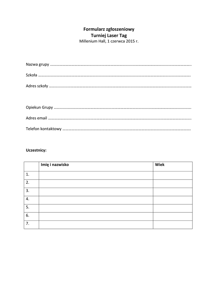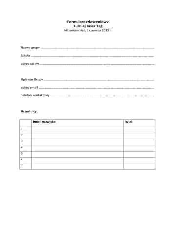 Formularz zgłoszeniowy Turniej Laser Tag Millenium Hall, 1 czerwca 2015 r. Nazwa grupy ………………………………………………………………………………………………………………………….. Szkoła ……………………………………………………………………………………………………………………………………. Adres szkoły …………………………………………………………………………………………………………………………… Opiekun Grupy ………………………………………………………………………………………………………………………. Adres email ……………………………………………………………………………………………………………………………. Telefon kontaktowy ………………………………………………………………………………………………………………. Uczestnicy: Imię i nazwisko 1. 2. 3. 4. 5. 6. 7. Wiek