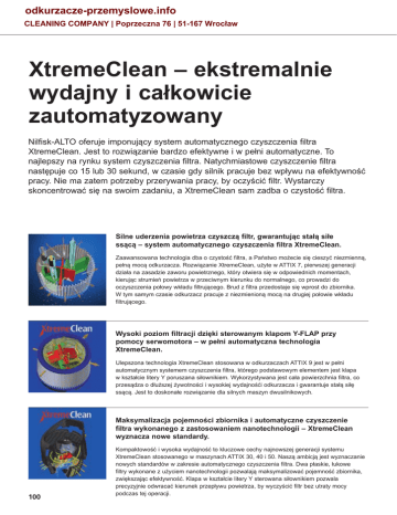 odkurzacze-przemyslowe.info CLEANING COMPANY | Poprzeczna 76 | 51-167 Wrocław XtremeClean – ekstremalnie wydajny i całkowicie zautomatyzowany Nilfisk-ALTO oferuje imponujący system automatycznego czyszczenia filtra XtremeClean. Jest to rozwiązanie bardzo efektywne i w pełni automatyczne. To najlepszy na rynku system czyszczenia filtra. Natychmiastowe czyszczenie filtra następuje co 15 lub 30 sekund, w czasie gdy silnik pracuje bez wpływu na efektywność pracy. Nie ma zatem potrzeby przerywania pracy, by oczyścić filtr. Wystarczy skoncentrować się na swoim zadaniu, a XtremeClean sam zadba o czystość filtra. Silne uderzenia powietrza czyszczą filtr, gwarantując stałą siłe ssącą – system automatycznego czyszczenia filtra XtremeClean. Zaawansowana technologia dba o czystość filtra, a Państwo możecie się cieszyć niezmienną, pełną mocą odkurzacza. Rozwiązanie XtremeClean, użyte w ATTIX 7, pierwszej generacji działa na zasadzie zaworu powietrznego, który otwiera się w odpowiednich momentach, kierując strumień powietrza w przeciwnym kierunku do normalnego, co prowadzi do oczyszczenia połowy wkładu filtrującego. Brud z filtra przedostaje się wprost do zbiornika. W tym samym czasie odkurzacz pracuje z niezmienioną mocą na drugiej połowie wkładu filtrującego. Wysoki poziom filtracji dzięki sterowanym klapom Y-FLAP przy pomocy serwomotora – w pełni automatyczna technologia XtremeClean. Ulepszona technologia XtremeClean stosowana w odkurzaczach ATTIX 9 jest w pełni automatycznym systemem czyszczenia filtra, którego podstawowym elementem jest klapa w kształcie litery Y poruszana siłownikiem. Wykorzystywana jest cała powierzchnia filtra, co przesądza o dłuższej żywotności i wysokiej wydajnośći odkurzacza i gwarantuje stałą siłę ssącą. Jest to doskonałe rozwiązanie dla silnych maszyn dwusilnikowych. Maksymalizacja pojemności zbiornika i automatyczne czyszczenie filtra wykonanego z zastosowaniem nanotechnologii – XtremeClean wyznacza nowe standardy. 100 Kompaktowość i wysoka wydajność to kluczowe cechy najnowszej generacji systemu XtremeClean stosowanego w maszynach ATTIX 30, 40 i 50. Naszą ambicją jest wyznaczanie nowych standardów w zakresie automatycznego czyszczenia filtra. Dwa płaskie, łukowe filtry wykonane z użyciem nanotechnologii pozwalają maksymalizować pojemność zbiornika, zwiększając efektywność. Klapa w kształcie litery Y sterowana siłownikiem pozwala precyzyjnie odwracać kierunek przepływu powietrza, by wyczyścić filtr bez utraty mocy podczas tej operacji. odkurzacze-przemyslowe.info CLEANING COMPANY | Poprzeczna 76 | 51-167 Wrocław Funkcje - zaprojektowane, aby spełnić potrzeby naszych klientów ! Nilfisk-ALTO oferuje pełną gamę innowacyjnych i mocnych odkurzaczy sucho-mokro - wszystkie zaprojektowane, aby spełnić nie tylko najbardziej wymagające oczekiwania w zakresie profesjonalnego czyszczenia ale również pasujące do Twoich konkretnych wymagań w zakresie mocy ssania, niskiego poziomu hałasu, wysokiej wydajności i automatycznego lub półautomatycznego czyszczenia filtra. MultiFit System MultiFit Nilfisk-ALTO sprawia, że łatwo podłączyć jedno z wielu akcesoriów, które umożliwią wykonywanie różnorodnych prac. Koncepcja MultiFit oznacza, że możemy z łatwością wykorzystać akcesoria Nilfisk-ALTO bez względu na to czy korzystamy w danym momencie z węża ssącego o średnicy 27, 32, 36, 38 czy 50 mm. W większości odkurzaczy złącze MultiFit ma właściwości antystatyczne, co sprawia, że można korzystać ze zwykłego lub antystatycznego węża ssącego. Zalety: • mnogość zastosowań • łatwe rozwiązanie każdego problemu ze względu na łatwość w doborze akcesoriów • łatwo dostosować średnicę węża do rodzaju zbieranego pyłu AntiStatic - system zapobiegający wyładowaniom elektrostatycznym Szybkość z jaką porusza się pył i tarcie o ścianki węża powodują gromadzenie się elektryczności statycznej. Wyładowania elektrostatyczne są nie tylko nieprzyjemne dla użytkownika, mogą nawet spowodować zapalenie pyłów wybuchowych. Akcesoria antystatyczne Nilfisk-ALTO są uziemione. Sprawia to, że cała elektryczność statyczna zostaje niepostrzeżenie rozładowana i nie następuje jej gromadzenie. Nieprzyjemne wyładowania elektrostatyczne czy iskrzenie nie występują przy stosowaniu akcesoriów antystatycznych Nilfisk-ALTO. Przetestowane i niezawodne akcesoria (R≤ 1MQ) są niezbędne do odkurzaczy z linii TYPE 22. Zalety: • brak niebezpiecznych iskier w wężu ssącym • brak nieprzyjemnych dla użytkownika wyładowań elektrostatycznych • uziemiony wąż ssący przeciwdziała osadzaniu się brudu na ściankach Auto OnOff z kontrolą prędkości Wyposażone w system Auto OnOff oraz regulację obrotów odkurzacze Nilfisk-ALTO znakomicie sprawdzają się we współpracy z narzędziami elektrycznymi i pneumatycznymi (konieczne zastosowanie AirBoxa). Poprzez podłączenie narzędzia do odkurzacza, cały pył jest szybko i skutecznie usuwany prosto z miejsca, w którym powstaje.Narzędzie elektryczne lub pneumatyczne steruje pracą odkurzacza, który włącza się zaraz po włączeniu narzędzia i wyłącza wraz z wyłączeniem narzędzia. Funkcja Auto OnOff dba o to by wąż ssący został do końca opróżniony z resztek pyłu. Poza tym użytkownik ma do dyspozycji płynną regulację obrotów, która umożliwia dostosowanie mocy odkurzacza do specyfiki określonego zadania. Zalety: • płynna regulacja siły ssącej umożliwia wykonywanie różnych prac • niski poziom hałasu i zmniejszone zużycie energii, gdy nie potrzeba pełnej mocy odkurzacza • regulowana siła ssania zapobiega przysysaniu się niektórych zastosowanych narzędzi 102 odkurzacze-przemyslowe.info CLEANING COMPANY | Poprzeczna 76 | 51-167 Wrocław System SoftStart System SoftStart dba o płynne uruchomienie silnika co jest ważne, gdy podłączamy odk