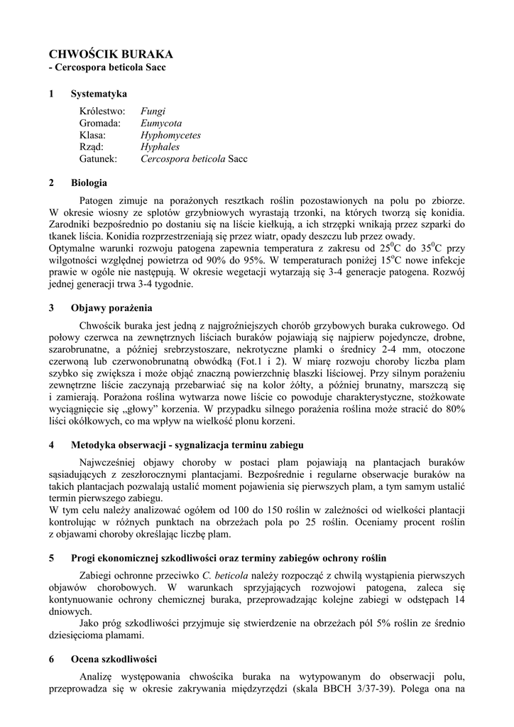 CHWOŚCIK BURAKA - Cercospora beticola Sacc 1 Systematyka Królestwo: Gromada: Klasa: Rząd: Gatunek: 2 Fungi Eumycota Hyphomycetes Hyphales Cercospora beticola Sacc Biologia Patogen zimuje na porażonych resztkach roślin pozostawionych na polu po zbiorze. W okresie wiosny ze splotów grzybniowych wyrastają trzonki, na których tworzą się konidia. Zarodniki bezpośrednio po dostaniu się na liście kiełkują, a ich strzępki wnikają przez szparki do tkanek liścia. Konidia rozprzestrzeniają się przez wiatr, opady deszczu lub przez owady. Optymalne warunki rozwoju patogena zapewnia temperatura z zakresu od 250C do 350C przy wilgotności względnej powietrza od 90% do 95%. W temperaturach poniżej 15oC nowe infekcje prawie w ogóle nie następują. W okresie wegetacji wytarzają się 3-4 generacje patogena. Rozwój jednej generacji trwa 3-4 tygodnie. 3 Objawy porażenia Chwościk buraka jest jedną z najgroźniejszych chorób grzybowych buraka cukrowego. Od połowy czerwca na zewnętrznych liściach buraków pojawiają się najpierw pojedyncze, drobne, szarobrunatne, a później srebrzystoszare, nekrotyczne plamki o średnicy 2-4 mm, otoczone czerwoną lub czerwonobrunatną obwódką (Fot.1 i 2). W miarę rozwoju choroby liczba plam szybko się zwiększa i może objąć znaczną powierzchnię blaszki liściowej. Przy silnym porażeniu zewnętrzne liście zaczynają przebarwiać się na kolor żółty, a później brunatny, marszczą się i zamierają. Porażona roślina wytwarza nowe liście co powoduje charakterystyczne, stożkowate wyciągnięcie się „głowy” korzenia. W przypadku silnego porażenia roślina może stracić do 80% liści okółkowych, co ma wpływ na wielkość plonu korzeni. 4 Metodyka obserwacji - sygnalizacja terminu zabiegu Najwcześniej objawy choroby w postaci plam pojawiają na plantacjach buraków sąsiadujących z zeszłorocznymi plantacjami. Bezpośrednie i regularne obserwacje buraków na takich plantacjach pozwalają ustalić moment pojawienia się pierwszych plam, a tym samym ustalić termin pierwszego zabiegu. W tym celu należy analizować ogółem od 100 do 150 roślin w zależności od wielkości plantacji kontrolując w różnych punktach na obrzeżach pola po 25 roślin. Oceniamy procent roślin z objawami choroby określając liczbę plam. 5 Progi ekonomicznej szkodliwości oraz terminy zabiegów ochrony roślin Zabiegi ochronne przeciwko C. beticola należy rozpocząć z chwilą wystąpienia pierwszych objawów chorobowych. W warunkach sprzyjających rozwojowi patogena, zaleca się kontynuowanie ochrony chemicznej buraka, przeprowadzając kolejne zabiegi w odstępach 14 dniowych. Jako próg szkodliwości przyjmuje się stwierdzenie na obrzeżach pól 5% roślin ze średnio dziesięcioma plamami. 6 Ocena szkodliwości Analizę występowania chwościka buraka na wytypowanym do obserwacji polu, przeprowadza się w okresie zakrywania międzyrzędzi (skala BBCH 3/37-39). Polega ona na przeprowadzeniu oceny zdrowotności w zależności od wielkości plantacji analizując od 100 do 150 roślin buraka pobranych losowo w różnych punktach pola po 25 sztuk. Na plantacjach powyżej 2 ha należy zwiększyć liczbę punktów o 1 na każdy następny hektar. Oprócz ogólnej oceny liczby roślin porażonych należy sklasyfikować nasilenie porażenia wg trzystopniowej skali (Ryc.1): – słabe: plamy chwościka zajmują do 10% powierzchni asymilacyjnej liści na roślinie, – średnie: plamy chwościka zajmują od 10 do 25% powierzchni asymilacyjnej liści na roślinie – silne: plamy chwościka zajmują powyżej 25% powierzchni asymilacyjnej liści na roślinie, liście stopniowo żółkną, brunatnieją i zamierają. Fot. 1. Objawy chwościka buraka Ryc.1. Skala stopni nasilenia porażenia liści przez chwościka buraka Fot. 2. Objawy chwościka buraka (zbliżenie)