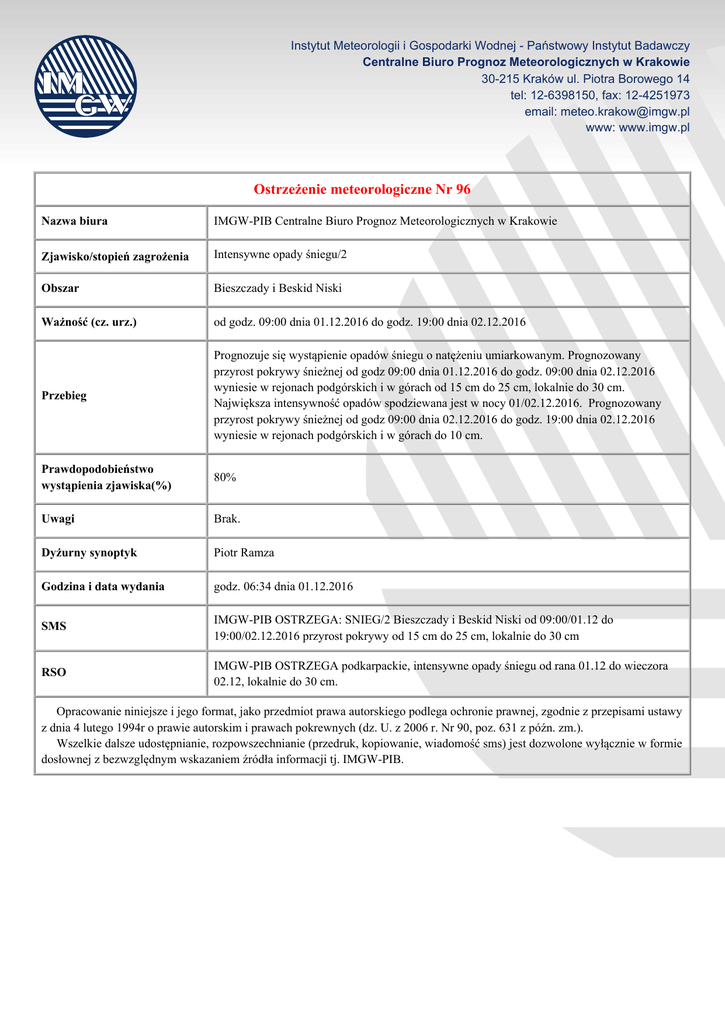 Instytut Meteorologii i Gospodarki Wodnej - Państwowy Instytut Badawczy Centralne Biuro Prognoz Meteorologicznych w Krakowie 30-215 Kraków ul. Piotra Borowego 14 tel: 12-6398150, fax: 12-4251973 email: [email protected] www: www.imgw.pl Ostrzeżenie meteorologiczne Nr 96 Nazwa biura IMGW-PIB Centralne Biuro Prognoz Meteorologicznych w Krakowie Zjawisko/stopień zagrożenia Intensywne opady śniegu/2 Obszar Bieszczady i Beskid Niski Ważność (cz. urz.) od godz. 09:00 dnia 01.12.2016 do godz. 19:00 dnia 02.12.2016 Przebieg Prognozuje się wystąpienie opadów śniegu o natężeniu umiarkowanym. Prognozowany przyrost pokrywy śnieżnej od godz 09:00 dnia 01.12.2016 do godz. 09:00 dnia 02.12.2016 wyniesie w rejonach podgórskich i w górach od 15 cm do 25 cm, lokalnie do 30 cm. Największa intensywność opadów spodziewana jest w nocy 01/02.12.2016. Prognozowany przyrost pokrywy śnieżnej od godz 09:00 dnia 02.12.2016 do godz. 19:00 dnia 02.12.2016 wyniesie w rejonach podgórskich i w górach do 10 cm. Prawdopodobieństwo wystąpienia zjawiska(%) 80% Uwagi Brak. Dyżurny synoptyk Piotr Ramza Godzina i data wydania godz. 06:34 dnia 01.12.2016 SMS IMGW-PIB OSTRZEGA: SNIEG/2 Bieszczady i Beskid Niski od 09:00/01.12 do 19:00/02.12.2016 przyrost pokrywy od 15 cm do 25 cm, lokalnie do 30 cm RSO IMGW-PIB OSTRZEGA podkarpackie, intensywne opady śniegu od rana 01.12 do wieczora 02.12, lokalnie do 30 cm. Opracowanie niniejsze i jego format, jako przedmiot prawa autorskiego podlega ochronie prawnej, zgodnie z przepisami ustawy z dnia 4 lutego 1994r o prawie autorskim i prawach pokrewnych (dz. U. z 2006 r. Nr 90, poz. 631 z późn. zm.). Wszelkie dalsze udostępnianie, rozpowszechnianie (przedruk, kopiowanie, wiadomość sms) jest dozwolone wyłącznie w formie dosłownej z bezwzględnym wskazaniem źródła informacji tj. IMGW-PIB.