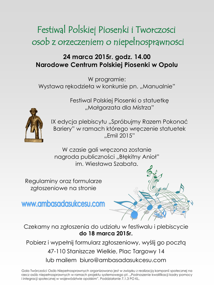 24 marca 2015r. godz. 14.00 Narodowe Centrum Polskiej Piosenki w Opolu W programie: Wystawa rękodzieła w konkursie pn. „Manualnie” Festiwal Polskiej Piosenki o statuetkę „Małgorzata dla Mistrza” IX edycja plebiscytu „Spróbujmy Razem Pokonać Bariery” w ramach którego wręczenie statuetek „Emil 2015” W czasie gali wręczona zostanie nagroda publiczności „Błękitny Anioł” im. Wiesława Szabata. Regulaminy oraz formularze zgłoszeniowe na stronie Czekamy na zgłoszenia do udziału w festiwalu i plebiscycie do 18 marca 2015r. Pobierz i wypełnij formularz zgłoszeniowy, wyślij go pocztą 47-110 Staniszcze Wielkie, Plac Targowy 14 lub mailem [email protected] Gala Twórczości Osób Niepełnosprawnych organizowana jest w związku z realizacją kampanii społecznej na rzecz osób niepełnosprawnych w ramach projektu systemowego pt. „Podnoszenie kwalifikacji kadry pomocy i integracji społecznej w województwie opolskim”. Poddziałanie 7.1.3 PO KL.