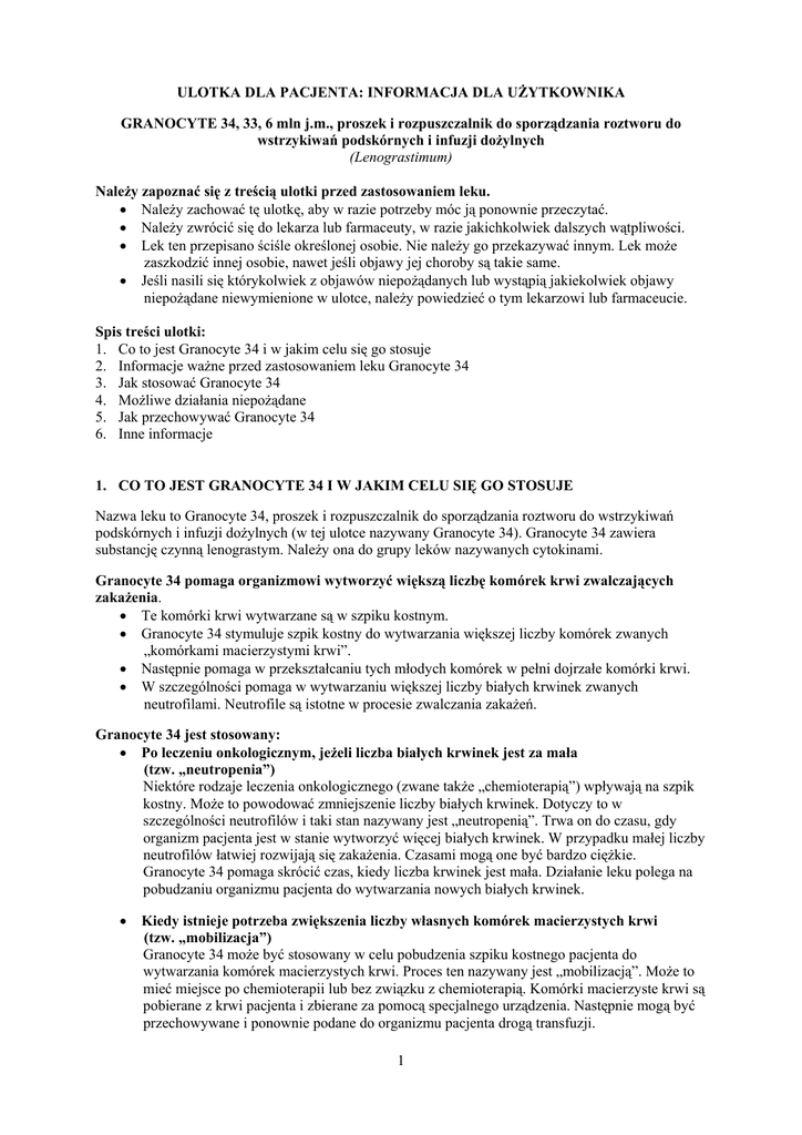 ULOTKA DLA PACJENTA: INFORMACJA DLA UŻYTKOWNIKA GRANOCYTE 34, 33, 6 mln j.m., proszek i rozpuszczalnik do sporządzania roztworu do wstrzykiwań podskórnych i infuzji dożylnych (Lenograstimum) Należy zapoznać się z treścią ulotki przed zastosowaniem leku. Należy zachować tę ulotkę, aby w razie potrzeby móc ją ponownie przeczytać. Należy zwrócić się do lekarza lub farmaceuty, w razie jakichkolwiek dalszych wątpliwości. Lek ten przepisano ściśle określonej osobie. Nie należy go przekazywać innym. Lek może zaszkodzić innej osobie, nawet jeśli objawy jej choroby są takie same. Jeśli nasili się którykolwiek z objawów niepożądanych lub wystąpią jakiekolwiek objawy niepożądane niewymienione w ulotce, należy powiedzieć o tym lekarzowi lub farmaceucie. Spis treści ulotki: 1. Co to jest Granocyte 34 i w jakim celu się go stosuje 2. Informacje ważne przed zastosowaniem leku Granocyte 34 3. Jak stosować Granocyte 34 4. Możliwe działania niepożądane 5. Jak przechowywać Granocyte 34 6. Inne informacje 1. CO TO JEST GRANOCYTE 34 I W JAKIM CELU SIĘ GO STOSUJE Nazwa leku to Granocyte 34, proszek i rozpuszczalnik do sporządzania roztworu do wstrzykiwań podskórnych i infuzji dożylnych (w tej ulotce nazywany Granocyte 34). Granocyte 34 zawiera substancję czynną lenograstym. Należy ona do grupy leków nazywanych cytokinami. Granocyte 34 pomaga organizmowi wytworzyć większą liczbę komórek krwi zwalczających zakażenia. Te komórki krwi wytwarzane są w szpiku kostnym. Granocyte 34 stymuluje szpik kostny do wytwarzania większej liczby komórek zwanych „komórkami macierzystymi krwi”. Następnie pomaga w przekształcaniu tych młodych komórek w pełni dojrzałe komórki krwi. W szczególności pomaga w wytwarzaniu większej liczby białych krwinek zwanych neutrofilami. Neutrofile są istotne w procesie zwalczania zakażeń. Granocyte 34 jest stosowany: Po leczeniu onkologicznym, jeżeli liczba białych krwinek jest za mała (tzw. „neutropenia”) Niektóre rodzaje leczenia onkologicznego (zwane także „chemioterapią”) wpływają na szpik kostny. Może to powodować zmniejszenie liczby białych krwinek. Dotyczy to w szczególności neutrofilów i taki stan nazywany jest „neutropenią”. Trwa on do czasu, gdy organizm pacjenta jest w stanie wytworzyć więcej białych krwinek. W przypadku małej liczby neutrofilów łatwiej rozwijają się zakażenia. Czasami mogą one być bardzo ciężkie. Granocyte 34 pomaga skrócić czas, kiedy liczba krwinek jest mała. Działanie leku polega na pobudzaniu organizmu pacjenta do wytwarzania nowych białych krwinek. Kiedy istnieje potrzeba zwiększenia liczby własnych komórek macierzystych krwi (tzw. „mobilizacja”) Granocyte 34 może być stosowany w celu pobudzenia szpiku kostnego pacjenta do wytwarzania komórek macierzystych krwi. Proces ten nazywany jest „mobilizacją”. Może to mieć miejsce po chemioterapii lub bez związku z chemioterapią. Komórki macierzyste krwi są pobierane z krwi pacjenta i zbierane za pomocą specjalnego urządzenia. Następnie mogą być przechowywane i ponownie podane do organizmu pacjenta drogą transfuzji. 1 Po przeszczepieniu szpiku kostnego lub komórek macierzystych krwi Przed przeszczepieniem szpiku kostnego lub komórek macierzystych krwi u pacjenta stosuje się silną chemioterapię lub napromienianie całego ciała. Celem tych procedur jest zniszczenie chorych komórek. Następnie przeszczepiany szpik kostny lub komórki macierzyste krwi są podawane pacjentowi w postaci transfuzji krwi. Potrzeba czasu, aby nowy szpik kostny zaczął wytwarzać nowe komórki krwi (w tym białe krwinki). Granocyte 34 pomaga organizmowi pacjenta przyspieszyć proces odnawiania nowych białych krwinek. W przypadku podjęcia decyzji przez pacjenta o zostaniu dawcą komórek macierzystych krwi Granocyte 34 może być również stosowany u zdrowych dawców. W takim przypadku lek stymuluje szpik kostny do wytwarzania dodatkowych komórek macierzystych krwi. Proces ten nazywa się mobilizacją – patrz wyżej. Zdrowi dawcy mogą następnie oddać swoje komórki macierzyste krwi osobie, która ich potrzebuje. 2. INFORMACJE WAŻNE PRZED ZASTOSOWANIEM LEKU GRANOCYTE 34 Kiedy nie stosować leku Granocyte 34 Jeśli pacjent ma uczulenie (nadwrażliwość) na lenograstym lub którykolwiek z pozostałych składników leku Granocyte 34 (wymienionych w punkcie 6 poniżej). Objawami reakcji uczuleniowej są: wysypka, trudności w połykaniu lub oddychaniu, obrzęk warg, twarzy, gardła lub języka. Jeśli pacjent ma chorobę zwaną „fenyloketonurią”. Jeśli pacjent ma rodzaj nowotworu zwany „nowotworem szpiku”. Granocyte 34 można jednak stosować u pacjentów z niedawno zdiagnozowaną ostrą białaczką szpikową w niektórych przypadkach, jeśli pacjent ma ponad 55 lat. Jeśli pacjent przyjmuje chemioterapię przeciwnowotworową w tym samym dniu. Nie należy stosować leku, jeżeli którekolwiek z powyższych okoliczności dotyczą pacjenta. W razie wątpliwości należy skonsultować się z lekarzem lub farmaceutą przed zastosowaniem leku Granocyte 34. Kiedy zachować szczególną ostrożność stosując Granocyte 34 Należy skonsultować się z lekarzem lub farmaceutą przed zastosowaniem leku, jeśli pacjent: Miał kiedykolwiek w przeszłości jakiekolwiek choroby, szczególnie uczulenia, zakażenia, problemy z nerkami lub wątrobą. W razie wątpliwości czy powyższe okoliczności dotyczą pacjenta, należy skonsultować się z lekarzem lub farmaceutą przed zastosowaniem leku Granocyte 34. Stosowanie innych leków Należy powiedzieć lekarzowi o wszystkich przyjmowanych aktualnie lub ostatnio lekach, również tych, które wydawane są bez recepty, w tym lekach ziołowych. Osoby, które podjęły decyzję o zostaniu dawcą komórek macierzystych krwi i przyjmują leki przeciwzakrzepowe (takie jak warfaryna lub heparyna), powinny powiedzieć o tym lekarzowi prze