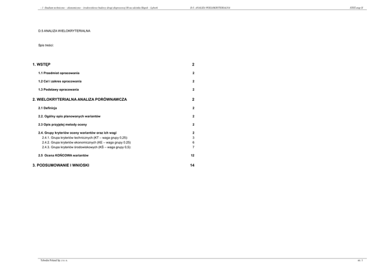 - 1 -Studium techniczno – ekonomiczno – środowiskowe budowy drogi ekspresowej S6 na odcinku Słupsk – Lębork D.5. ANALIZA WIELOKRYTERIALNA STEŚ etap II D.5 ANALIZA WIELOKRYTERIALNA Spis treści: 1. WSTĘP 2 1.1 Przedmiot opracowania 2 1.2 Cel i zakres opracowania 2 1.3 Podstawy opracowania 2 2. WIELOKRYTERIALNA ANALIZA PORÓWNAWCZA 2 2.1 Definicja 2 2.2. Ogólny opis planowanych wariantów 2 2.3 Opis przyjętej metody oceny 2 2.4. Grupy kryteriów oceny wariantów oraz ich wagi 2 2.4.1. Grupa kryteriów technicznych (KT – waga grupy 0,25): 3 2.4.2. Grupa kryteriów ekonomicznych (KE – waga grupy 0.25) 6 2.4.3. Grupa kryteriów środowiskowych (KŚ – waga grupy 0,5): 7 2.5 Ocena KOŃCOWA wariantów 12 3. PODSUMOWANIE I WNIOSKI 14 Tebodin Poland Sp. z o. o. str. 1 - 2 -Studium techniczno – ekonomiczno – środowiskowe budowy drogi ekspresowej S6 na odcinku Słupsk – Lębork STEŚ etap II D.5. ANALIZA WIELOKRYTERIALNA 1. Wstęp 1.1 PRZEDMIOT OPRACOWANIA Przedmiotem niniejszego opracowania jest przeprowadzenie wielokryterialnej analizy porównawczej trzech planowanych wariantów oraz jednego podwariantu przebiegu trasy ekspresowej S6 na odcinku Słupsk-Lębork. określoną wagę. Z kolei wyznaczono kryteria szczegółowe. Każdemu kryterium przyznano punkty od 1 do 5, które następnie przemnożono przez współczynnik ważności kryterium w danej podgrupie (od 0 do 1). Przy przyznawaniu punktacji przyjęto następującą zasadę: 5 pkt – przyznawano wariantowi, który osiągnął najkorzystniejszy wynik w danej kategorii, 3 pkt – wariantowi kolejnemu pod względem osiągniętego wyniku, 1 pkt – pozostałym dwóm wariantom. W nielicznych przypadkach, gdy były duże rozbieżności pomiędzy wariantami,przyznawano punktację pośrednią. W przypadku nieznacznych różnic pomiędzy wariantami przyznawano im podobną ilość punktów. 1.2 CEL I ZAKRES OPRACOWANIA Celem niniejszego opracowania jest wybór optymalnego wariantu przebiegu trasy ekspresowej S6 spośród czterech możliwych do realizacji rozwiązań. Wybór dokonany zostanie na podstawie przyjętych kryteriów, które mogą w znaczący sposób wpłynąć na realizację i funkcjonowanie danego wariantu. 1.3 PODSTAWY OPRACOWANIA Podstawą opracowania dokumentacji projektowej budowy drogi ekspresowej nr 6 na odcinku Słupsk-Lębork jest umowa nr 102/P-2/2009 z dnia 17 czerwca 2009 r. zawarta pomiędzy Generalną Dyrekcją Dróg Krajowych i Autostrad Oddział w Gdańsku, 80-354 Gdańsk, ul Subisława 5, a firmą Tebodin SAP-Projekt Sp. z o.o. (obecnie Tebodin Poland Sp. z o.o.), 02-695 Warszawa ul. Taśmowa 7. 2. Wielokryterialna Analiza Porównawcza 2.1 DEFINICJA Analiza wielokryterialna to matematyczna metoda wspomagająca proces decyzyjny. Wykorzystywana jest do oceny i wyboru optymalnego rozwiązania spośród analizowanych alternatywnych wariantów/projektów/działań, charakteryzujących się wielowymiarowymi efektami, na podstawie kryteriów, które trudno ze sobą bezpośrednio porównać. Co więcej, analiza wielokryterialna pomaga w ocenie przedsięwzięć z różnych punktów widzenia. W szczególności umożliwia uwzględnienie w procesie oceny kryteriów niemożliwych do analizowania stricte finansowego lub ekonomicznego. Do takich kryteriów należą np. czynniki związane z ochroną środowiska, równością szans, sprawiedliwością społeczną (social equity) itp. W fazie przygotowywania projektów infrastrukturalnych (drogowych) Ramowa Wielokryterialna Analiza Porównawcza zgodnie z zapisami „…przeprowadzana jest, aby umożliwić uszeregowanie wariantów przebiegu trasy, od najkorzystniejszego do najmniej korzystnego według przyjętych kryteriów, w wyniku czego można wskazać wariant priorytetowy, najbardziej wskazany do dalszego opracowania. …” (Wg. Stadia i skład dokumentacji projektowej dla dróg i mostów w fazie przygotowania zadań.) 2.2. OGÓLNY OPIS PLANOWANYCH WARIANTÓW Projektowane 4 warianty przebiegu drogi ekspresowej S6 zostały poddane analizie na całej długości opracowania od Słupska do Lęborka. Warianty niebieski, zielony i czerwony mają różne przebiegi, które pokrywają się tylko na krótkich odcinkach. Podwariant niebieski powstał z połączenia rozwiązań wariantu niebieskiego (z którym pokrywa się na większej części długości) oraz wariantu czerwonego. Szczegółowy opis wariantów został zawarty w rozdziale „6.3.Przebieg projektowanych wariantów trasy” w tomie A.1 Część Ogólna. 2.3 OPIS PRZYJĘTEJ METODY OCENY W celu należytej oceny wariantów przyjęto grupy kryteriów, które powinny zostać uwzględnione w analizie. Każdej grupie kryteriów przypisano wagę tj. współczynnik ważności danej grupy w porównaniu do pozostałych grup (wartość od 0 do 1). Następnie w każdej grupie wyznaczono podgrupy, którym również przypisano Tebodin Poland Sp. z o. o. Sumę tak uzyskanych punktów w danej grupie mnożono przez współczynnik ważności grupy, co pozwoliło uzyskać punkty dla całej grupy kryteriów. Średnia arytmetyczna z punktów obliczonych dla poszczególnych grup daje ostateczną punktację dla danego wariantu. Za wariant najkorzystniejszy (o najmniejszej sumarycznej ilości generowanych konfliktów) uważa się wariant, który otrzymał największą liczbę punktów i odpowiednio wariant najmniej korzystny (o największej sumarycznej ilości generowanych konfliktów) to ten, który zebrał najmniejszą liczbę punktów. Powyżej przedstawiony algorytm został zobrazowany na diagramie poniżej. Przygotowując dane do analizy wielokryterialnej założono, że istnieje duże prawdopodobieństwo, że wariant najdłuższy będzie generował więcej konfliktów niż wariant krótszy. Celem zredukowania tego ryzyka wprowadzono współczynnik korygujący i w analizie posłużono się wartościami względnymi. Wyjątek od zasady stanowi grupa kryteriów ekonomicznych, co zostanie opisane w dalszej części opracowania. Spr