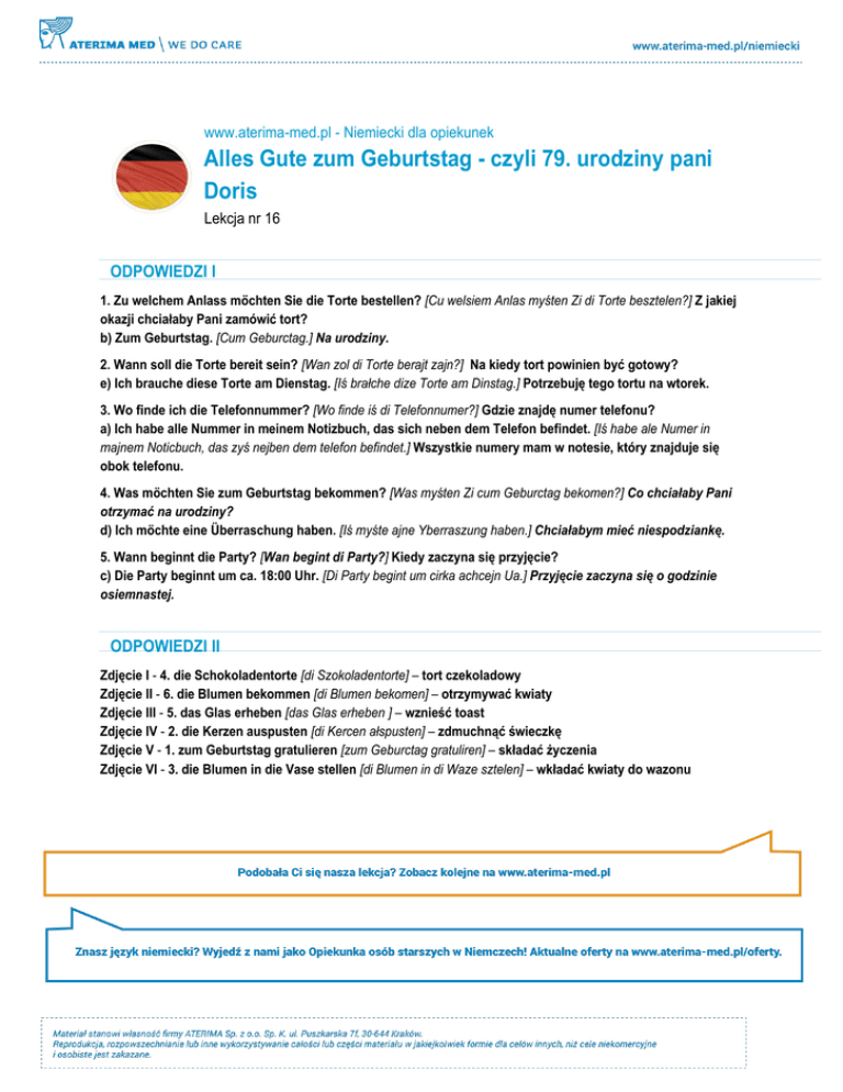 www.aterima-med.pl - Niemiecki dla opiekunek Alles Gute zum Geburtstag - czyli 79. urodziny pani Doris Lekcja nr 16 ODPOWIEDZI I 1. Zu welchem Anlass möchten Sie die Torte bestellen? [Cu welsiem Anlas myśten Zi di Torte besztelen?] Z jakiej okazji chciałaby Pani zamówić tort? b) Zum Geburtstag. [Cum Geburctag.] Na urodziny. 2. Wann soll die Torte bereit sein? [Wan zol di Torte berajt zajn?] Na kiedy tort powinien być gotowy? e) Ich brauche diese Torte am Dienstag. [Iś brałche dize Torte am Dinstag.] Potrzebuję tego tortu na wtorek. 3. Wo finde ich die Telefonnummer? [Wo finde iś di Telefonnumer?] Gdzie znajdę numer telefonu? a) Ich habe alle Nummer in meinem Notizbuch, das sich neben dem Telefon befindet. [Iś habe ale Numer in majnem Noticbuch, das zyś nejben dem telefon befindet.] Wszystkie numery mam w notesie, który znajduje się obok telefonu. 4. Was möchten Sie zum Geburtstag bekommen? [Was myśten Zi cum Geburctag bekomen?] Co chciałaby Pani otrzymać na urodziny? d) Ich möchte eine Überraschung haben. [Iś myśte ajne Yberraszung haben.] Chciałabym mieć niespodziankę. 5. Wann beginnt die Party? [Wan begint di Party?] Kiedy zaczyna się przyjęcie? c) Die Party beginnt um ca. 18:00 Uhr. [Di Party begint um cirka achcejn Ua.] Przyjęcie zaczyna się o godzinie osiemnastej. ODPOWIEDZI II Zdjęcie I - 4. die Schokoladentorte [di Szokoladentorte] – tort czekoladowy Zdjęcie II - 6. die Blumen bekommen [di Blumen bekomen] – otrzymywać kwiaty Zdjęcie III - 5. das Glas erheben [das Glas erheben ] – wznieść toast Zdjęcie IV - 2. die Kerzen auspusten [di Kercen ałspusten] – zdmuchnąć świeczkę Zdjęcie V - 1. zum Geburtstag gratulieren [zum Geburctag gratuliren] – składać życzenia Zdjęcie VI - 3. die Blumen in die Vase stellen [di Blumen in di Waze sztelen] – wkładać kwiaty do wazonu