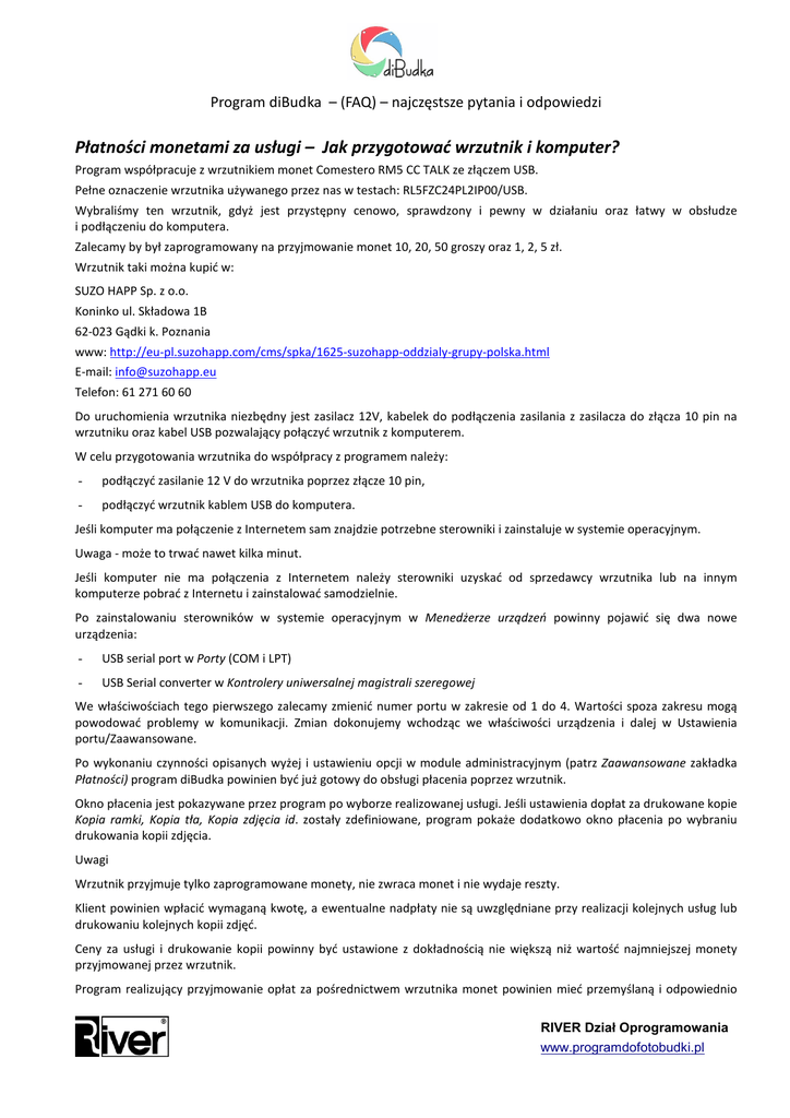 Program diBudka – (FAQ) – najczęstsze pytania i odpowiedzi Płatności monetami za usługi – Jak przygotować wrzutnik i komputer? Program współpracuje z wrzutnikiem monet Comestero RM5 CC TALK ze złączem USB. Pełne oznaczenie wrzutnika używanego przez nas w testach: RL5FZC24PL2IP00/USB. Wybraliśmy ten wrzutnik, gdyż jest przystępny cenowo, sprawdzony i pewny w działaniu oraz łatwy w obsłudze i podłączeniu do komputera. Zalecamy by był zaprogramowany na przyjmowanie monet 10, 20, 50 groszy oraz 1, 2, 5 zł. Wrzutnik taki można kupić w: SUZO HAPP Sp. z o.o. Koninko ul. Składowa 1B 62-023 Gądki k. Poznania www: http://eu-pl.suzohapp.com/cms/spka/1625-suzohapp-oddzialy-grupy-polska.html E-mail: [email protected] Telefon: 61 271 60 60 Do uruchomienia wrzutnika niezbędny jest zasilacz 12V, kabelek do podłączenia zasilania z zasilacza do złącza 10 pin na wrzutniku oraz kabel USB pozwalający połączyć wrzutnik z komputerem. W celu przygotowania wrzutnika do współpracy z programem należy: - podłączyć zasilanie 12 V do wrzutnika poprzez złącze 10 pin, - podłączyć wrzutnik kablem USB do komputera. Jeśli komputer ma połączenie z Internetem sam znajdzie potrzebne sterowniki i zainstaluje w systemie operacyjnym. Uwaga - może to trwać nawet kilka minut. Jeśli komputer nie ma połączenia z Internetem należy sterowniki uzyskać od sprzedawcy wrzutnika lub na innym komputerze pobrać z Internetu i zainstalować samodzielnie. Po zainstalowaniu sterowników w systemie operacyjnym w Menedżerze urządzeń powinny pojawić się dwa nowe urządzenia: - USB serial port w Porty (COM i LPT) - USB Serial converter w Kontrolery uniwersalnej magistrali szeregowej We właściwościach tego pierwszego zalecamy zmienić numer portu w zakresie od 1 do 4. Wartości spoza zakresu mogą powodować problemy w komunikacji. Zmian dokonujemy wchodząc we właściwości urządzenia i dalej w Ustawienia portu/Zaawansowane. Po wykonaniu czynności opisanych wyżej i ustawieniu opcji w module administracyjnym (patrz Zaawansowane zakładka Płatności) program diBudka powinien być już gotowy do obsługi płacenia poprzez wrzutnik. Okno płacenia jest pokazywane przez program po wyborze realizowanej usługi. Jeśli ustawienia dopłat za drukowane kopie Kopia ramki, Kopia tła, Kopia zdjęcia id. zostały zdefiniowane, program pokaże dodatkowo okno płacenia po wybraniu drukowania kopii zdjęcia. Uwagi Wrzutnik przyjmuje tylko zaprogramowane monety, nie zwraca monet i nie wydaje reszty. Klient powinien wpłacić wymaganą kwotę, a ewentualne nadpłaty nie są uwzględniane przy realizacji kolejnych usług lub drukowaniu kolejnych kopii zdjęć. Ceny za usługi i drukowanie kopii powinny być ustawione z dokładnością nie większą niż wartość najmniejszej monety przyjmowanej przez wrzutnik. Program realizujący przyjmowanie opłat za pośrednictwem wrzutnika monet powinien mieć przemyślaną i odpowiednio RIVER Dział Oprogramowania www.programdofotobudki.pl Program diBudka – (FAQ) – najczęstsze pytania i odpowiedzi ustawioną konfigurację by zminimalizować prawdopodobieństwo wystąpienia sytuacji, w której klient może stracić pieniądze bez zrealizowania swojej usługi. Zalecamy np. ustawienie opcji Czas bezczynności na większą wartość niż zazwyczaj, np. na 300 sekund. Zalecamy wyłączenie opcji Powrót do okna głównego przy braku akceptacji zdjęcia itd. Zalecamy by na czas wyłączenia komputera wyłączać również zasilanie od wrzutnika. RIVER Dział Oprogramowania www.programdofotobudki.pl