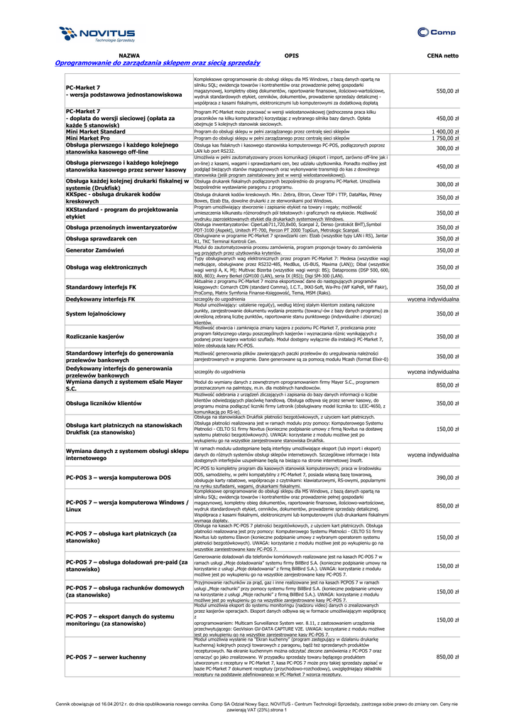 NAZWA OPIS CENA netto Oprogramowanie do zarządzania sklepem oraz siecią sprzedaży PC-Market 7 - wersja podstawowa jednostanowiskowa PC-Market 7 - dopłata do wersji sieciowej (opłata za każde 5 stanowisk) Mini Market Standard Mini Market Pro Obsługa pierwszego i każdego kolejnego stanowiska kasowego off-line Obsługa pierwszego i każdego kolejnego stanowiska kasowego przez serwer kasowy Obsługa każdej kolejnej drukarki fiskalnej w systemie (Drukfisk) KKSpec - obsługa drukarek kodów kreskowych KKStandard - program do projektowania etykiet Obsługa przenośnych inwentaryzatorów Obsługa sprawdzarek cen Generator Zamówień Obsługa wag elektronicznych Standardowy interfejs FK Dedykowany interfejs FK System lojalnościowy Rozliczanie kasjerów Standardowy interfejs do generowania przelewów bankowych Dedykowany interfejs do generowania przelewów bankowych Wymiana danych z systemem eSale Mayer S.C. Obsługa liczników klientów Obsługa kart płatniczych na stanowiskach Drukfisk (za stanowisko) Wymiana danych z systemem obsługi sklepu internetowego PC-POS 3 – wersja komputerowa DOS PC-POS 7 – wersja komputerowa Windows / Linux PC-POS 7 – obsługa kart płatniczych (za stanowisko) PC-POS 7 – obsługa doładowań pre-paid (za stanowisko) PC-POS 7 – obsługa rachunków domowych (za stanowisko) PC-POS 7 – eksport danych do systemu monitoringu (za stanowisko) PC-POS 7 – serwer kuchenny Kompleksowe oprogramowanie do obsługi sklepu dla MS Windows, z bazą danych opartą na silniku SQL; ewidencja towarów i kontrahentów oraz prowadzenie pełnej gospodarki magazynowej, kompletny obieg dokumentów, raportowanie finansowe, ilościowo-wartościowe, wydruk standardowych etykiet, cenników, dokumentów, prowadzenie sprzedaży detalicznej współpraca z kasami fiskalnymi, elektronicznymi lub komputerowymi za dodatkową dopłatą 550,00 zł Program PC-Market może pracować w wersji wielostanowiskowej (jednoczesna praca kilku praconików na kilku komputerach) korzystając z wybranego silnika bazy danych. Opłata obejmuje 5 kolejnych stanowisk sieciowych. 450,00 zł Program do obsługi sklepu w pełni zarządzanego przez centralę sieci sklepów Program do obsługi sklepu w pełni zarządzanego przez centralę sieci sklepów Obsługa kas fislaknych i kasowego stanowiska komputerowego PC-POS, podłączonych poprzez LAN lub port RS232. Umożliwia w pełni zautomatyzowany proces komunikacji (eksport i import, zarówno off-line jak i on-line) z kasami, wagami i sprawdzarkami cen, bez udziału użytkownika. Ponadto możliwy jest podgląd bieżących stanów magazynowych oraz wykonywanie transmisji do kas z dowolnego stanowiska (jeśli program zainstalowany jest w wersji wielostanowiskowej). Obsługa drukarek fiskalnych podłączonych bezpośrednio do programu PC-Market. Umożliwia bezpośrednie wystawianie paragonu z programu. Obsługa drukarek kodów kreskowych. Min.: Zebra, Eltron, Clever TDP i TTP, DataMax, Pitney Bowes, Elzab Eta, dowolne drukarki z ze sterwonikami pod Windows. Program umożliwiający stworzenie i zapisanie etykiet na towary i regały; możliwość umieszczenia kilkunastu różnorodnych pól tekstowych i graficznych na etykiecie. Możliwość wydruku zaprojektowanych etykiet dla drukarkach systemowych Windows. Obsługa inwentaryzatorów: CiperLab711,720,8x00, Scanpal 2, Denso (protokót BHT),Symbol PDT-3100 (Aspekt), Unitech PT-700, Percon PT 2000 TopGun, Metrologic Scanpal. Obsługiwane w programie PC-Market 7 sprawdzarki cen: Elzab (wszystkie typy LAN i RS), Jantar R1, TKC Terminal Kontroli Cen. Moduł do zautomatyzowania procesu zamówienia, program proponuje towary do zamówienia wg przyjętych przez użytkownika kryteriów. Typy obsługiwanych wag elektronicznych przez program PC-Market 7: Medesa (wszystkie wagi metkujące, obsługiwane przez RS232-485, MedBus, US-BUS, Maxima (LAN)); Dibal (wszystkie wagi wersji A, K, M); Multivac Bizerba (wszystkie wagi wersji: BS); Dataprocess (DSP 500, 600, 800, 803); Avery Berkel (GM100 (LAN), seria IX (RS)); Digi SM-300 (LAN). Aktualnie z programu PC-Market 7 można eksportować dane do następujących programów księgowych: Comarch CDN (standard Comma), I.C.T., IKKI-Soft, Wa-Pro (WF KaPeR, WF Fakir), ProComp, Matrix Symfonia Finanse-Księgowość, Tema, MSM (Raks). szczegóły do uzgodnienia Moduł umożliwiający: ustalenie reguł(y), według której stałym klientom zostaną naliczone punkty, zarejestrowanie dokumentu wydania prezentu (towaru/-ów z bazy danych programu) za określoną zebraną liczbę punktów, raportowanie stanu punktowego (indywidualne i zbiorcze) klientów. Możliwość otwarcia i zamknięcia zmiany kasjera z poziomu PC-Market 7, przeliczania przez program faktycznego utargu poszczególnych kasjerów i wyznaczania różnic wynikających z podanej przez kasjera wartości szuflady. Moduł dostępny wyłącznie dla instalacji PC-Market 7, które obsługują kasy PC-POS. Możliwość generowania plików zawierających paczki przelewów do uregulowania należności zarejestrowanych w programie. Dane generowane są za pomocą modułu Mcash (format Elixir-0) szczegóły do uzgodnienia Moduł do wymiany danych z zewnętrznym oprogramowaniem firmy Mayer S.C., programem przeznaczonym na palmtopy, m.in. dla mobilnych handlowców. Możliwość odebrania z urządzeń zliczających i zapisania do bazy danych informacji o liczbie klientów odwiedzających placówkę handlową. Obsługa odbywa się przez serwer kasowy, do programu można podłączyć liczniki firmy Letronik (obsługiwany model licznika to: LEIC-4650, z komunikacją po RS-ie). Obsługa na stanowiskach Drukfisk płatności bezgotówkowych, z użyciem kart płatniczych. Obsługa płatności realizowana jest w ramach modułu przy pomocy: Komputerowego Systemu Płatności - CELTO S1 firmy Novitus (konieczne podpisanie umowy z firmą Novitus na dostawę systemu płatności bezgotówkowych). UWAGA: korzystanie z modułu możliwe jest po wykupieniu go