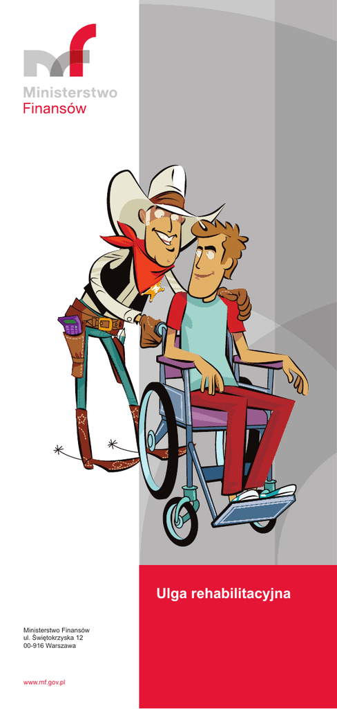 Ulga rehabilitacyjna Ministerstwo Finansów ul. Świętokrzyska 12 00-916 Warszawa www.mf.gov.pl 1 Lorem rehabilitacyjna* Ulga ipsum dolor Jeżeli jesteś osobą niepełnosprawną lub masz na utrzymaniu osobę niepełnosprawną, sprawdź, czy poniesione przez Ciebie wydatki na cele rehabilitacyjne oraz wydatki związane z ułatwieniem wykonywania czynności życiowych uprawniają do ulgi w podatku dochodowym od osób fizycznych. Jeśli tak, to możesz je uwzględnić przy obliczaniu podatku. UWAGA! Każda ulga podatkowa to przywilej, z którego możesz skorzystać tylko wtedy, gdy spełnisz wszystkie warunki. Urząd skarbowy ma prawo sprawdzić poprawność dokonanych odliczeń. WYJAŚNIENIE NAJWAŻNIEJSZYCH POJĘĆ Osoba niepełnosprawna – to osoba, która posiada: • orzeczenie o zakwalifikowaniu przez organy orzekające do jednego z trzech stopni niepełnosprawności lub • decyzję przyznającą rentę z tytułu całkowitej lub częściowej niezdolności do pracy, rentę szkoleniową albo rentę socjalną, albo • orzeczenie o niepełnosprawności osoby, która nie ukończyła 16. roku życia, wydane na podstawie odrębnych przepisów, • orzeczenie o niepełnosprawności, wydane przez właściwy organ na podstawie odrębnych przepisów obowiązujących do dnia 31 sierpnia 1997 r. Osoba niepełnosprawna zaliczona do I grupy inwalidzkiej – to osoba, w stosunku do której orzeczono całkowitą niezdolność do pracy oraz niezdolność do samodzielnej egzystencji albo znaczny stopień niepełnosprawności. *Stan prawny obowiązujący w 2011 r. 2 Ministerstwo Finansów www.mf.gov.pl 1 Osoba niepełnosprawna zaliczona do II grupy inwalidzkiej – to osoba, w stosunku do której orzeczono całkowitą niezdolność do pracy albo umiarkowany stopień niepełnosprawności. Osoba niepełnosprawna pozostająca na utrzymaniu podatnika – to współmałżonek, dzieci własne i przysposobione, dzieci obce przyjęte na wychowanie, pasierbowie, rodzice, rodzice współmałżonka, rodzeństwo, ojczym, macocha, zięciowie i synowe, jeżeli są osobami niepełnosprawnymi, a jego dochody nie przekraczają w roku podatkowym kwoty 9120 zł. WYDATKI UPRAWNIAJĄCE DO ODLICZEŃ Nie każdy wydatek dotyczący osoby niepełnosprawnej uprawnia do odliczeń w ramach ulgi rehabilitacyjnej. Odliczeniu podlegają wyłącznie te wydatki poniesione przez osobę niepełnosprawną lub podatnika mającego na utrzymaniu taką osobę, które zostały wymienione w ustawie o podatku dochodowym od osób fizycznych1, jako wydatki na cele rehabilitacyjne oraz wydatki związane z ułatwieniem wykonywania czynności życiowych. WYDATKI UPRAWNIAJĄCE DO ODLICZEŃ dzielą się na WYDATKI NIELIMITOWANE (odliczeniu podlega cała wydatkowana kwota) WYDATKI LIMITOWANE (kwotę przysługującego odliczenia oblicza się z uwzględnieniem „górnego” lub „dolnego” limitu kwotowego) Wydatki nielimitowane – należą do nich wydatki poniesione na: • adaptację i wyposażenie mieszkań oraz budynków mieszkalnych, stosownie do potrzeb wynikających z niepełnosprawności, 1 Art.26 ust. 7a ustawy o podatku dochodowym od osób fizycznych. 2 Ministerstwo Finansów • przystosowanie pojazdów mechanicznych do potrzeb wynikających z niepełnosprawności, • zakup i naprawę indywidualnego sprzętu, urządzeń i narzędzi technicznych niezbędnych w rehabilitacji oraz ułatwiających wykonywanie czynności życiowych, stosownie do potrzeb wynikających z niepełnosprawności, z wyjątkiem sprzętu gospodarstwa domowego, • zakup wydawnictw i materiałów (pomocy) szkoleniowych, stosownie do potrzeb wynikających z niepełnosprawności, • odpłatny pobyt na turnusie rehabilitacyjnym, • odpłatny pobyt na leczeniu w zakładzie lecznictwa uzdrowiskowego, pobyt w zakładzie rehabilitacji leczniczej, zakładach opiekuńczo-leczniczych i pielęgnacyjno-opiekuńczych oraz odpłatność za zabiegi rehabilitacyjne, • opiekę pielęgniarską w domu nad osobą niepełnosprawną w okresie przewlekłej choroby uniemożliwiającej poruszanie się oraz usługi opiekuńcze świadczone dla osób niepełnosprawnych zaliczonych do I grupy inwalidztwa, • opłacenie tłumacza języka migowego, • kolonie i obozy dla dzieci i młodzieży niepełnosprawnej oraz dzieci osób niepełnosprawnych, które nie ukończyły 25. roku życia, • odpłatny, konieczny przewóz na niezbędne zabiegi leczniczo-rehabilitacyjne: -- osoby niepełnosprawnej - karetką transportu sanitarnego, -- osoby niepełnosprawnej zaliczonej do I lub II grupy inwalidztwa oraz dzieci niepełnosprawnych do lat 16, również innymi niż karetka środkami transportu sanitarnego, • odpłatne przejazdy środkami transportu publicznego związane z pobytem: -- na turnusie rehabilitacyjnym, -- w zakładach lecznictwa uzdrowiskowego, zakładach rehabilitacji leczniczej, zakładach opiekuńczo-leczniczych i pielęgnacyjno-opiekuńczych, -- na koloniach i obozach dla dzieci i młodzieży niepełnosprawnej oraz dzieci osób niepełnosprawnych, które nie ukończyły 25. roku życia. www.mf.gov.pl 3 Wydatki limitowane – należą do nich wydatki poniesione na: • opłacenie przewodników osób niewidomych zaliczonych do I lub II grupy inwalidztwa oraz osób z niepełnosprawnością narządu ruchu zaliczonych do I grupy inwalidztwa – maksymalna kwota odliczenia w roku podatkowym wynosi 2280 zł, • utrzymanie przez osoby niewidome i niedowidzące zaliczone do I lub II grupy inwalidztwa oraz osoby z niepełnosprawnością narządu ruchu zaliczone do I grupy inwalidztwa psa asystującego, o którym mowa w ustawie o rehabilitacji zawodowej i społecznej oraz zatrudnianiu osób niepełnosprawnych, tj. odpowiednio wyszkolonego i specjalnie oznaczonego psa (np. psa przewodnika), który ułatwia osobie niepełnosprawnej aktywne uczestnictwo w życiu społecznym – maksymalna kwota odliczenia w roku podatkowym wynosi 2280 zł, • używanie samochodu osobowego stanowiącego własnoś