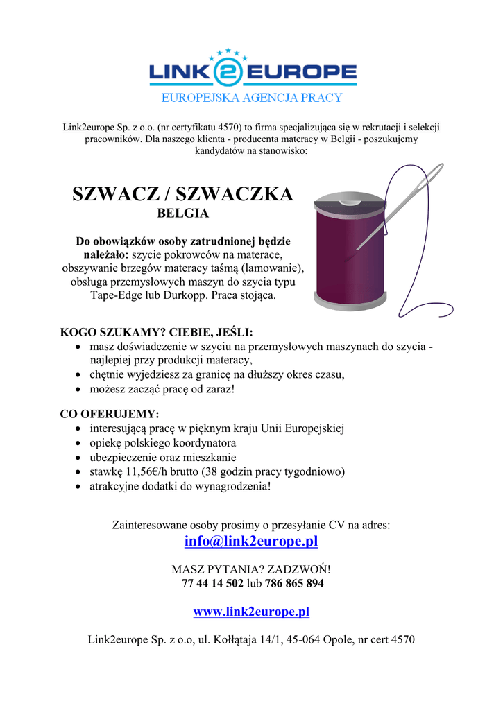 Link2europe Sp. z o.o. (nr certyfikatu 4570) to firma specjalizująca się w rekrutacji i selekcji pracowników. Dla naszego klienta - producenta materacy w Belgii - poszukujemy kandydatów na stanowisko: SZWACZ / SZWACZKA BELGIA Do obowiązków osoby zatrudnionej będzie należało: szycie pokrowców na materace, obszywanie brzegów materacy taśmą (lamowanie), obsługa przemysłowych maszyn do szycia typu Tape-Edge lub Durkopp. Praca stojąca. KOGO SZUKAMY? CIEBIE, JEŚLI: masz doświadczenie w szyciu na przemysłowych maszynach do szycia najlepiej przy produkcji materacy, chętnie wyjedziesz za granicę na dłuższy okres czasu, możesz zacząć pracę od zaraz! CO OFERUJEMY: interesującą pracę w pięknym kraju Unii Europejskiej opiekę polskiego koordynatora ubezpieczenie oraz mieszkanie stawkę 11,56€/h brutto (38 godzin pracy tygodniowo) atrakcyjne dodatki do wynagrodzenia! Zainteresowane osoby prosimy o przesyłanie CV na adres: [email protected] MASZ PYTANIA? ZADZWOŃ! 77 44 14 502 lub 786 865 894 www.link2europe.pl Link2europe Sp. z o.o, ul. Kołłątaja 14/1, 45-064 Opole, nr cert 4570