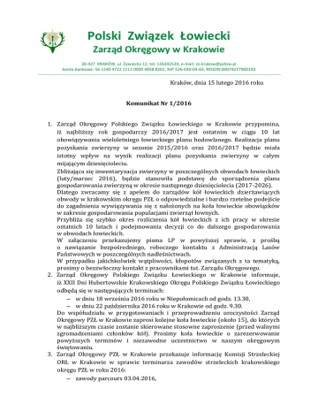 Polski Związek Łowiecki Zarząd Okręgowy w Krakowie 30-427 KRAKÓW, ul. Żywiecka 12, tel. 126342534, e-mail: [email protected] konto bankowe: 56 1240 4722 1111 0000 4858 8201, NIP 526-030-04-63, REGON 00074227900103 Kraków, dnia 15 lutego 2016 roku Komunikat Nr 1/2016 1. Zarząd Okręgowy Polskiego Związku Łowieckiego w Krakowie przypomina, iż najbliższy rok gospodarczy 2016/2017 jest ostatnim w ciągu 10 lat obowiązywania wieloletniego łowieckiego planu hodowlanego. Realizacja planu pozyskania zwierzyny w sezonie 2015/2016 oraz 2016/2017 będzie miała istotny wpływ na wynik realizacji planu pozyskania zwierzyny w całym mijającym dziesięcioleciu. Zbliżająca się inwentaryzacja zwierzyny w poszczególnych obwodach łowieckich (luty/marzec 2016), będzie stanowiła podstawę do sporządzenia planu gospodarowania zwierzyną w okresie następnego dziesięciolecia (2017-2026). Dlatego zwracamy się z apelem do zarządów kół łowieckich dzierżawiących obwody w krakowskim okręgu PZŁ o odpowiedzialne i bardzo rzetelne podejście do zagadnienia wywiązywania się z nałożonych na koła łowieckie obowiązków w zakresie gospodarowania populacjami zwierząt łownych. Przybliża się szybko okres rozliczenia kół łowieckich z ich pracy w okresie ostatnich 10 latach i podejmowania decyzji co do dalszego gospodarowania w obwodach łowieckich. W załączeniu przekazujemy pisma LP w powyższej sprawie, z prośbą o nawiązanie bezpośredniego, roboczego kontaktu z Administracją Lasów Państwowych w poszczególnych nadleśnictwach. W przypadku jakichkolwiek wątpliwości, kłopotów związanych z ta tematyką, prosimy o bezzwłoczny kontakt z pracownikami tut. Zarządu Okręgowego. 2. Zarząd Okręgowy Polskiego Związku Łowieckiego w Krakowie informuje, iż XXII Dni Hubertowskie Krakowskiego Okręgu Polskiego Związku Łowieckiego odbędą się w następujących terminach: w dniu 18 września 2016 roku w Niepołomicach od godz. 13.30, w dniu 22 października 2016 roku w Krakowie od godz. 9.30. Do współudziału w przygotowaniach i przeprowadzeniu uroczystości Zarząd Okręgowy PZŁ w Krakowie zaprosi kolejne koła łowieckie (około 15), do których w najbliższym czasie zostanie skierowane stosowne zaproszenie (przed walnymi zgromadzeniami członków kół). Prosimy koła łowieckie o zarezerwowanie powyższych terminów i niezawodne uczestnictwo w naszym okręgowym świętowaniu. 3. Zarząd Okręgowy PZŁ w Krakowie przekazuje informację Komisji Strzeleckiej ORŁ w Krakowie w sprawie terminarza zawodów strzeleckich krakowskiego okręgu PZŁ w roku 2016: zawody parcours 03.04.2016, mistrzostwa okręgu krakowskiego PZŁ – sześciobój – eliminacje do mistrzostw Polski 08.05.2016, zawody parcours 03.07.2016, sześciobój myśliwski 11.09.2016, zawody parcours 18.09.2016. Serdecznie zapraszamy koła łowieckie oraz myśliwych członków kół łowieckich oraz niestowarzyszonych w kołach łowieckich do udziału w zawodach. 4. Zarząd Okręgowy PZŁ w Krakowie przekazuje informację Komisji Kynologicznej ORŁ w Krakowie w sprawie terminarza organizowanych w naszym okręgu imprez kynologicznych. Zapraszamy do udziału w zawodach. 5. Tegoroczny Konkurs Sygnalistów Myśliwskich „O Róg Zbramira”, odbędzie się w Niepołomicach w dniu 16 kwietnia 2016 roku. W imieniu organizatorów zapraszamy do udziału w tej pięknej imprezie. 6. Zarząd Okręgowy PZŁ w Krakowie uprzejmie informuje, iż tegoroczne Mistrzostwa Małopolski w Wabieniu Drapieżników zostaną przeprowadzone na terenie krakowskiego okręgu PZŁ (powiat myślenicki oraz wielicki) w terminie przypadającym na listopadową pełnię księżyca (około 12 do 16 listopada 2016). W imieniu organizatorów zawodów: Klubu Wabiarzy Drapieżników przy Zarządzie Głównym PZŁ oraz Zarządu Okręgowego PZŁ w Krakowie serdecznie zapraszamy koleżanki i kolegów myśliwych do udziału w Mistrzostwach. Szczegóły tego przedsięwzięcia zostaną przekazane w najbliższym czasie. 7. W załączeniu przekazujemy opracowanie Stacji Badawczej PZŁ w Czempiniu pt. „Sytuacja zwierząt łownych w Polsce – 2015) do wykorzystania w bieżącej pracy. 8. Zarząd Okręgowy PZŁ w Krakowie przypomina, iż w dniu 31.12.2015 r. upłynął termin płatności składki członkowskiej do PZŁ. Pełna składka wynosi 355 zł a ulgowa 195 zł, prosimy o uregulowanie tego obowiązku statutowego. 9. W dniach 18-20 marca 2016 roku odbędzie się w Warszawie kolejna edycja Targów Łowieckich Hubertus Expo, których organizatorem jest Polski Związek Łowiecki. W dniu 19 marca 2016 roku, ZO PZŁ w Krakowie organizuje wyjazd do Warszawy na Targi oraz do Muzeum Łowiectwa i Jeździectwa. Bezpłatny transport do Warszawy i z powrotem, osoby zainteresowane powyższa ofertą, proszone są o kontakt z sekretariatem ZO PZŁ w Krakowie w terminie do 15 marca 2016 roku (tel. 12 634 25 34). 10. Zarząd Okręgowy PZŁ w Krakowie informuje, iż uchwałą z dnia 2 listopada 2015 roku postanowił ogłosić II edycję Konkursu Fotograficznego pt. „Przyroda i Łowiectwo”. Konkurs będzie przeprowadzony według regulaminu, który dostępny jest na stronie internetowej PZŁ Kraków, a Jury konkursu będzie pracować pod przewodnictwem kol. Wojciech Plewińskiego, znakomitego fotografika i myśliwego. Zapraszamy do udziału w konkursie. Dla najlepszych przewidziane są cenne nagrody. Planowana jest również wystawa nadesłanych prac w Małopolskim Centrum Kultury Łowieckiej w Zamku Królewskim w Niepołomicach. 11. Zarząd Okręgowy PZŁ w Krakowie przekazuje serdeczne podziękowania dla Kolegów, którzy udostępnili swoje parostki (po ostatniej ocenie i wycenie medalowej) na wystawę w salach Małopolskiego Centrum Kultury Łowieckiej na Zamku Królewskim w Niepołomicach. Cieszy się ona dużym zainteresowaniem myśliwych i nie tylko. Pragniemy również podziękować Kolegom z Koła Łowieckiego „ŻUBR” w Niepołomicach za pomoc w przygot