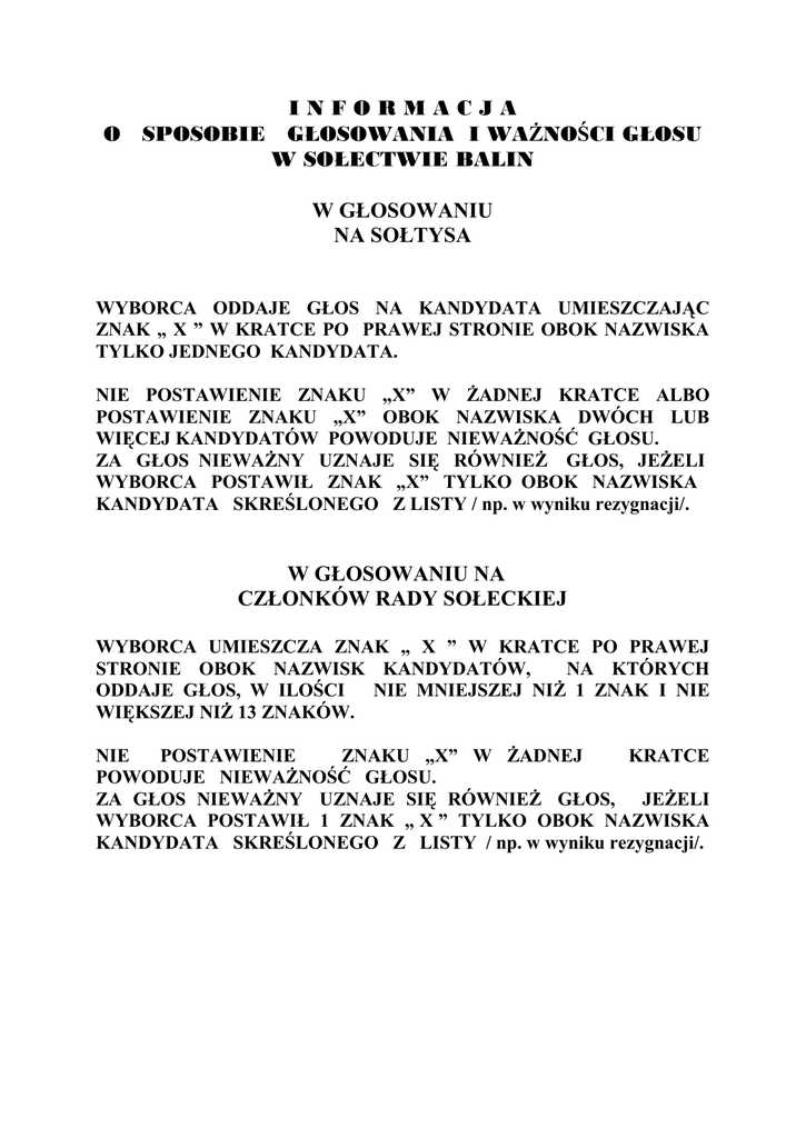INFORMACJA O SPOSOBIE GŁOSOWANIA I WAŻNOŚCI GŁOSU W SOŁECTWIE BALIN W GŁOSOWANIU NA SOŁTYSA WYBORCA ODDAJE GŁOS NA KANDYDATA UMIESZCZAJĄC ZNAK „ X ” W KRATCE PO PRAWEJ STRONIE OBOK NAZWISKA TYLKO JEDNEGO KANDYDATA. NIE POSTAWIENIE ZNAKU „X” W ŻADNEJ KRATCE ALBO POSTAWIENIE ZNAKU „X” OBOK NAZWISKA DWÓCH LUB WIĘCEJ KANDYDATÓW POWODUJE NIEWAŻNOŚĆ GŁOSU. ZA GŁOS NIEWAŻNY UZNAJE SIĘ RÓWNIEŻ GŁOS, JEŻELI WYBORCA POSTAWIŁ ZNAK „X” TYLKO OBOK NAZWISKA KANDYDATA SKREŚLONEGO Z LISTY / np. w wyniku rezygnacji/. W GŁOSOWANIU NA CZŁONKÓW RADY SOŁECKIEJ WYBORCA UMIESZCZA ZNAK „ X ” W KRATCE PO PRAWEJ STRONIE OBOK NAZWISK KANDYDATÓW, NA KTÓRYCH ODDAJE GŁOS, W ILOŚCI NIE MNIEJSZEJ NIŻ 1 ZNAK I NIE WIĘKSZEJ NIŻ 13 ZNAKÓW. NIE POSTAWIENIE ZNAKU „X” W ŻADNEJ KRATCE POWODUJE NIEWAŻNOŚĆ GŁOSU. ZA GŁOS NIEWAŻNY UZNAJE SIĘ RÓWNIEŻ GŁOS, JEŻELI WYBORCA POSTAWIŁ 1 ZNAK „ X ” TYLKO OBOK NAZWISKA KANDYDATA SKREŚLONEGO Z LISTY / np. w wyniku rezygnacji/. INFORMACJA O SPOSOBIE GŁOSOWANIA I WAŻNOŚCI GŁOSU W SOŁECTWIE POGORZYCE W GŁOSOWANIU NA SOŁTYSA WYBORCA ODDAJE GŁOS NA KANDYDATA UMIESZCZAJĄC ZNAK „X” W KRATCE PO PRAWEJ STRONIE OBOK NAZWISKA TYLKO JEDNEGO KANDYDATA. NIE POSTAWIENIE ZNAKU „X” W ŻADNEJ KRATCE ALBO POSTAWIENIE ZNAKU „X” OBOK NAZWISKA DWÓCH LUB WIĘCEJ KANDYDATÓW POWODUJE NIEWAŻNOŚĆ GŁOSU. ZA GŁOS NIEWAŻNY UZNAJE SIĘ RÓWNIEŻ GŁOS, JEŻELI WYBORCA POSTAWIŁ ZNAK „X” TYLKO OBOK NAZWISKA KANDYDATA SKREŚLONEGO Z LISTY / np. w wyniku rezygnacji/ W GŁOSOWANIU NA CZŁONKÓW RADY SOŁECKIEJ WYBORCA UMIESZCZA ZNAK „ X ” W KRATCE PO PRAWEJ STRONIE OBOK NAZWISK KANDYDATÓW, NA KTÓRYCH ODDAJE GŁOS. NIE POSTAWIENIE ZNAKU „X” W ŻADNEJ KRATCE POWODUJE NIEWAŻNOŚĆ GŁOSU. ZA GŁOS NIEWAŻNY UZNAJE SIĘ RÓWNIEŻ GŁOS, JEŻELI WYBORCA POSTAWIŁ 1 ZNAK „X” TYLKO OBOK NAZWISKA KANDYDATA SKREŚLONEGO Z LISTY / np. w wyniku rezygnacji/. INFORMACJA O SPOSOBIE GŁOSOWANIA I WAŻNOŚCI GŁOSU W SOŁECTWIE LUSZOWICE W GŁOSOWANIU NA SOŁTYSA WYBORCA ODDAJE GŁOS NA KANDYDATA UMIESZCZAJĄC ZNAK „ X ” W KRATCE PO PRAWEJ STRONIE OBOK NAZWISKA TYLKO JEDNEGO KANDYDATA. NIE POSTAWIENIE ZNAKU „X” W ŻADNEJ KRATCE ALBO POSTAWIENIE ZNAKU „X” OBOK NAZWISKA DWÓCH KANDYDATÓW POWODUJE NIEWAŻNOŚĆ GŁOSU. ZA GŁOS NIEWAŻNY UZNAJE SIĘ RÓWNIEŻ GŁOS, JEŻELI WYBORCA POSTAWIŁ ZNAK „ X ” TYLKO OBOK NAZWISKA KANDYDATA SKREŚLONEGO Z LISTY / np. w wyniku rezygnacji/ W GŁOSOWANIU NA CZŁONKÓW RADY SOŁECKIEJ WYBORCA UMIESZCZA ZNAK „ X ” W KRATCE PO PRAWEJ STRONIE OBOK NAZWISK KANDYDATÓW, NA KTÓRYCH ODDAJE GŁOS. NIE POSTAWIENIE ZNAKU „X” W ŻADNEJ KRATCE POWODUJE NIEWAŻNOŚĆ GŁOSU. ZA GŁOS NIEWAŻNY UZNAJE SIĘ RÓWNIEŻ GŁOS, JEŻELI WYBORCA POSTAWIŁ 1 ZNAK „ X ” TYLKO OBOK NAZWISKA KANDYDATA SKREŚLONEGO Z LISTY / np. w wyniku rezygnacji/. INFORMACJA O SPOSOBIE GŁOSOWANIA I WAŻNOŚCI GŁOSU W SOŁECTWIE PŁAZA W GŁOSOWANIU NA SOŁTYSA WYBORCA ODDAJE GŁOS NA KANDYDATA UMIESZCZAJĄC ZNAK „ X ” W KRATCE PO PRAWEJ STRONIE OBOK NAZWISKA KANDYDATA. NIE POSTAWIENIE ZNAKU „X” W KRATCE OBOK NAZWISKA KANDYDATA POWODUJE NIEWAŻNOŚĆ GŁOSU. W GŁOSOWANIU NA CZŁONKÓW RADY SOŁECKIEJ WYBORCA UMIESZCZA ZNAK „ X ” W KRATCE PO PRAWEJ STRONIE OBOK NAZWISK KANDYDATÓW, NA KTÓRYCH ODDAJE GŁOS. NIE POSTAWIENIE ZNAKU „X” W ŻADNEJ KRATCE POWODUJE NIEWAŻNOŚĆ GŁOSU. ZA GŁOS NIEWAŻNY UZNAJE SIĘ RÓWNIEŻ GŁOS, JEŻELI WYBORCA POSTAWIŁ 1 ZNAK „ X ” TYLKO OBOK NAZWISKA KANDYDATA SKREŚLONEGO Z LISTY / np. w wyniku rezygnacji/. INFORMACJA O SPOSOBIE GŁOSOWANIA I WAŻNOŚCI GŁOSU W SOŁECTWIE ŹREBCE W GŁOSOWANIU NA SOŁTYSA WYBORCA ODDAJE GŁOS NA KANDYDATA UMIESZCZAJĄC ZNAK „ X ” W KRATCE PO PRAWEJ STRONIE OBOK NAZWISKA KANDYDATA. NIE POSTAWIENIE ZNAKU „X” W KRATCE OBOK NAZWISKA KANDYDATA POWODUJE NIEWAŻNOŚĆ GŁOSU. W GŁOSOWANIU NA CZŁONKÓW RADY SOŁECKIEJ WYBORCA UMIESZCZA ZNAK „ X ” W KRATCE PO PRAWEJ STRONIE OBOK NAZWISK KANDYDATÓW, NA KTÓRYCH ODDAJE GŁOS. NIE POSTAWIENIE ZNAKU „X” W ŻADNEJ KRATCE POWODUJE NIEWŻNOŚĆ GŁOSU. ZA GŁOS NIEWAŻNY UZNAJE SIĘ RÓWNIEŻ GŁOS, JEŻELI WYBORCA POSTAWIŁ 1 ZNAK „ X ” TYLKO OBOK NAZWISKA KANDYDATA SKREŚLONEGO Z LISTY / np. w wyniku rezygnacji/. INFORMACJA O SPOSOBIE GŁOSOWANIA I WAŻNOŚCI GŁOSU W SOŁECTWIE OKRADZIEJÓWKA W GŁOSOWANIU NA SOŁTYSA WYBORCA ODDAJE GŁOS NA KANDYDATA UMIESZCZAJĄC ZNAK „ X ” W KRATCE PO PRAWEJ STRONIE OBOK NAZWISKA KANDYDATA. NIE POSTAWIENIE ZNAKU „X” W KRATCE OBOK NAZWISKA KANDYDATA POWODUJE NIEWAŻNOŚĆ GŁOSU. W GŁOSOWANIU NA CZŁONKÓW RADY SOŁECKIEJ WYBORCA UMIESZCZA ZNAK „ X ” W KRATCE PO PRAWEJ STRONIE OBOK NAZWISK KANDYDATÓW, NA KTÓRYCH ODDAJE GŁOS. NIE POSTAWIENIE ZNAKU „X” W ŻADNEJ KRATCE POWODUJE NIEWAŻNOŚĆ GŁOSU. ZA GŁOS NIEWAŻNY UZNAJE SIĘ RÓWNIEŻ GŁOS, JEŻELI WYBORCA POSTAWIŁ 1 ZNAK „ X ” TYLKO OBOK NAZWISKA KANDYDATA SKREŚLONEGO Z LISTY / np. w wyniku rezygnacji/.