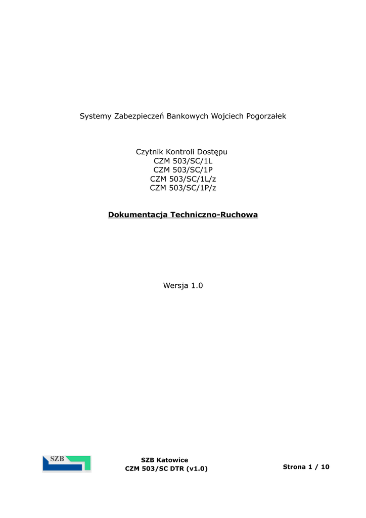 Systemy Zabezpieczeń Bankowych Wojciech Pogorzałek Czytnik Kontroli Dostępu CZM 503/SC/1L CZM 503/SC/1P CZM 503/SC/1L/z CZM 503/SC/1P/z Dokumentacja Techniczno-Ruchowa Wersja 1.0 SZB Katowice CZM 503/SC DTR (v1.0) Strona 1 / 10 Spis treści Charakterystyka ogólna...........................................................................3 Odczyt karty zbliżeniowej........................................................................4 Odczyt karty stykowej (chipowej).............................................................4 Sygnalizacja stanu diodami LED................................................................4 Parametry techniczne..............................................................................5 Podłączenie czytnika...............................................................................6 Zasilanie............................................................................................6 Interfejs komunikacyjny.......................................................................6 Wejścia dodatkowe..............................................................................6 Wyjście przekaźnikowe.........................................................................7 Ustawienie adresu czytnika...................................................................8 Instalacja mechaniczna czytnika...............................................................9 SZB Katowice CZM 503/SC DTR (v1.0) Strona 2 / 10 Charakterystyka ogólna Czytnik CZM 503/SC umożliwia odczyt numerów UID kart zbliżeniowych typu Mifare oraz odczyt kodu ATR kart chipowych. Przeznaczony jest do pracy w systemach kontroli dostępu wykorzystujących karty zbliżeniowe typu Mifare oraz w miejscach, do których dostęp możliwy jest przy użyciu karty chipowej dowolnego typu. Komunikacja czytnika z kontrolerem realizowana jest poprzez interfejs RS-485. Czytnik może być montowany w strefach nieogrzewanych, w tym również na zewnątrz budynków. Aby zapewnić prawidłową pracę czytnika wyposażony jest on w element grzejny i termostat. Czytnik dostępny jest w wersji do montażu wewnętrznego (bez uszczelnień – wersje SC 503/SC/1L i SC 503/SC/1P) oraz w wersji do montażu na zewnątrz (z uszczelką - wersje SC 503/SC/1L/z i SC 503/SC/1P/z). Czytnik występuje w wersji z gniazdem karty stykowej z lewej strony (wersje SC 503/SC/1L i SC 503/SC/1L/z) oraz z gniazdem dostępnym z prawej strony (wersje SC 503/SC/1P i SC 503/SC/1P/z). Cechy podstawowe: • odczyt numeru UID kart typu Mifare • odczyt typu i sprawdzenie obecności karty stykowej • interfejs RS485 z dedykowanym protokołem transmisji • trzy sygnalizacyjne diody LED (zielona, żółta, niebieska) • sygnał dźwiękowy (buzer) • styk sabotażowy • dwa wejścia dodatkowe dowolnego wykorzystania • wyjście przekaźnikowe do dowolnego wykorzystania SZB Katowice CZM 503/SC DTR (v1.0) Strona 3 / 10 Odczyt karty zbliżeniowej Odczyt karty następuje po zbliżeniu jej równolegle do płaszczyzny czytnika w pobliżu jego środka. Obecność karty w polu czytnika jest sygnalizowana poprzez szybkie miganie żółtej diody, a o dokonanym odczycie urządzenie informuje krótkim sygnałem dźwiękowym. Odczyt karty stykowej (chipowej) Odczyt karty następuje po włożeniu jej do gniazda karty umieszczonego z lewej lub prawej strony czytnika. Po odczytaniu karty czytnik poprzez miganie zielonej diody i cykliczne czterokrotne piśnięcie sygnalizuje prawidłowy odczyt i konieczność wyjęcia karty z czytnika. Dopiero w tym momencie (po wyjęciu karty) informacja o odczytaniu karty przesyłana jest do kontrolera dostępu. Czytnik nie odczytuje zawartości karty. Czytnik nie identyfikuje konkretnej karty, ale jedynie sprawdza poprawność jej działania poprzez sprawdzenie poprawności odpowiedzi na rozkaz restartu przesłanego do procesora karty (komenda ATR). Sygnalizacja stanu diodami LED Czytnik wyposażony jest w trzy diody LED: • zieloną - informującą o uzyskaniu dostępu • żółtą - informującą o braku dostępu • niebieską – informującą o stanie uzbrojenia strefy alarmowej Dioda zielona informuje również o konieczności wyjęcia karty stykowej po prawidłowym odczycie. Dioda żółta informuje również o prawidłowym odczycie karty zbliżeniowej. Uwaga! Znaczenie poszczególnych diod może być inne w zależności od ustawień kontrolera dostępu. SZB Katowice CZM 503/SC DTR (v1.0) Strona 4 / 10 Parametry techniczne Napięcie zasilania 9...18VDC Średni pobór prądu 45mA @ 12V – stan normalny 95mA @ 12V – włączony przekaźnik 270mA @ 12V – włączony grzejnik 320mA @ 12V – włączony grzejnik i przekaźnik Obsługiwane karty karty Mifare z interfejsem RF ISO14443A: Mifare Ultralight Mifare Classic 1K oraz 4K Mifare DESFire Mifare DESFire EV1 Zasięg odczytu do 5 cm (zależny od typu karty i jej ułożenia) Interfejs komunikacyjny RS485 (9600bps, 8, N, 1, protokół dedykowany) inne parametry – do uzgodnienia Stopień ochrony IP40 dla wersji bez uszczelki IP4X dla wersji z uszczelką (czytnik posiada gniazdo dla kart stykowych – obudowa czytnika nie jest szczelna) Wejścia ogólnego przeznaczenia kontrola zwarcia do masy + podciąg 10kohm do +12V Wyjście przekaźnikowe styki NO i NC oraz dodatkowy bezpiecznik 30V 0.5A Wymiary 51mm x 176,6mm x 28,5mm SZB Katowice CZM 503/SC DTR (v1.0) Strona 5 / 10 Podłączenie czytnika W celu otwarcia obudowy należy wykręcić znajdujący się w jej dolnej części wkręt stożkowy B2.5x6, lekko podważyć pokrywę obudowy od dołu i wysunąć ją do góry uważając by nie wyłamać znajdującego się w jej górnej części zatrzasku. Uwaga! Otwarcie obudowy spowoduje wywołanie alarmu sabotażowego. Po otwarciu obudowy uzyskujemy dostęp do wszystkich zacisków oraz przełącznika adresu. Zasilanie Czytnik zasilany jest napięciem 12V DC (9..18V). Minus zasilania podłączamy do zacisku oznaczonego GND złącza J1. Plus zasilania podłąc