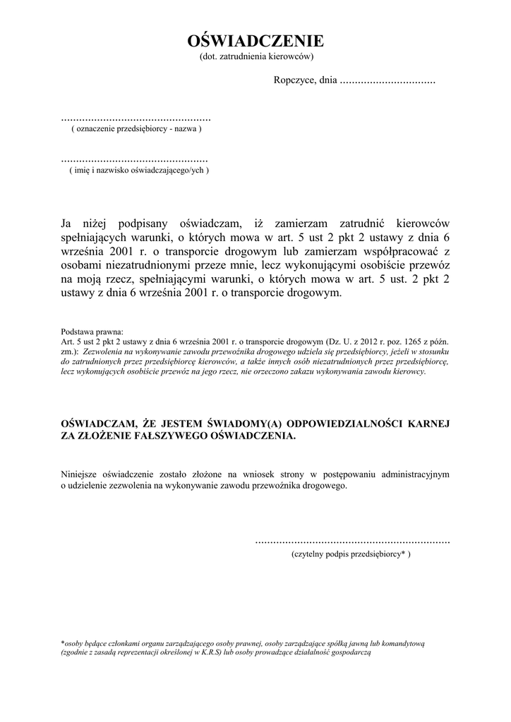 OŚWIADCZENIE (dot. zatrudnienia kierowców) Ropczyce, dnia ................................ .................................................. ( oznaczenie przedsiębiorcy - nazwa ) ................................................. ( imię i nazwisko oświadczającego/ych ) Ja niżej podpisany oświadczam, iż zamierzam zatrudnić kierowców spełniających warunki, o których mowa w art. 5 ust 2 pkt 2 ustawy z dnia 6 września 2001 r. o transporcie drogowym lub zamierzam współpracować z osobami niezatrudnionymi przeze mnie, lecz wykonującymi osobiście przewóz na moją rzecz, spełniającymi warunki, o których mowa w art. 5 ust. 2 pkt 2 ustawy z dnia 6 września 2001 r. o transporcie drogowym. Podstawa prawna: Art. 5 ust 2 pkt 2 ustawy z dnia 6 września 2001 r. o transporcie drogowym (Dz. U. z 2012 r. poz. 1265 z późn. zm.): Zezwolenia na wykonywanie zawodu przewoźnika drogowego udziela się przedsiębiorcy, jeżeli w stosunku do zatrudnionych przez przedsiębiorcę kierowców, a także innych osób niezatrudnionych przez przedsiębiorcę, lecz wykonujących osobiście przewóz na jego rzecz, nie orzeczono zakazu wykonywania zawodu kierowcy. OŚWIADCZAM, ŻE JESTEM ŚWIADOMY(A) ODPOWIEDZIALNOŚCI KARNEJ ZA ZŁOŻENIE FAŁSZYWEGO OŚWIADCZENIA. Niniejsze oświadczenie zostało złożone na wniosek strony w postępowaniu administracyjnym o udzielenie zezwolenia na wykonywanie zawodu przewoźnika drogowego. ................................................................. (czytelny podpis przedsiębiorcy* ) *osoby będące członkami organu zarządzającego osoby prawnej, osoby zarządzające spółką jawną lub komandytową (zgodnie z zasadą reprezentacji określonej w K.R.S) lub osoby prowadzące działalność gospodarczą