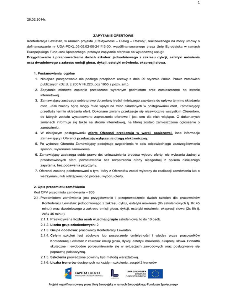 1 28.02.2014r. ZAPYTANIE OFERTOWE Konfederacja Lewiatan, w ramach projektu „Efektywność – Dialog – Rozwój”, realizowanego na mocy umowy o dofinansowanie nr UDA-POKL.05.05.02-00-241/13-00, współfinansowanego przez Unię Europejską w ramach Europejskiego Funduszu Społecznego, przesyła zapytanie ofertowe na wykonawcę usługi: Przygotowanie i przeprowadzenie dwóch szkoleń: jednodniowego z zakresu dykcji, estetyki mówienia oraz dwudniowego z zakresu emisji głosu, dykcji, estetyki mówienia, ekspresji słowa. 1. Postanowienia ogólne 1. Niniejsze postępowanie nie podlega przepisom ustawy z dnia 29 stycznia 2004r. Prawo zamówień publicznych (Dz.U. z 2007r Nr.223, poz 1655 z późn. zm.). 2. Zapytanie ofertowe zostanie przekazane wybranym podmiotom oraz zamieszczone na stronie internetowej. 3. Zamawiający zastrzega sobie prawo do zmiany treści niniejszego zapytania do upływu terminu składania ofert. Jeśli zmiany będą mogły mieć wpływ na treść składanych w postępowaniu ofert, Zamawiający przedłuży termin składania ofert. Dokonane zmiany przekazuje się niezwłocznie wszystkim Oferentom, do których zostało wystosowane zaproszenia ofertowe i jest ono dla nich wiążące. O dokonanych zmianach informuje się także na stronie internetowej, na której zostało zamieszczone ogłoszenie o zamówieniu. 4. W niniejszym postępowaniu ofertę Oferenci przekazują w wersji papierowej, inne informacje Zamawiający i Oferenci przekazują wyłączenie drogą elektroniczną. 5. Po wyborze Oferenta Zamawiający podejmuje uzgodnienia w celu odpowiedniego uszczegółowienia sposobu wykonania zamówienia. 6. Zamawiający zastrzega sobie prawo do: unieważnienia procesu wyboru oferty, nie wybrania żadnej z przedstawionych ofert, pozostawienia bez rozpatrzenia oferty niezgodnej z opisem niniejszego zapytania, bez podawania przyczyny. 7. Oferenci zostaną poinformowani o tym, który z Oferentów został wybrany do realizacji zamówienia lub o wstrzymaniu lub odstąpieniu od procesu wyboru oferty. 2. Opis przedmiotu zamówienia Kod CPV przedmiotu zamówienia – 805 2.1. Przedmiotem zamówienia jest przygotowanie i przeprowadzenie dwóch szkoleń dla pracowników Konfederacji Lewiatan: jednodniowego z zakresu dykcji, estetyki mówienia (8h szkoleniowych tj. 8x 45 minut) oraz dwudniowego z zakresu emisji głosu, dykcji, estetyki mówienia, ekspresji słowa (2x 8h tj. 2x8x 45 minut). 2.1.1. Przewidywana liczba osób w jednej grupie szkoleniowej to do 10 osób. 2.1.2. Liczba grup szkoleniowych: 2 2.1.3. Grupa docelowa: pracownicy Konfederacji Lewiatan. 2.1.4. Celem szkoleń jest zdobycie lub poszerzenie umiejętności i wiedzy przez pracowników Konfederacji Lewiatan z zakresu: emisji głosu, dykcji, estetyki mówienia, ekspresji słowa. Ponadto skuteczne i swobodne porozumiewanie się w sytuacjach zawodowych oraz posługiwanie się poprawną polszczyzną. 2.1.5. Szkolenia prowadzone powinny być metodą warsztatową. 2.1.6. Liczba trenerów dostępnych na każdym szkoleniu: zespół 2 trenerów 2 2.1.7. Program szkoleń powinien być elastyczny, aby pozwalał zidentyfikować słabe strony poszczególnych uczestników szkolenia i dostosować do nich ćwiczenia. 2.1.8. Zakres zagadnień, które powinny zostać objęte programami obu szkoleń: 2.1.8.1. Szkolenie jednodniowe z zakresu dykcji, estetyki mówienia powinno zawierać co najmniej następujące zagadnienia: Identyfikacja własnych możliwości głosowych. Mowa jako podstawa komunikacji. Ćwiczenia relaksacyjne i oddechowe. Ćwiczenia motoryki narządów artykulacyjnych. Zła wymowa. Praca z tekstem. Ćwiczenia dykcyjne. Estetyka mówienia. Wyrazistość mówienia jako wzmocnienie komunikatu. 2.1.8.2. Szkolenie dwudniowe z zakresu emisji głosu, dykcji, estetyki mówienia, ekspresji słowa powinno zawierać co najmniej następujące zagadnienia: Identyfikacja własnych możliwości głosowych. Mowa jako podstawa komunikacji. Ćwiczenia postawy umożliwiające prawidłową emisję głosu. Ćwiczenia relaksacyjne i oddechowe. Zasady wyrazistej i donośnej mowy. Ćwiczenia motoryki narządów artykulacyjnych. Zła wymowa. Emocje w głosie. Blokady w ciele a blokady głosowe. Praca z tekstem. Ćwiczenia dykcyjne. Estetyka mówienia. Ekspresja słowa. Wyrazistość mówienia jako wzmocnienie komunikatu. 2.1.9. Wymagania dotyczące zespołu trenerów 2.1.9.1. W skład zespołu trenerów powinny wchodzić osoby, które posiadają kwalifikacje i doświadczenie w pracy: trenerskiej w obszarach dykcji, emisji głosu, estetyki słowa, ekspresji wypowiedzi, poprawnej wymowy, korygowania i eliminowania nieprawidłowości artykulacyjno – dykcyjnych; reżyserskiej; pedagogicznej i nauczycielskiej w obszarze technik mówienia i emisji głosu; logopedycznej. Trenerzy powinni posiadać wszystkie ww. kwalifikacje i doświadczenie co najmniej łącznie jako para trenerów. 2.1.9.2. Wymagane jest posiadanie co najmniej 2 lat udokumentowanego doświadczenia (co najmniej jednego trenera w zespole) w zakresie reżyserskim; nauczycielkim i pedagogicznym; logopedycznym, a w zakresie trenerskim, którym mowa w pkt 3.2.1 .- co najmniej 20 dni udokumentowanej pracy szkoleniowej. 2.1.10. Miejsce szkolenia: Wykonawca zapewni salę szkoleniową w Warszawie, odpowiadającą potrzebom szkoleń (wielkość, akustyka, etc. ). 3 2.2. Usługa obejmuje: 2.2.1 Przeprowadzenie analizy potrzeb wśród osób mających wziąć udział w szkoleniu. 2.2.2 Przygotowanie szkoleń, w tym opracowanie programów szkoleń osobno dla każdej z grup szkoleniowych, ćwiczeń i materiałów szkoleniowych, certyfikatów. 2.2.3 Przygotowanie ćwiczeń odnoszących się do realiów zawodowych pracowników mających wziąć udział w szkoleniach. 2.2.4 Sporządzanie indywidualnych raportów podsumowujących posiadane i nabyte przez uczestników umiejętności. 2.2.5 Przygotowanie poszkoleniowych rekomendacji odnoszących się do pracowników biorących udział w szkoleniach w za
