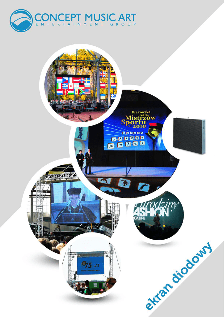 Ekrany diodowe telebimy LED Ekrany LED rentalowe rozdzielczości piksel realny P10 w rozmiarze kabinetu 96cm x 96cm. Ekrany diodowe są znakomitym sposobem na reklamę lub zwrócenie uwagi na dane wydarzenie. Ściany LED to wielkoformatowe powierzchnie projekcyjne zarówno do zastosowań zewnętrznych jak i wewnętrznych. Całkowita konfiguracja kształtu i formatu budowanego ekranu daje niesamowite możliwości przy różnego rodzaju projekcjach multimedialnych, a także jako element dekoracji lub aranżacji scenicznej. Ekran LED może zostać podwieszony na specjalnie przygotowanej konstrukcji lub postawiony na podstawach, co znacznie ułatwia dopasowanie produktu do wyznaczonego miejsca lub potrzeb klienta. Może zostać użyty także w formie band ledowych na wszelkiego rodzaju wydarzeniach sportowych. Ekran budowany jest z modułów zwanych “kabinetami” – każdy z nich ma rozmiar 96 cm x 96 cm, co jednocześnie przekłada się na rozdzielczość rzeczywistą wyświetlanego obrazu (jeden centymetr odpowiada jednemu pikselowi). Przykładowo ekran o rozmiarach 4m x 3m będzie miał rozdzielczość 384px na 288px. Sygnał wideo dostarczany do ekranu przetwarzany jest przez procesor graficzny TVOne. Rozdzielczość (do 1920×1280) jak i rodzaj przyjmowanego sygnału są dowolne (SDI, HD-SDI, DVI-D, RGBHV, RGB, Component, Compozyt, S-Video). Głównym zadaniem procesora jest dopasowanie (przeskalowanie) przyjmowanego sygnału do rozdzielczości fizycznej zbudowanego ekranu. Możliwości konfiguracyjne przy tego typu urządzeniach są ogromne, dają szereg możliwości przy wycinaniu dowolnego skrawka obrazu, powiększaniu jak i przy standardowym skalowaniu. Całość zestawu, konfigurowana jest za pomocą komputera ze specjalnym oprogramowaniem, które pozwala zmieniać temperaturę barw wyświetlanego obrazu lub zaprogramować czasowe ustawienie jasności ekranu (do 7500 cd/m2). Jeden element waży 52 kg a całkowity pobór mocy to około 1kW/m2 przy pełnej jasności. Ekran diodowy - cena za m2 250,00 Bandy diodowe - cena za mb 150,00 powyższe koszty nie zawierają kosztów konstrukcji oraz transportu zapraszamy do zapoznania się z ofertą pełnego systemu bankietowo estradowego zawierającego między innymi hale namiotową, meble, wyposażenie cateringowege | link do strony www „Projekt współfinansowany przez Unię Europejską w ramach Małopolskiego Regionalnego Programu Operacyjnego na lata 2007 -2013 współfinansowanego z Europejskiego Funduszu Rozwoju Regionalnego”