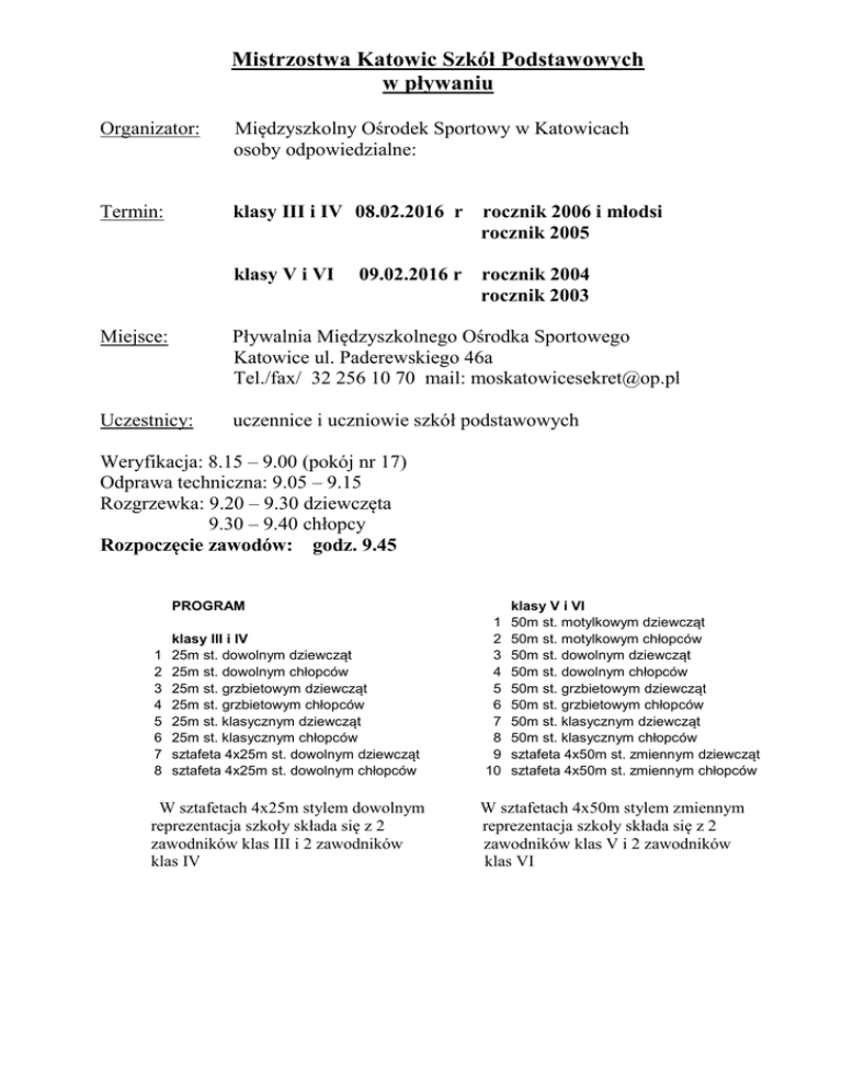 Mistrzostwa Katowic Szkół Podstawowych w pływaniu Organizator: Międzyszkolny Ośrodek Sportowy w Katowicach osoby odpowiedzialne: Termin: klasy III i IV 08.02.2016 r rocznik 2006 i młodsi rocznik 2005 klasy V i VI 09.02.2016 r rocznik 2004 rocznik 2003 Miejsce: Pływalnia Międzyszkolnego Ośrodka Sportowego Katowice ul. Paderewskiego 46a Tel./fax/ 32 256 10 70 mail: [email protected] Uczestnicy: uczennice i uczniowie szkół podstawowych Weryfikacja: 8.15 – 9.00 (pokój nr 17) Odprawa techniczna: 9.05 – 9.15 Rozgrzewka: 9.20 – 9.30 dziewczęta 9.30 – 9.40 chłopcy Rozpoczęcie zawodów: godz. 9.45 PROGRAM 1 2 3 4 5 6 7 8 klasy III i IV 25m st. dowolnym dziewcząt 25m st. dowolnym chłopców 25m st. grzbietowym dziewcząt 25m st. grzbietowym chłopców 25m st. klasycznym dziewcząt 25m st. klasycznym chłopców sztafeta 4x25m st. dowolnym dziewcząt sztafeta 4x25m st. dowolnym chłopców W sztafetach 4x25m stylem dowolnym reprezentacja szkoły składa się z 2 zawodników klas III i 2 zawodników klas IV 1 2 3 4 5 6 7 8 9 10 klasy V i VI 50m st. motylkowym dziewcząt 50m st. motylkowym chłopców 50m st. dowolnym dziewcząt 50m st. dowolnym chłopców 50m st. grzbietowym dziewcząt 50m st. grzbietowym chłopców 50m st. klasycznym dziewcząt 50m st. klasycznym chłopców sztafeta 4x50m st. zmiennym dziewcząt sztafeta 4x50m st. zmiennym chłopców W sztafetach 4x50m stylem zmiennym reprezentacja szkoły składa się z 2 zawodników klas V i 2 zawodników klas VI REGULAMIN Zawody zostaną przeprowadzone zgodnie z przepisami PZP. Każdy zawodnik ma prawo startu w jednej (1) konkurencji indywidualnej i sztafecie Szkoła może wystawić reprezentację z 4 dziewcząt i 4 chłopców w każdym roczniku. Szkoła może wystawić tylko jedną drużynę chłopców i dziewcząt. Zawody przeprowadzone zostaną seriami na czas, rozstawienia zawodników w poszczególnych seriach dokona sędzia – kierownik wyścigów. 6. Zgłoszenie do zawodów według załączonego wzoru należy dostarczyć przed rozpoczęciem zawodów do biura zawodów – pokój nr 17 (weryfikacja) 7. Każdy uczestnik zawodów musi posiadać pisemną zgodę rodziców (według aktualnego wzoru) na udział w zawodach (zaświadczenia lekarskie nie będą rozpatrywane!!!) 8. Przed każdą konkurencją uczestnik zawodów zgłasza się do sędziego z CZYTELNIE wypełnioną kartą startową (wzór w załączniku). Karty startowe należy wypełniać czytelnym pismem, karty startowe nieczytelne nie będą brane pod uwagę przy klasyfikacji. 9. Trzech najlepszych zawodników zostanie nagrodzonych dyplomami w każdej konkurencji, osobno dla każdego rocznika. 10. Szkoła której reprezentacja zdobędzie największą ilość punktów otrzyma puchar, który zostanie wręczony na uroczystości podsumowującej współzawodnictwo sportowe szkół Miasta Katowice za rok szkolny 2015/2016. Punktację prowadzi się oddzielnie dla chłopców i dziewcząt. 11. Punktacja drużynowa: Punktację prowadzi się według zajętych miejsc w poszczególnych konkurencjach: 1m – 20pkt, 2m – 18pkt., 3m – 17pkt., 4m – 16pkt……. W sztafetach j.w. 1. 2. 3. 4. 5. UWAGI KOŃCOWE 1. Po rozpoczęciu zawodów szatnie zostaną zamknięte. 2. Parking dla samochodów itp. znajduje się na ul. Paderewskiego, a nie przed budynkiem MOS-u. 3. Proszę o potwierdzenie udziału do 03.02.2016 r.