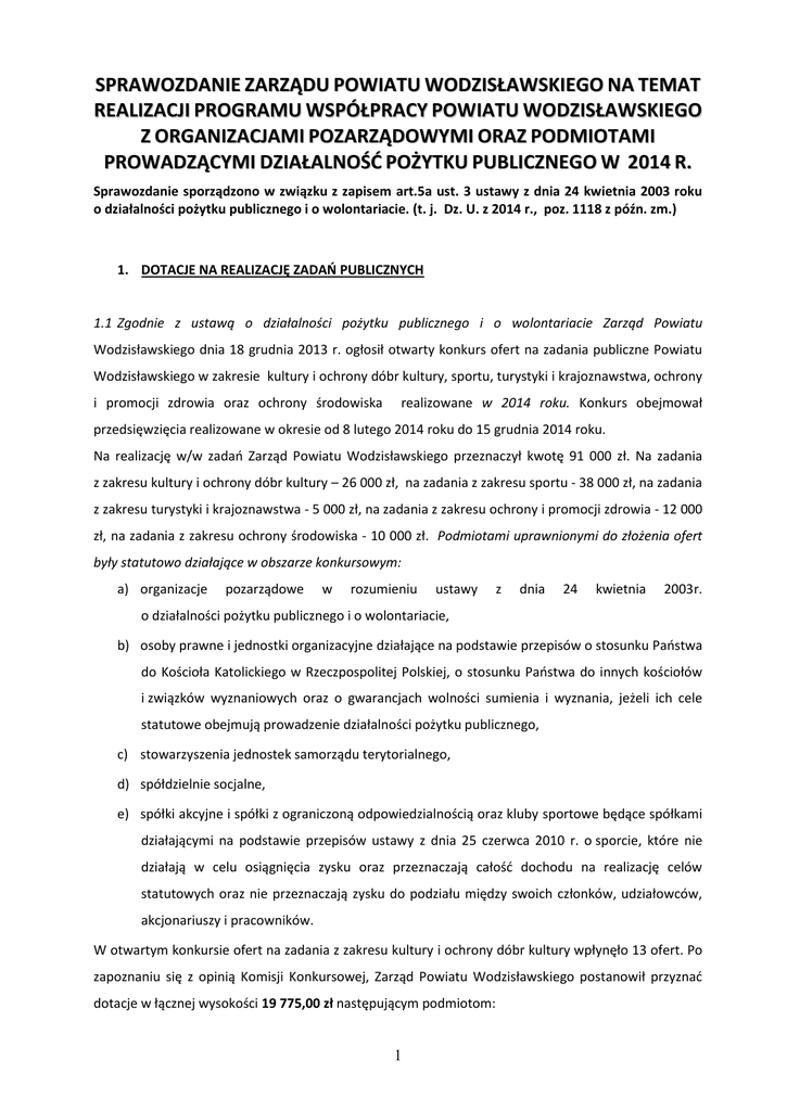 SPRAWOZDANIE ZARZĄDU POWIATU WODZISŁAWSKIEGO NA TEMAT REALIZACJI PROGRAMU WSPÓŁPRACY POWIATU WODZISŁAWSKIEGO Z ORGANIZACJAMI POZARZĄDOWYMI ORAZ PODMIOTAMI PROWADZĄCYMI DZIAŁALNOŚĆ POŻYTKU PUBLICZNEGO W 2014 R. Sprawozdanie sporządzono w związku z zapisem art.5a ust. 3 ustawy z dnia 24 kwietnia 2003 roku o działalności pożytku publicznego i o wolontariacie. (t. j. Dz. U. z 2014 r., poz. 1118 z późn. zm.) 1. DOTACJE NA REALIZACJĘ ZADAŃ PUBLICZNYCH 1.1 Zgodnie z ustawą o działalności pożytku publicznego i o wolontariacie Zarząd Powiatu Wodzisławskiego dnia 18 grudnia 2013 r. ogłosił otwarty konkurs ofert na zadania publiczne Powiatu Wodzisławskiego w zakresie kultury i ochrony dóbr kultury, sportu, turystyki i krajoznawstwa, ochrony i promocji zdrowia oraz ochrony środowiska realizowane w 2014 roku. Konkurs obejmował przedsięwzięcia realizowane w okresie od 8 lutego 2014 roku do 15 grudnia 2014 roku. Na realizację w/w zadań Zarząd Powiatu Wodzisławskiego przeznaczył kwotę 91 000 zł. Na zadania z zakresu kultury i ochrony dóbr kultury – 26 000 zł, na zadania z zakresu sportu - 38 000 zł, na zadania z zakresu turystyki i krajoznawstwa - 5 000 zł, na zadania z zakresu ochrony i promocji zdrowia - 12 000 zł, na zadania z zakresu ochrony środowiska - 10 000 zł. Podmiotami uprawnionymi do złożenia ofert były statutowo działające w obszarze konkursowym: a) organizacje pozarządowe w rozumieniu ustawy z dnia 24 kwietnia 2003r. o działalności pożytku publicznego i o wolontariacie, b) osoby prawne i jednostki organizacyjne działające na podstawie przepisów o stosunku Państwa do Kościoła Katolickiego w Rzeczpospolitej Polskiej, o stosunku Państwa do innych kościołów i związków wyznaniowych oraz o gwarancjach wolności sumienia i wyznania, jeżeli ich cele statutowe obejmują prowadzenie działalności pożytku publicznego, c) stowarzyszenia jednostek samorządu terytorialnego, d) spółdzielnie socjalne, e) spółki akcyjne i spółki z ograniczoną odpowiedzialnością oraz kluby sportowe będące spółkami działającymi na podstawie przepisów ustawy z dnia 25 czerwca 2010 r. o sporcie, które nie działają w celu osiągnięcia zysku oraz przeznaczają całość dochodu na realizację celów statutowych oraz nie przeznaczają zysku do podziału między swoich członków, udziałowców, akcjonariuszy i pracowników. W otwartym konkursie ofert na zadania z zakresu kultury i ochrony dóbr kultury wpłynęło 13 ofert. Po zapoznaniu się z opinią Komisji Konkursowej, Zarząd Powiatu Wodzisławskiego postanowił przyznać dotacje w łącznej wysokości 19 775,00 zł następującym podmiotom: 1 Lp. 1. 2. Tytuł zadania Przyznana kwota dotacji „Taniec naszą pasją-powiatowe spotkania taneczne” 6 120,00 „Symfoniczne poniedziałki” 5 050,00 Nazwa podmiotu Stowarzyszenie Sympatyków Zespołu Tanecznego Miraż z siedzibą w Wodzisławiu Śląskim Wodzisławski Uniwersytet Trzeciego Wieku z siedzibą w Wodzisławiu Śląskim 3. Stowarzyszenie „Vladislavia” z siedzibą w Skrbeńsku Konkurs gawędziarski „Fedrowanie w godce” 2 100,00 4. Stowarzyszenie Florystów Polskich z siedzibą w Turzy Śląskiej „Floryści dzieciom” 6 505,00 W otwartym konkursie ofert na realizację zadań publicznych w zakresie sportu wpłynęło 20 ofert. Po zapoznaniu się z opinią Komisji Konkursowej, Zarząd Powiatu Wodzisławskiego przyznał dotacje w łącznej wysokości 45 000,00 zł* następującym podmiotom: Tytuł zadania Przyznana kwota dotacji Lp. Nazwa podmiotu 1. Siatkarski Klub „Górnik Radlin” z siedzibą w Radlinie 2. Uczniowski Klub Sportowy „Diament Jedynka” z siedzibą w Wodzisławiu Śląskim 3. Rybnicki Młodzieżowy Klub Sportowy z siedzibą w Rybniku 4. Uczniowski Klub Sportowy „Feniks” z siedzibą w Rydułtowach Mistrzostwa Powiatu Wodzisławskiego „Rower to zdrowie” 3 900,00 5. Klub Sportowy „Wicher Wilchwy” z siedzibą w Wodzisławiu Śląskim „Powiatowy festiwal piłki nożnej szkól podstawowych” 5 250,00 6. Stowarzyszenie „Czyń dobro” na rzecz niepełnosprawnych uczniów i absolwentów szkól i placówek specjalnych z siedzibą w Wodzisławiu Śląskim „III Powiatowy Integracyjny Turniej w Kręgle dla osób niepełnosprawnych intelektualnie” 1 515,00 7. Uczniowski Klub Sportowy „SPARTA” Czyżowice z siedzibą w Czyżowicach 8. Młodzieżowy Klub Piłkarski ODRA CENTRUM z siedzibą w „Grand Prix Starosty Wodzisławskiego w siatkówce plażowej” „VI Mistrzostwa Szkół Ponadgimnazjalnych w lekkiej atletyce” „Młodzieżowy Turniej BokserkiMemoriał prof. Antoniego Motyczki” „Organizacja Otwartych Mistrzostw Śląska w średniodystansowym biegu na orientację „Powiatowy Turniej Tenisa Ziemnego Dzieci i Młodzieży” 2 6 270,00 2 580,00 4 250,00 5 500,00 1 920,00 Wodzisławiu Śląskim Związek Harcerstwa Polskiego „Organizacja XIX Radlińskiego 9. Chorągiew Śląska Hufiec Ziemi 3 220,00 Biegu Ekologicznego” Wodzisławskiej Młodzieżowy Klub Sportowy „Turniej Piłki Siatkowej 10. „ZORZA” Wodzisław Śląski z 4 095,00 Pożegnanie Lata 2014” siedzibą w Wodzisławiu Śląskim Uczniowski Międzyszkolny Klub „Puchar Śląska i Ogólnopolskie 11. Sportowy Marklowice z siedzibą Spotkanie UKS w biegach na 3 000,00 w Marklowicach nartorolkach” Ludowy Klub Sportowy „UNIA” „Turniej Mikołajkowy Młodzików 12. Turza Śląska z siedzibą w Turzy 1 500,00 w Piłce nożnej” Śląskiej Młodzieżowy Klub Piłkarski ODRA 13. CENTRUM z siedzibą w „Błękitna Wstęga Balatonu” 2 000,00 Wodzisławiu Śląskim** *zgodnie z decyzją Zarządu kwota wskazana w ogłoszeniu konkursowym została zwiększona o kwotę 7 000 zł ** Klub zrezygnował z dotacji na realizację zadania W otwartym konkursie ofert z zakresu ochrony i promocji zdrowia wpłynęło 5 ofert. Po zapoznaniu się z opinią Komisji Konkursowej Zarząd Powiatu przyznał dotację 2 podmiotom w 