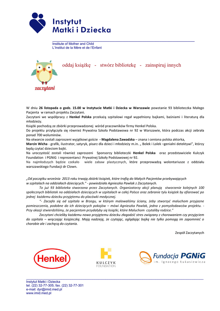 _____________________________________________________________________________ Institute of Mother and Child L’Institut de la Mère et de l’Enfant oddaj książkę - stwórz bibliotekę - zainspiruj innych W dniu 26 listopada o godz. 15.00 w Instytucie Matki i Dziecka w Warszawie powstanie 93 biblioteczka Małego Pacjenta w ramach projektu Zaczytani. Zaczytani we współpracy z Henkel Polska przekażą szpitalowi regał wypełniony bajkami, baśniami i literaturą dla młodzieży. Książki pochodzą ze zbiórki przeprowadzonej wśród pracowników firmy Henkel Polska. Do projektu przyłączyła się również Prywatna Szkoła Podstawowa nr 92 w Warszawie, która podczas akcji zebrała ponad 700 woluminów. Na otwarcie zostali zaproszeni wyjątkowi goście - Magdalena Zawadzka – znana i ceniona polska aktorka, Marcin Wicha - grafik, ilustrator, satyryk, pisarz dla dzieci i młodzieży m.in. „ Bolek i Lolek –genialni detektywi”, którzy będą czytać dzieciom bajki. Na uroczystość zostali również zaproszeni Sponsorzy biblioteczki Henkel Polska oraz przedstawiciele Kulczyk Foundation i PGNiG i reprezentanci Prywatnej Szkoły Podstawowej nr 92. Na najmłodszych będzie czekało wiele zabaw plastycznych, które przeprowadzą wolontariusze z oddziału warszawskiego Fundacji dr Clown. „Od początku września 2013 roku trwają zbiórki książek, które trafią do Małych Pacjentów przebywających w szpitalach na oddziałach dziecięcych.” - powiedziała Agnieszka Pawlak z Zaczytanych. To już 93 biblioteka stworzona przez Zaczytanych. Organizatorzy akcji planują stworzenie kolejnych 100 społecznych bibliotek na oddziałach dziecięcych w szpitalach w całej Polsce oraz zebranie tylu książek by ofiarować po jednej każdemu dziecku przyjętemu do placówki medycznej. “- Zaczęło się od szpitala w Brzegu, w którym malowaliśmy ściany, żeby stworzyć maluchom przyjazne pomieszczenia, podobne do ich dziecięcych pokojów – mówi Agnieszka Pawlak, jedna z pomysłodawców projektu. Przy okazji stwierdziliśmy, że pacjentom przydałyby się książki, które Maluchom czytaliby rodzice.” Zaczytani chcieliby każdemu nowo przyjętemu dziecku złagodzić stres związany z chorowaniem czy przyjęciem do szpitala – wręczając książeczkę. Mają nadzieję, że czytając, oglądając bajkę nie tylko pomogą im zapomnieć o chorobie ale i zachęcą do czytania. Zespół Zaczytanych ________________________________________________________________________________________________ Instytut Matki i Dziecka tel. (22) 32-77-305; fax. (22) 32-77-301 e-mail: [email protected] www.imid.med.pl