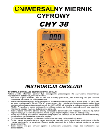 UNIWERSALNY MIERNIK CYFROWY CHY 38 INSTRUKCJA OBSŁUGI INFORMACJE DOTYCZĄCE BEZPIECZEŃSTWA OBSŁUGI Podane poniżej informacje powinny być bezwzględnie przestrzegane dla zapewnienia maksymalnego bezpieczeństwa podczas użytkowania miernika: 1. Nie wolno używać miernika, jeśli on sam lub przewody pomiarowe, jest uszkodzony lub, jeśli zachodzi podejrzenie, że miernik nie pracuje właściwie. 2. Miernik ten nie powinien być wykorzystywany do pomiarów wysokonapięciowych w przemyśle, np. nie poleca się go do pomiarów 440V AC lub 600V AC przemysłowych sieci zasilających. Multimetr najlepiej nadaje się do pomiarów obwodowych niskoenergetycznych do 600V AC/DC lub obwodów wysokoenergetycznych do 250V AC/DC. Przypadkowe, błędne podłączenie wysokiego napięcia ze źródła o wysokiej energii przy ustawieniu miernika na zakresie mA może być przyczyną porażenia. 3. Jeżeli w czasie testowania obwodu chcemy jednocześnie dokonywać w nim rozłączeń, rozlutowań itp. należy najpierw odłączyć zasilanie tego obwodu. Nawet prąd o małym natężeniu może być niebezpieczny. 4. Należy być ostrożny przy pracy z napięciami powyżej 60V DC (stałe) i 30V ACrms (przemienne skuteczne). Napięcia te mogą spowodować porażenie prądem. 5. Podczas pomiarów sondami pomiarowymi, należy trzymać palce za barierami ochronnymi. 6. Pomiar napięć przewyższających zakres pomiarowy miernika może spowodować uszkodzenie miernika i naraża użytkownika na porażenie. Zawsze należy zapoznać się z limitem napięcia podanym na płycie czołowej miernika. 7. Jeżeli miernik nie jest używany zgodnie z zaleceniami producenta, mogą ulec uszkodzeniu jego zabezpieczenia. DANE OGÓLNE Wyświetlacz: 3½ cyfry, LCD z max wskazaniem 1999 Próbkowanie: 2,5x /sekundę Polaryzacja: automatyczna, wskazanie ujemnej polaryzacji (-) Przekroczenie zakresu: wyświetlany komunikat „OL” Temperatura pracy: 0°C÷40°C, wilgotność względna RH<70% Temperatura przechowywania: -20°C÷60°C, wilgotność względna RH<80%, wyjęta bateria Bezpieczeństwo: Zgodne z EN61010-1 KAT II 600V, stopień zanieczyszczenia 2 Dokładności określone dla: Temperatura 23°C±5°C, wilgotność: RH<75% Dokładność jest podawana jako: ± (% wartości wskazania + liczba najmniej znaczących cyfr) Zasilanie: bateria 9V NEDA1604 (JIS 006P, IEC 6F22) Żywotność baterii: 200 godzin dla typowej baterii cynkowej Wymiary i waga: 132x73x34 [mm], ok.255g z baterią Wyposażenie: para przewodów pomiarowych, zapasowy bezpiecznik (w mierniku), bateria 9V, instrukcja obsługi Napięcie przemienne ACV (50Hz-500Hz) Zakres 200,0mV 2,000V 20,00V 200,0V 600V Zabezpieczenie: Zakres: 0-1000 Prąd bazy: ok.10µA DC (VCE =3,0V DC) Rezystancja Rozdzielczość Dokładność 200,0Ω 0,1Ω 0,8% + 3c 2,000kΩ 1Ω 20,00kΩ 10Ω 0,8% + 1c 200,0kΩ 100Ω 2000kΩ 1kΩ 20,00MΩ 10kΩ 3,0% + 4c 200,0MΩ 100kΩ 5,0% - 10c Zabezpieczenie: 500VDC/VACrms Zakres Rozdzielczość Dokładność 200,0µA 0,1µA 2,000mA 1µA 1,0% + 1c 20,00mA 10µA 200,0mA 100µA 10,00A 10mA 3,0% + 1c Zabezpieczenie: 0,5A/250V bezpiecznik szybki 10A bez bezpiecznika Napięcie jałowe 3,0VDC 0,3VDC 3,0VDC Częstotliwość Rozdzielczoś Dokładność ć 2,000kHz 1Hz 20,00kHz 10Hz 0,1% + 1c 200,0kHz 100Hz 2000kHz 1kHz 15,00MHz 10kHz Zabezpieczenie: 500VDC/VACrms Prąd przemienny ACA Zakres Zakres Rozdzielczość Dokładność 200,0µA 0,1µA 2,000mA 1µA 1,5% + 4c 20,00mA 10µA 200,0mA 100µA 10,00A 10mA 3,5% + 4c Zabezpieczenie: 0,5A/250V bezpiecznik szybki 10A bez bezpiecznika Czułość min. 1,0Vrms (tylko sygnał TTL) Pojemność Napięcie stałe DCV 200,0mV 2,000V 20,00V 200,0V 600V Zabezpieczenie: 0,1mV 1mV 1,0% + 4c 10MΩ 10mV 100mV 1V 500VDC/VACrms na zakresie 200mV 600VDC/VACrms na pozostałych zakresach Pomiar hFE tranzystora Prąd stały DCA Dokładność Impedancja wejściowa Prąd testujący: 1mA ± 0,6mA Dokładność: 3,0% + 3c Napięcie jałowe: 3,0VDC Sygnalizacja dźwiękowa: <30Ω Zabezpieczenie: 500VDC/VACrms Zakres Rozdzielczość Dokładność Test diod i ciągłości połączeń SPECYFIKACJA ELEKTRYCZNA Zakres Rozdzielczość Zakres 2,000nF 20,00nF 200,0nF 2,000µF 20,00µF Impedancja wejściowa 0,1mV 1mV 0,5% + 1c 10MΩ 10mV 100mV 1V 500VDC/VACrms na zakresie 200mV 600VDC/VACrms na pozostałych zakresach Rozdzielczość 1pF 10pF 100pF 1nF 10nF Dokładność 2,0% + 10c POMIARY Przed dokonaniem pomiarów należy przeczytać informacje dotyczące bezpieczeństwa obsługi. Należy zawsze sprawdzać, czy miernik nie jest uszkodzony, zanieczyszczony (brud, smar). Należy sprawdzić przewody pomiarowe (pęknięcia, przetarcia izolacji). Jeśli stwierdzone zostanie któreś z powyższych uszkodzeń, nie powinno się wykonywać żadnych pomiarów. Funkcja MAX Wciśnięcie przycisku Max/Min spowoduje wejście w tryb zatrzymania na wyświetlaczu wartości maksymalnej. Dodatkowo na wyświetlaczu pojawi się symbol MAX – wartość wyświetlana na wyświetlaczu to wartość maksymalna. Jeśli wartość pomierzona w danej chwili jest wyższa od aktualnie wyświetlanej maksymalnej, to nowa wartość zostanie wartością maksymalną. Wartość większa oznacza tu wartość o większej wartości bezwzględnej. 2 Funkcja MAX dostępna jest także podczas pomiaru częstotliwości. W tym przypadku funkcja autozakresu nie działa. Przycisk rodzaju napięcia Przycisk ten umożliwia wybór stałego lub przemiennego przebiegu przy pomiarach prądu i napięcia. Pomiar napięcia stałego DCV i przemiennego ACV 1. Czerwony przewód pomiarowy podłączyć do gniazda „VΩA”, natomiast czarny przewód pomiarowy do gniazda „COM”. 2. Przełącznikiem zakresów/funkcji wybrać pomiar napięcia i odpowiedni zakres, a przyciskiem jego rodzaj (ACV~ / DCV-). 3. Przyłożyć sondy pomiarowe do punktów pomiarowych. Jeśli wartość do zmierzenia nie jest orientacyjnie znana, należy rozpocząć pomiar na najwyższym zakresie pomiarowym, sukcesywnie go obniżając do uzysk