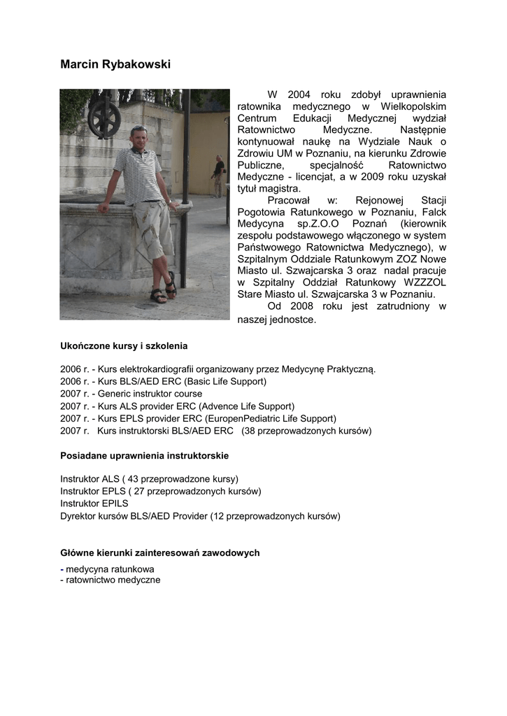 Marcin Rybakowski W 2004 roku zdobył uprawnienia ratownika medycznego w Wielkopolskim Centrum Edukacji Medycznej wydział Ratownictwo Medyczne. Następnie kontynuował naukę na Wydziale Nauk o Zdrowiu UM w Poznaniu, na kierunku Zdrowie Publiczne, specjalność Ratownictwo Medyczne - licencjat, a w 2009 roku uzyskał tytuł magistra. Pracował w: Rejonowej Stacji Pogotowia Ratunkowego w Poznaniu, Falck Medycyna sp.Z.O.O Poznań (kierownik zespołu podstawowego włączonego w system Państwowego Ratownictwa Medycznego), w Szpitalnym Oddziale Ratunkowym ZOZ Nowe Miasto ul. Szwajcarska 3 oraz nadal pracuje w Szpitalny Oddział Ratunkowy WZZZOL Stare Miasto ul. Szwajcarska 3 w Poznaniu. Od 2008 roku jest zatrudniony w naszej jednostce. Ukończone kursy i szkolenia 2006 r. - Kurs elektrokardiografii organizowany przez Medycynę Praktyczną. 2006 r. - Kurs BLS/AED ERC (Basic Life Support) 2007 r. - Generic instruktor course 2007 r. - Kurs ALS provider ERC (Advence Life Support) 2007 r. - Kurs EPLS provider ERC (EuropenPediatric Life Support) 2007 r. Kurs instruktorski BLS/AED ERC (38 przeprowadzonych kursów) Posiadane uprawnienia instruktorskie Instruktor ALS ( 43 przeprowadzone kursy) Instruktor EPLS ( 27 przeprowadzonych kursów) Instruktor EPILS Dyrektor kursów BLS/AED Provider (12 przeprowadzonych kursów) Główne kierunki zainteresowań zawodowych - medycyna ratunkowa - ratownictwo medyczne