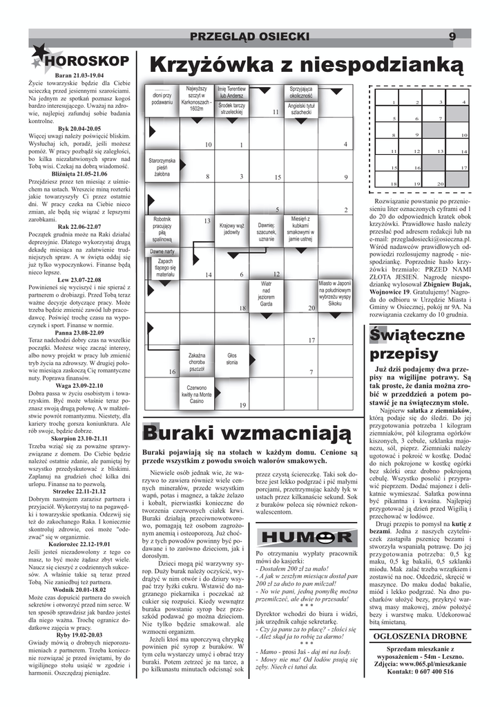 9 PRZEGL!D OSIECKI HOROSKOP Baran 21.03-19.04 !ycie towarzyskie b"dzie dla Ciebie ucieczk# przed jesiennymi szaro$ciami. Na jednym ze spotka% poznasz kogo$ bardzo interesuj#cego. Uwa&aj na zdrowie, najlepiej zafunduj sobie badania kontrolne. Byk 20.04-20.05 m. Wi"cej uwagi nale&y po$wi"ci' bliskim. Wys(uchaj ich, porad), je$li mo&esz esz pomó&. W pracy pozb#d) si" zaleg(o$ci, ci, bo kilka nieza(atwionych spraw nad Tob# wisi. Czekaj na dobr# wiadomo$'. Bli!ni"ta 21.05-21.06 Przejdziesz przez ten miesi#c z u$mie-chem na ustach. Wreszcie min# rozterki ki ie jakie towarzyszy(y Ci przez ostatnie dni. W pracy czeka na Ciebie nieco co zmian, ale b"d# si" wi#za' z lepszymi mi zarobkami. Rak 22.06-22.07 Pocz#tek grudnia mo&e na Raki dzia(a'' depresyjnie. Dlatego wykorzystaj drug## dekad" miesi#ca na za(atwienie trud-niejszych spraw. A w $wi"ta oddaj si"" ju& tylko wypoczynkowi. Finanse b"d## nieco lepsze. Lew 23.07-22.08 Powiniene$ si" wyciszy' i nie spiera' z partnerem o drobiazgi. Przed Tob# teraz wa&ne decyzje dotycz#ce pracy. Mo&e trzeba b"dzie zmieni' zawód lub pracodawc". Po$wi"' troch" czasu na wypoczynek i sport. Finanse w normie. Panna 23.08-22.09 Teraz nadchodzi dobry czas na wszelkie pocz#tki. Mo&esz wi"c zacz#' interesy, albo nowy projekt w pracy lub zmieni' tryb &ycia na zdrowszy. W drugiej po(owie miesi#ca zaskocz# Ci" romantyczne nuty. Poprawa finansów. Waga 23.09-22.10 Dobra passa w &yciu osobistym i towarzyskim. By' mo&e w(a$nie teraz poznasz swoj# drug# po(ow". A w ma(&e%stwie powrót romantyzmu. Niestety, dla kariery troch" gorsza koniunktura. Ale rób swoje, b"dzie dobrze. Skorpion 23.10-21.11 Trzeba wzi#' si" za powa&ne sprawyzwi#zane z domem. Do Ciebie b"dzie nale&e' ostatnie zdanie, ale pami"taj by wszystko przedyskutowa' z bliskimi. Zaplanuj na grudzie% cho' kilka dni urlopu. Finanse na to pozwol#. Strzelec 22.11-21.12 Dobrym nastrojem zarazisz partnera i przyjació(. Wykorzystaj to na pogaw"dki i towarzyskie spotkania. Odezwij si" te& do zakochanego Raka. I koniecznie skontroluj zdrowie, co$ mo&e "odezwa'" si" w organizmie. Kozioro#ec 22.12-19.01 Je$li jeste$ niezadowolony z tego co masz, to by' mo&e &#dasz zbyt wiele. Naucz si" cieszy' z codziennych sukcesów. A w(a$nie takie s# teraz przed Tob#. Nie zaniedbuj te& partnera. Wodnik 20.01-18.02 Mo&e czas dopu$ci' partnera do swoich sekretów i otworzy' przed nim serce. W ten sposób sprawdzisz jak bardzo jeste$ dla niego wa&na. Troch" ogranicz dodatkowe zaj"cia w pracy. Ryby 19.02-20.03 Gwiady mówi# o drobnych nieporozumieniach z partnerem. Trzeba koniecznie rozwi#za' je przed $wi"tami, by do wigilijnego sto(u usi#$' w zgodzie i harmonii. Oszcz"dzaj pieni#dze. Krzy"ówka z niespodziank# ............ ..... przy d!oni przy waaniu podawaniu Najwy&szy szczyt w Karkonoszach 1602m IImi' mi' Terentiew Terenttiew lub lub AAndersz ndersz SSprzyjaj"ca przyj yjaajj"c "a ookoliczno#$ koliczno#$ ((rodek rodee tarczy strzeleckiej strz ze Angielski tytu! szlachecki 10 Starorzymska pie#% &a!obna 11 3 15 13 Krajowyy w"& "& wity jadowity Dawniej: niej e: szacunek, nek, uznanie nie 2 Miesi'% z kubkami smakowymi w jamie ustnej Dawne D awne nnarty arty Zapach tl"cego si' materia!u 6 14 18 12 Wiatr nad jeziorem Garda 20 Miasto w Japonii na po!udniowym wybrze&u wyspy Sikoku 16 Czerwono kwit!y na Monte Casino G!os s! s!onia 6 7 8 9 11 12 15 16 18 19 10 13 14 17 19 Buraki wzmacniaj# Buraki pojawiaj$ si" na sto%ach w ka#dym domu. Cenione s$ przede wszystkim z powodu swoich walorów smakowych. przez czyst# $ciereczk". Taki sok dobrze jest lekko podgrza' i pi' ma(ymi porcjami, przetrzymuj#c ka&dy (yk w ustach przez kilkana$cie sekund. Sok z buraków poleca si" równie& rekonwalescentom. HUM 20 Rozwi#zanie powstanie po przeniesieniu liter oznaczonych cyframi od 1 do 20 do odpowiednich kratek obok krzy&ówki. Prawid(owe has(o nale&y przes(a' pod adresem redakcji lub na e-mail: [email protected]. W$ród nadawców prawid(owych odpowiedzi rozlosujemy nagrod" - niespodziank". Poprzednie has(o krzy&ówki brzmia(o: PRZED NAMI Z*OTA JESIE+. Nagrod" niespodziank" wylosowa( Zbigniew Bujak, Wojnowice 19. Gratulujemy! Nagroda do odbioru w Urz"dzie Miasta i Gminy w Osiecznej, pokój nr 9A. Na rozwi#zania czekamy do 10 grudnia. Ju# dzi' podajemy dwa przepisy na wigilijne potrawy. S$ tak proste, #e dania mo#na zrobi( w przeddzie) a potem postawi( je na 'wi$tecznym stole. 7 Niewiele osób jednak wie, &e warzywo to zawiera równie& wiele cennych minera(ów, przede wszystkim wap%, potas i magnez, a tak&e &elazo i kobalt, pierwiastki konieczne do tworzenia czerwonych cia(ek krwi. Buraki dzia(aj# przeciwnowotworowo, pomagaj# te& osobom zagro&onym anemi# i osteoporoz#. Ju& cho'by z tych powodów powinny by' podawane i to zarówno dzieciom, jak i doros(ym. Dzieci mog# pi' warzywny syrop. Du&y burak nale&y oczy$ci', wydr#&y' w nim otwór i do dziury wsypa' trzy (y&ki cukru. Wstawi' do nagrzanego piekarnika i poczeka' a& cukier si" rozpu$ci. Kiedy wewn#trz buraka powstanie syrop bez przeszkód podawa' go mo&na dzieciom. Nie tylko b"dzie smakowa(. ale wzmocni organizm. Je&eli kto$ ma uporczyw# chrypk" powinien pi' syrop z buraków. W tym celu wystarczy umy' i obra' trzy buraki. Potem zetrze' je na tarce, a po kilkunastu minutach odcisn#' sok 5 4 $wi#teczne przepisy 17 Zaka)na )na choroobba ba choroba ppszczó! szczzó! 3 9 5 Robotnik pracuj"cy ppi!" i!" spalinow" sp palinow"" 2 4 1 8 1 R Po otrzymaniu wyp(aty pracownik mówi do kasjerki: - Dosta!em 200 z! za ma!o! - A jak w zesz!ym miesi"cu dosta! pan 200 z! za du#o to pan milcza!! - No wie pani, jedn" pomy!k$ mo#na przemilcze%, ale dwie to przesada! *** Dyrektor wchodzi do biura i widzi, jak urz"dnik ca(uje sekretark". - Czy ja panu za to p!ac$? - z!o&ci si$ - Ale# sk"d ja to robi$ za darmo! *** - Mamo - prosi Ja$ - daj mi na lody. - Mowy nie ma! Od lodów psuj" si$ z$by. Niech ci tatu& da. Najpierw sa%atka z ziemniaków, któr# podaje si" do $ledzi. Do jej przygotowania potrzeba 1 kilogram ziemniaków, pó( kilograma og