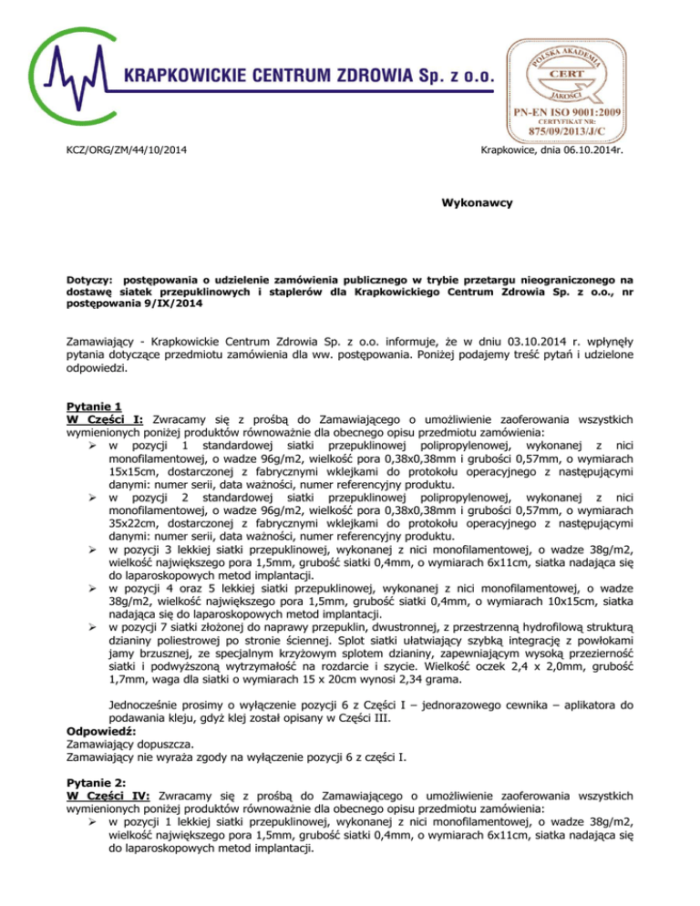KCZ/ORG/ZM/44/10/2014 Krapkowice, dnia 06.10.2014r. Wykonawcy Dotyczy: postępowania o udzielenie zamówienia publicznego w trybie przetargu nieograniczonego na dostawę siatek przepuklinowych i staplerów dla Krapkowickiego Centrum Zdrowia Sp. z o.o., nr postępowania 9/IX/2014 Zamawiający - Krapkowickie Centrum Zdrowia Sp. z o.o. informuje, że w dniu 03.10.2014 r. wpłynęły pytania dotyczące przedmiotu zamówienia dla ww. postępowania. Poniżej podajemy treść pytań i udzielone odpowiedzi. Pytanie 1 W Części I: Zwracamy się z prośbą do Zamawiającego o umożliwienie zaoferowania wszystkich wymienionych poniżej produktów równoważnie dla obecnego opisu przedmiotu zamówienia: w pozycji 1 standardowej siatki przepuklinowej polipropylenowej, wykonanej z nici monofilamentowej, o wadze 96g/m2, wielkość pora 0,38x0,38mm i grubości 0,57mm, o wymiarach 15x15cm, dostarczonej z fabrycznymi wklejkami do protokołu operacyjnego z następującymi danymi: numer serii, data ważności, numer referencyjny produktu. w pozycji 2 standardowej siatki przepuklinowej polipropylenowej, wykonanej z nici monofilamentowej, o wadze 96g/m2, wielkość pora 0,38x0,38mm i grubości 0,57mm, o wymiarach 35x22cm, dostarczonej z fabrycznymi wklejkami do protokołu operacyjnego z następującymi danymi: numer serii, data ważności, numer referencyjny produktu. w pozycji 3 lekkiej siatki przepuklinowej, wykonanej z nici monofilamentowej, o wadze 38g/m2, wielkość największego pora 1,5mm, grubość siatki 0,4mm, o wymiarach 6x11cm, siatka nadająca się do laparoskopowych metod implantacji. w pozycji 4 oraz 5 lekkiej siatki przepuklinowej, wykonanej z nici monofilamentowej, o wadze 38g/m2, wielkość największego pora 1,5mm, grubość siatki 0,4mm, o wymiarach 10x15cm, siatka nadająca się do laparoskopowych metod implantacji. w pozycji 7 siatki złożonej do naprawy przepuklin, dwustronnej, z przestrzenną hydrofilową strukturą dzianiny poliestrowej po stronie ściennej. Splot siatki ułatwiający szybką integrację z powłokami jamy brzusznej, ze specjalnym krzyżowym splotem dzianiny, zapewniającym wysoką przezierność siatki i podwyższoną wytrzymałość na rozdarcie i szycie. Wielkość oczek 2,4 x 2,0mm, grubość 1,7mm, waga dla siatki o wymiarach 15 x 20cm wynosi 2,34 grama. Jednocześnie prosimy o wyłączenie pozycji 6 z Części I – jednorazowego cewnika – aplikatora do podawania kleju, gdyż klej został opisany w Części III. Odpowiedź: Zamawiający dopuszcza. Zamawiający nie wyraża zgody na wyłączenie pozycji 6 z części I. Pytanie 2: W Części IV: Zwracamy się z prośbą do Zamawiającego o umożliwienie zaoferowania wszystkich wymienionych poniżej produktów równoważnie dla obecnego opisu przedmiotu zamówienia: w pozycji 1 lekkiej siatki przepuklinowej, wykonanej z nici monofilamentowej, o wadze 38g/m2, wielkość największego pora 1,5mm, grubość siatki 0,4mm, o wymiarach 6x11cm, siatka nadająca się do laparoskopowych metod implantacji. w pozycji 2 i 3 lekkiej siatki przepuklinowej, wykonanej z nici monofilamentowej, o wadze 38g/m2, wielkość największego pora 1,5mm, grubość siatki 0,4mm, o wymiarach 10x15cm, siatka nadająca się do laparoskopowych metod implantacji. Odpowiedź: Zamawiający dopuszcza. Pytanie 3: W Części V: Zwracamy się z prośbą do Zamawiającego o umożliwienie zaoferowania wszystkich wymienionych poniżej produktów równoważnie dla obecnego opisu przedmiotu zamówienia: w pozycji 1 zestawu składającego się z narzędzia do mocowania siatek metodą laparoskopową z 30 wchłanialnymi wkrętami, kompletem trokarów oraz siatki złożonej do naprawy przepuklin, dwustronnej, z przestrzenną hydrofilową strukturą dzianiny poliestrowej po stronie ściennej. Splot siatki ułatwiający szybką integrację z powłokami jamy brzusznej, ze specjalnym krzyżowym splotem dzianiny, zapewniającym wysoką przezierność siatki i podwyższoną wytrzymałość na rozdarcie i szycie. Wielkość oczek 2,4 x 2,0mm, grubość 1,7mm, waga dla siatki o wymiarach 15 x 20cm wynosi 2,34 grama. w pozycji 2 zestawu składającego się z narzędzia do mocowania siatek metodą laparoskopową z 30 wchłanialnymi wkrętami, kompletem trokarów oraz siatki złożona do naprawy przepuklin, dwustronna, z przestrzenną hydrofilową strukturą dzianiny poliestrowej po stronie ściennej. Splot siatki ułatwiający szybką integrację z powłokami jamy brzusznej, ze specjalnym krzyżowym splotem dzianiny, zapewniającym wysoką przezierność siatki i podwyższoną wytrzymałość na rozdarcie i szycie. Wielkość oczek 2,4 x 2,0mm, grubość 1,7mm, waga dla siatki o wymiarach 20 x 30cm wynosi 4,68 grama. w pozycji 3 zestawu składającego się z narzędzia do mocowania siatek metodą laparoskopową z 30 wchłanialnymi wkrętami, kompletem trokarów oraz siatki złożonej do naprawy przepuklin, dwustronnej, z przestrzenną hydrofilową strukturą dzianiny poliestrowej po stronie ściennej. Splot siatki ułatwiający szybką integrację z powłokami jamy brzusznej, ze specjalnym krzyżowym splotem dzianiny, zapewniającym wysoką przezierność siatki i podwyższoną wytrzymałość na rozdarcie i szycie. Wielkość oczek 2,4 x 2,0mm, grubość 1,7mm, waga dla siatki o wymiarach 15 x 20cm wynosi 2,34 grama. Odpowiedź: Zamawiający dopuszcza. Pytanie 4: W Części VI: Zwracamy się z prośbą do Zamawiającego o umożliwienie zaoferowania wszystkich wymienionych poniżej produktów równoważnie dla obecnego opisu przedmiotu zamówienia: w pozycji 1 staplerów okrężnych zakrzywionych, z automatyczną regulacją docisku zszywek, przeznaczonych do zabiegów na otwarto oraz do procedur laparoskopowych, w rozmiarze 25mm, 28mm, 31mm i 34mm (z łamanym kowadełkiem po oddaniu strzału dla bezpiecznego wyjęcia staplera przez nowoutworzone zespolenie) każdorazowo określanych przez Zamawiającego przy składaniu zamówienia; stapler dodatkowo posiada podziałkę