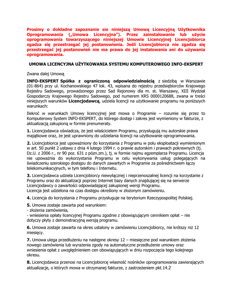 Prosimy o dokładne zapoznanie sie niniejszą Umową Licencyjną Użytkownika Oprogramowania („Umowa Licencyjna”). Przez zainstalowanie lub użycie oprogramowania towarzyszącego niniejszej Umowie Licencyjnej Licencjobiorca zgadza się przestrzegać jej postanowienia. Jeśli Licencjobiorca nie zgadza się przestrzegać jej postanowień nie ma prawa do jej instalowania ani do używania oprogramowania. UMOWA LICENCYJNA UŻYTKOWANIA SYSTEMU KOMPUTEROWEGO INFO-EKSPERT Zwana dalej Umową INFO-EKSPERT Spółka z ograniczoną odpowiedzialnością z siedzibą w Warszawie (01-864) przy ul. Kochanowskiego 47 lok. 43, wpisana do rejestru przedsiębiorców Krajowego Rejestru Sadowego, prowadzonego przez Sad Rejonowy dla m. st. Warszawy, XIII Wydział Gospodarczy Krajowego Rejestru Sadowego, pod numerem KRS 0000120688, zwana w treści niniejszych warunków Licencjodawcą, udziela licencji na użytkowanie programu na poniższych warunkach: Ilekroć w warunkach Umowy licencyjnej jest mowa o Programie – rozumie się przez to Komputerowy System INFO-EKSPERT, do którego dostęp i zakres jest wymieniony w fakturze, z aktualizacją zakupioną w formie prenumeraty. 1. Licencjodawca oświadcza, że jest właścicielem Programu, przysługują mu autorskie prawa majątkowe oraz, że jest uprawniony do udzielania licencji na użytkowanie oprogramowania. 2. Licencjobiorca jest upoważniony do korzystania z Programu w polu eksploatacji wymienionym w art. 50 punkt 2 ustawy z dnia 4 lutego 1994 r. o prawie autorskim i prawach pokrewnych (tj. Dz.U. z 2006 r., nr 90 poz. 631 z pózn.zm.), tj. w formie najmu egzemplarza Programu. Licencja nie upoważnia do wykorzystania Programu w celu wykonywania usług polegających na świadczeniu szerokiego dostępu do danych zawartych w Programie za pośrednictwem łączy telekomunikacyjnych, w tym telefonu i Internetu. 3. Licencjodawca udziela Licencjobiorcy niewyłącznej i nieprzenoszalnej licencji na korzystanie z Programu oraz do aktualizacji poprzez Internet bazy danych znajdującej się na serwerze Licencjodawcy o zawartości odpowiadającej zakupionej wersji Programu. Licencja jest udzielona na czas dostępu określony w złożonym zamówieniu. 4. Licencja do korzystania z Programu przysługuje na terytorium Rzeczypospolitej Polskiej. 5. Umowa zostaje zawarta pod warunkiem: - złożenia zamówienia, - wniesienia opłaty licencyjnej Programu zgodnie z obowiązującym cennikiem opłat – nie dotyczy płyty z demonstracyjną wersją programu. 6. Umowa zostaje zawarta na okres ustalony w zamówieniu Licencjobiorcy, nie krótszy niż 12 miesięcy. 7. Umowa ulega przedłużeniu na następne okresy 12 – miesięczne pod warunkiem złożenia nowego zamówienia lub wyrażenia zgody na automatyczne przedłużenie umowy oraz wniesienia opłat z uwzględnieniem cen obowiązujących w dniu rozpoczęcia tego kolejnego okresu. 8. Licencjodawca przenosi na Licencjobiorcę własność nośników oprogramowania zawierających aktualizacje, o których mowa w otrzymanej fakturze, z zastrzeżeniem pkt.14.2 9. Licencjodawca zobowiązuje się do: - udzielenia podstawowych wskazówek dotyczących zasad instalacji i obsługi Programu (instrukcja), - comiesięcznego przekazywania pakietu baz danych zgodnie z zamówieniem Licencjobiorcy, zawierających aktualne dane techniczne pojazdów i ich wartości, zgodnych z danymi zamieszczonymi w miesięcznikach „Pojazdy Samochodowe Wartości Rynkowe” części A i B. 10. Licencjobiorca otrzyma od Licencjodawcy kod aktywacyjny licencji umożliwiający korzystanie z oprogramowania na komputerze przeznaczonym do instalacji oprogramowania. Kod taki nadawany jest jeden raz. W uzasadnionych wypadkach jak np. awarii czy wymiany sprzętu, kod zostanie nadany powtórnie. 11. Wersja jednostanowiskowa oprogramowania określona w otrzymanej fakturze może być zainstalowana i używana tylko na jednym wybranym komputerze. Przeniesienie oprogramowania na inny komputer wymaga kontaktu z Licencjodawcą. 12. Wersja sieciowa oprogramowania może być używana jednocześnie na liczbie stanowisk określonej w otrzymanej fakturze. Sposób zabezpieczenia programu i instalacja są opisane w instrukcji obsługi programu znajdującym się na płycie DVD pod przyciskiem „INSTRUKCJA”. Licencjobiorca akceptuje wyżej wymieniony sposób zabezpieczenia. 13. Licencjobiorca otrzymuje w ramach pakietu startowego: - aktualną płytę instalacyjną zawierającą program do wyceny, bazę danych o pojazdach oraz program do automatycznej aktualizacji, - numer licencyjny oraz hasło umożliwiające przeprowadzenie aktywacji wstępnej, - instrukcje wykonania instalacji i aktywacji programu. 14. Licencjobiorca jest zobowiązany do korzystania z Programu zgodnie z instrukcją obsługi i przestrzegania wskazówek dotyczących zasad instalacji i obsługi Programu. 15. Licencjodawca nie ponosi odpowiedzialności odszkodowawczej w przypadku: - powstania uszkodzeń wywołanych wprowadzeniem przez Licencjobiorcę do Programu tzw. wirusów komputerowych, - wszelkiego rodzaju modyfikacji Programu lub jego połączenia z jakimkolwiek innym oprogramowaniem, dokonanym przez Licencjobiorcę lub osoby trzecie, - powstania kosztów lub strat wywołanych brakiem możliwości korzystania z Programu z przyczyn leżących po stronie Licencjobiorcy. 16. Każda licencja posiada indywidualny numer licencyjny ujęty w Rejestrze Licencjobiorców prowadzonym przez Licencjodawcę. Wprowadzenie zmiany numerów programów w trakcie trwania umowy przenosi warunki umowy na użytkowanie programów o nowych numerach, bez dodatkowych zmian umowy. 17. Licencjodawca udziela gwarancji na Program w okresie obowiązywania Umowy. Gwarancja obejmuje: - poprawność zapisu na nośnikach, - poprawność wykonania instrukcji obsługi, - usunięcie wad Programu lub wymiany Programu na wolny od wad w terminie 14 dni od dnia otrzymania przez Licencjodawcę pisemnego zgłoszenia usterki, - gwarancją nie są objęte wady lub us