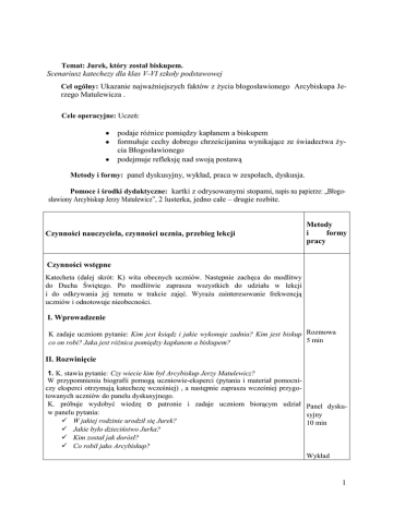 Temat: Jurek, który został biskupem. Scenariusz katechezy dla klas V-VI szkoły podstawowej Cel ogólny: Ukazanie najważniejszych faktów z życia błogosławionego Arcybiskupa Jerzego Matulewicza . Cele operacyjne: Uczeń: podaje różnice pomiędzy kapłanem a biskupem formułuje cechy dobrego chrześcijanina wynikające ze świadectwa życia Błogosławionego podejmuje refleksję nad swoją postawą Metody i formy: panel dyskusyjny, wykład, praca w zespołach, dyskusja. Pomoce i środki dydaktyczne: kartki z odrysowanymi stopami, napis na papierze: „Błogosławiony Arcybiskup Jerzy Matulewicz”, 2 lusterka, jedno całe – drugie rozbite. Czynności nauczyciela, czynności ucznia, przebieg lekcji Metody i formy pracy Czynności wstępne Katecheta (dalej skrót: K) wita obecnych uczniów. Następnie zachęca do modlitwy do Ducha Świętego. Po modlitwie zaprasza wszystkich do udziału w lekcji i do odkrywania jej tematu w trakcie zajęć. Wyraża zainteresowanie frekwencją uczniów i odnotowuje nieobecności. I. Wprowadzenie K zadaje uczniom pytanie: Kim jest ksiądz i jakie wykonuje zadnia? Kim jest biskup Rozmowa 5 min co on robi? Jaka jest różnica pomiędzy kapłanem a biskupem? II. Rozwinięcie 1. K. stawia pytanie: Czy wiecie kim był Arcybiskup Jerzy Matulewicz? W przypomnieniu biografii pomogą uczniowie-eksperci (pytania i materiał pomocniczy eksperci otrzymują katechezę wcześniej) , a następnie zaprasza wcześniej przygotowanych uczniów do panelu dyskusyjnego. K. próbuje wydobyć wiedzę o patronie i zadaje uczniom biorącym udział Panel dyskuw panelu pytania: syjny W jakiej rodzinie urodził się Jurek? 10 min Jakie było dzieciństwo Jurka? Kim został jak dorósł? Co robił jako Arcybiskup? Wykład 1 K. podsumowuje panel, stwierdzając, że młody Jurek jak każdy miał swoje pragnie- 10 min nia, marzenia, zamierzenia i cele. Sposobem na ich osiągnięcie była wytrwała praca nad własnym charakterem, kształtowanie w sobie pozytywnych cech i często niezgadzanie się na przeciętność i bylejakość. 2. Pan Bóg dał mu do wykonania bardzo ważne zadanie, by stawał się lepszym sam Praca w zei pomagał w tym innym. A my…? K dzieli klasę na 4 zespoły. Każda grupa otrzymuje kartki w kształcie stóp społach 10 min i polecenie: Co dziś może wnieść w nasze życie postać Błogosławionego Arcybiskupa? - wypiszcie cechy dobrego człowieka i chrześcijanina? Podczas pracy uczniów K. umieszcza na tablicy przygotowany napis. Następnie uczniowie przedstawiają efekty swojej pracy, umieszczając stopki na tablicy. K. podsumowuje pracę grup mówi, że ten Arcybiskup wbrew różnym przeciwnościom i problemom, realizował swoje chrześcijańskie życie. 3. K zaprasza uczniów do refleksji. Które cechy Błogosławionego Arcybiskupa zapadły ci najbardziej w pamięć? K pokazuje uczniom 2 lustra: całe lustro to życie w pełni chrześcijańskie, pobite – życie na swoją rękę, bez odniesienia do Boga – w nim obraz świata i siebie widzę w zniekształceniu. Zapis i modlitwa Zapis do zeszytu: Każdy człowiek ma swoje pragnienia, marzenia, 5 min zamierzenia i cele. Sposobem na ich osiągnięcie powinna być wytrwała praca nad własnym charakterem, kształtowanie w sobie pozytywnych cech i często niezgadzanie się na przeciętność i bylejakość. III. Zakończenie K. ustnie ocenia za wiedzę i aktywność. Uczniowie włączają się na zakończenie we wspólną modlitwę: Chwała Ojcu… Maria Kondzior 2