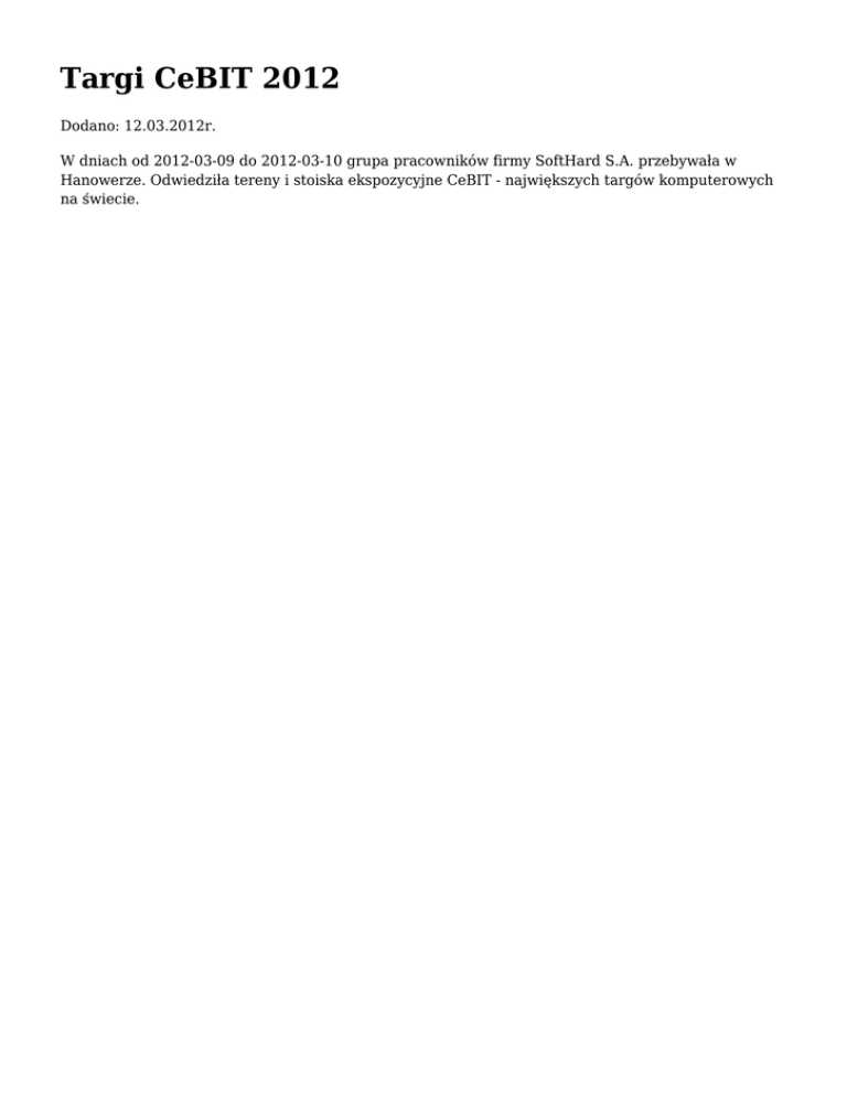 Targi CeBIT 2012 Dodano: 12.03.2012r. W dniach od 2012-03-09 do 2012-03-10 grupa pracowników firmy SoftHard S.A. przebywała w Hanowerze. Odwiedziła tereny i stoiska ekspozycyjne CeBIT - największych targów komputerowych na świecie.