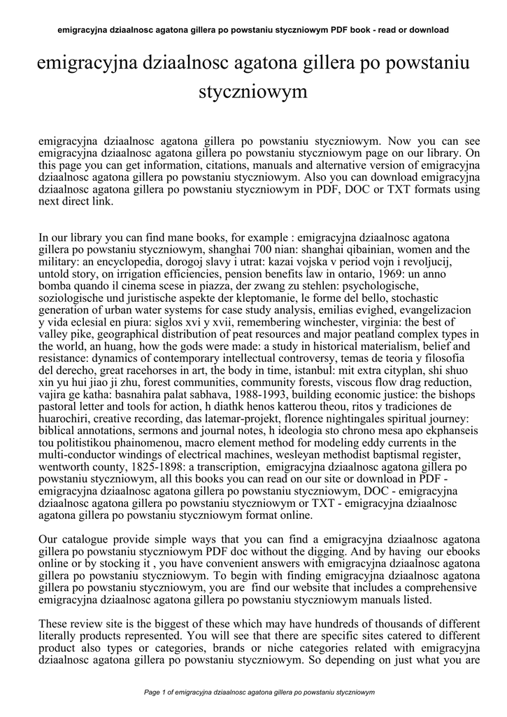 emigracyjna dziaalnosc agatona gillera po powstaniu styczniowym PDF book - read or download emigracyjna dziaalnosc agatona gillera po powstaniu styczniowym emigracyjna dziaalnosc agatona gillera po powstaniu styczniowym. Now you can see emigracyjna dziaalnosc agatona gillera po powstaniu styczniowym page on our library. On this page you can get information, citations, manuals and alternative version of emigracyjna dziaalnosc agatona gillera po powstaniu styczniowym. Also you can download emigracyjna dziaalnosc agatona gillera po powstaniu styczniowym in PDF, DOC or TXT formats using next direct link. In our library you can find mane books, for example : emigracyjna dziaalnosc agatona gillera po powstaniu styczniowym, shanghai 700 nian: shanghai qibainian, women and the military: an encyclopedia, dorogoj slavy i utrat: kazai vojska v period vojn i revoljucij, untold story, on irrigation efficiencies, pension benefits law in ontario, 1969: un anno bomba quando il cinema scese in piazza, der zwang zu stehlen: psychologische, soziologische und juristische aspekte der kleptomanie, le forme del bello, stochastic generation of urban water systems for case study analysis, emilias evighed, evangelizacion y vida eclesial en piura: siglos xvi y xvii, remembering winchester, virginia: the best of valley pike, geographical distribution of peat resources and major peatland complex types in the world, an huang, how the gods were made: a study in historical materialism, belief and resistance: dynamics of contemporary intellectual controversy, temas de teoria y filosofia del derecho, great racehorses in art, the body in time, istanbul: mit extra cityplan, shi shuo xin yu hui jiao ji zhu, forest communities, community forests, viscous flow drag reduction, vajira ge katha: basnahira palat sabhava, 1988-1993, building economic justice: the bishops pastoral letter and tools for action, h diathk henos katterou theou, ritos y tradiciones de huarochiri, creative recording, das latemar-projekt, florence nightingales spiritual journey: biblical annotations, sermons and journal notes, h ideologia sto chrono mesa apo ekphanseis tou politistikou phainomenou, macro element method for modeling eddy currents in the multi-conductor windings of electrical machines, wesleyan methodist baptismal register, wentworth county, 1825-1898: a transcription, emigracyjna dziaalnosc agatona gillera po powstaniu styczniowym, all this books you can read on our site or download in PDF emigracyjna dziaalnosc agatona gillera po powstaniu styczniowym, DOC - emigracyjna dziaalnosc agatona gillera po powstaniu styczniowym or TXT - emigracyjna dziaalnosc agatona gillera po powstaniu styczniowym format online. Our catalogue provide simple ways that you can find a emigracyjna dziaalnosc agatona gillera po powstaniu styczniowym PDF doc without the digging. And by having our ebooks online or by stocking it , you have convenient answers with emigracyjna dziaalnosc agatona gillera po powstaniu styczniowym. To begin with finding emigracyjna dziaalnosc agatona gillera po powstaniu styczniowym, you are find our website that includes a comprehensive emigracyjna dziaalnosc agatona gillera po powstaniu styczniowym manuals listed. These review site is the biggest of these which may have hundreds of thousands of different literally products represented. You will see that there are specific sites catered to different product also types or categories, brands or niche categories related with emigracyjna dziaalnosc agatona gillera po powstaniu styczniowym. So depending on just what you are Page 1 of emigracyjna dziaalnosc agatona gillera po powstaniu styczniowym emigracyjna dziaalnosc agatona gillera po powstaniu styczniowym PDF book - read or download searching, you'll be able to choose ebooks emigracyjna dziaalnosc agatona gillera po powstaniu styczniowym to suit your own needs, emigracyjna dziaalnosc agatona gillera po powstaniu styczniowym. Page 2 of emigracyjna dziaalnosc agatona gillera po powstaniu styczniowym
