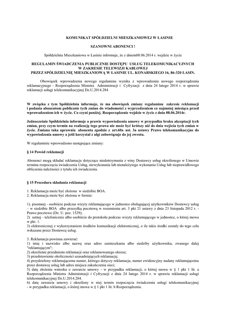 KOMUNIKAT SPÓŁDZIELNI MIESZKANIOWEJ W ŁASINIE SZANOWNI ABONENCI ! Spółdzielnia Mieszkaniowa w Łasinie informuje, że z dniem08.06.2014 r. wejdzie w życie REGULAMIN ŚWIADCZENIA PUBLICZNIE DOSTĘPU USŁUG TELEKOMUNIKACYJNYCH W ZAKRESIE TELEWIZJI KABLOWEJ PRZEZ SPÓŁDZIELNIĘ MIESZKANIOWĄ W ŁASINIE UL. KONARSKIEGO 16, 86-320 ŁASIN. Obowiązek wprowadzenia nowego regulaminu wynika z wprowadzenia nowego rozporządzenia reklamacyjnego - Rozporządzenia Ministra Administracji i Cyfryzacji z dnia 24 lutego 2014 r. w sprawie reklamacji usługi telekomunikacyjnej Dz.U.2014.284 W związku z tym Spółdzielnia informuje, że ma obowiązek zmiany regulaminu zakresie reklamacji i podania abonentom publicznie tych zmian do wiadomości z wyprzedzeniem co najmniej miesiąca przed wprowadzeniem ich w życie. Co czyni poniżej. Rozporządzenie wejdzie w życie z dniu 08.06.2014r. Jednocześnie Spółdzielnia informuje o prawie wypowiedzenia umowy w przypadku braku akceptacji tych zmian, przy czym termin na realizację tego prawa nie może być krótszy niż do dnia wejścia tych zmian w życie. Zmiana taka uprawnia abonenta zgodnie z art.60a ust. 3a ustawy Prawo telekomunikacyjne do wypowiedzenia umowy a jeśli korzystał z ulgi zobowiązuje do jej zwrotu. W regulaminie wprowadzono następujące zmiany: § 14 Powód reklamacji Abonenci mogą składać reklamacje dotyczące niedotrzymania z winy Dostawcy usług określonego w Umowie terminu rozpoczęcia świadczenia Usług, niewykonania lub nienależytego wykonania Usług lub nieprawidłowego obliczenia należności z tytułu ich świadczenia. § 15 Procedura składania reklamacji 1. Reklamacja może być złożona w siedzibie BOA. 2. Reklamacja może być złożona w formie: 1). pisemnej - osobiście podczas wizyty reklamującego w jednostce obsługującej użytkowników Dostawcy usług – w siedzibie BOA albo przesyłką pocztową w rozumieniu art. 3 pkt 21 ustawy z dnia 23 listopada 2012 r. Prawo pocztowe (Dz. U. poz. 1529); 2) ustnej - telefonicznie albo osobiście do protokołu podczas wizyty reklamującego w jednostce, o której mowa w pkt. 1. 3) elektronicznej z wykorzystaniem środków komunikacji elektronicznej, o ile takie środki zostały do tego celu wskazane przez Dostawcę usług. 3. Reklamacja powinna zawierać: 1) imię i nazwisko albo nazwę oraz adres zamieszkania albo siedziby użytkownika, zwanego dalej "reklamującym"; 2) określenie przedmiotu reklamacji oraz reklamowanego okresu; 3) przedstawienie okoliczności uzasadniających reklamację; 4) przydzielony reklamującemu numer, którego dotyczy reklamacja, numer ewidencyjny nadany reklamującemu przez dostawcę usług lub adres miejsca zakończenia sieci; 5) datę złożenia wniosku o zawarcie umowy - w przypadku reklamacji, o której mowa w § 1 pkt 1 lit. a Rozporządzenia Ministra Administracji i Cyfryzacji z dnia 24 lutego 2014 r. w sprawie reklamacji usługi telekomunikacyjnej Dz.U.2014.284. 6) datę zawarcia umowy i określony w niej termin rozpoczęcia świadczenia usługi telekomunikacyjnej - w przypadku reklamacji, o której mowa w § 1 pkt 1 lit. b Rozporządzenia. 7) wysokość kwoty odszkodowania lub innej należności wynikających z umowy o świadczenie usług telekomunikacyjnych lub z przepisów prawa - w przypadku gdy reklamujący żąda ich wypłaty; 8) numer konta bankowego lub adres właściwy do wypłaty odszkodowania lub innej należności albo wniosek o zaliczenie ich na poczet przyszłych płatności - w przypadku, o którym mowa w pkt 7; podpis reklamującego - w przypadku reklamacji złożonej w formie pisemnej. 4. W przypadku gdy reklamacja złożona przez reklamującego ustnie albo w formie pisemnej osobiście podczas wizyty reklamującego w jednostce obsługującej użytkowników Dostawcy usług nie spełnia warunków określonych w ust. 3, upoważniona osoba reprezentująca Dostawcę usług, przyjmując reklamację, jest obowiązana, o ile uzna, że jest to konieczne do prawidłowego rozpatrzenia reklamacji, do poinformowania reklamującego o konieczności jej niezwłocznego uzupełnienia z pouczeniem, że nieuzupełnienie reklamacji spowoduje pozostawienie reklamacji bez rozpoznania. Reklamacje nieuzupełnione pozostawia się bez rozpoznania. 5. W przypadku gdy reklamacja złożona w sposób inny niż wskazany w ust. 4 nie spełnia warunków określonych w ust. 3, jednostka Dostawcy usług rozpatrująca reklamację, o ile uzna, że jest to konieczne do prawidłowego rozpatrzenia reklamacji, niezwłocznie wzywa reklamującego do jej uzupełnienia, określając termin, nie krótszy niż 7 dni, i zakres tego uzupełnienia, z pouczeniem, że nieuzupełnienie reklamacji w określonym terminie spowoduje pozostawienie reklamacji bez rozpoznania. Po bezskutecznym upływie wyznaczonego terminu reklamację pozostawia się bez rozpoznania 6. Reklamacja może być złożona w terminie 12 miesięcy od ostatniego dnia okresu rozliczeniowego, w którym zakończyła się przerwa w świadczeniu usługi telekomunikacyjnej, lub od dnia, w którym usługa została nienależycie wykonana lub miała być wykonana, lub od dnia doręczenia faktury zawierającej nieprawidłowe obliczenie należności z tytułu świadczenia usługi telekomunikacyjnej. Reklamację złożoną po upływie terminu tego terminu pozostawia się bez rozpoznania, o czym jednostka Dostawcy usług rozpatrująca reklamację niezwłocznie powiadamia reklamującego. § 16 Odpowiedź na reklamację. 1.Jednostka Dostawcy usług, rozpatrująca reklamację, udziela odpowiedzi na reklamację w terminie 30 dni od dnia jej złożenia. 2. Odpowiedź na reklamację zawiera: 1) nazwę jednostki Dostawcy usług rozpatrującej reklamację; 2) informację o dniu złożenia reklamacji; 3) rozstrzygnięcie o uznaniu lub odmowie uznania reklamacji; 4) w przypadku przyznania odszkodowania lub zwrotu innej należności - określenie wysokości kwoty i terminu jego wypłaty lub zwrotu albo wskazanie, że kwota odszk