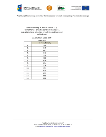 szkolenie Brzeg, ul. Trzech Kotwic 11B, firma Marko - Brzeskie Centrum Handlowe , sala szkoleniowa mieści się w budynku za biurowcem na IV piętrze 1. 2. 3. 4. 5. 6. 7. 8. 9. 10. 11. 12. 13. 14. 22.10.2013r. Godz. 8.00 GRUPA IV nr rekrutacyjny 148 149 087 146 139 128 010 094 116 151 015 033 085 020 Projekt „Powrót do zatrudnienia” Biuro projektu: 45-231 Opole, ul. Oleska 127 tel. 77 44 23 141-3 e-mail:[email protected] www.opiekun.wup.opole.pl