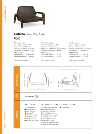 www.slidedesign.it AMERICA design Marc Sadler Poltroncina doppia Anno di produzione: 2013 Versioni: standard, laccata. Materiali: Polietilene, poliuretano. Dimensioni: 116 x 95 h 84 cm Peso: 40 Kg Imballaggio: 97 x 97 x 132 cm Volume imballaggio: 1,242 m3 Fauteuil deux places Année de production: 2013 Versions: standard, laquée. Matériaux: Polyéthylène, polyuréthane. Dimensions:116 x 95 h 84 cm Poids: 40 Kg Emballage: 97 x 97 x 132 cm Volume emballage: 1,242 m3 Double lowchair Year of production: 2013 Versions: matt, lacquered. Material: Polyethylene, polyurethane. Dimensions:116 x 95 h 84 cm Weight: 40 Kg Packaging: 97 x 97 x 132 cm Packaging volume: 1,242 m3 Note: cuscino incluso. Note: coussin inclus. Note: cushion included. 95 DIMENSIONS (cm) 116 6 48 84 56 36 CODE 90 SD AMR080 MATT COLOURS COLOURS 84 LACQUERED COLOURS WHITE (code FT) SIGNAL WHITE (code QA) BLACK (code FH) JET BLACK (code QH) GREY (code FG) IRON GREY (code QG) RED (code FD) FLAME RED (code QD) ORANGE (code FC) PURE ORANGE (code QC) YELLOW (code FB) ZINC YELLOW (code QB) GREEN (code FR) LIME GREEN (code QR) CHOCOLATE (code FE) MAGENTA (code QS) METALLIC SILVER (code QM) METALLIC GOLD (code QO) CUSHION COLOURS CHOCOLATE SYMBOLS For indoor use. Insulation class 1. Protected against the intrusion of solid objects Ø > 12 mm, not against water. For indoor and outdoor use. Insulation class 2. Protected against the intrusion of solid objects Ø > 1 mm and splashing water. Stackable item. Insulation class 3. Protected against the intrusion of dust and water jets. Conformity to the European Community instructions. Device proper to direct assembly onto normally inflammable surfaces. Fully protected against the intrusion of dust and immersion in water. European Community registered model. 100% recyclable polyethylene. Recycling and disposal of electronic waste (WEEE). Small lamp base for E14 - 14 mm light bulb. Lamp base for G13 neon tube. LED technology lighting system. Medium lamp base for E26 - 26 mm light bulb. Lamp base for GU10 spotlight. Neon tube lighting system. Standard lamp base for E27 - 27 mm light bulb. Lamp base for G4 halogen bulb. LIGHTING SYMBOLS Lighting through energy saving bulb. The upper figure shows the number of allowed bulbs. The lower figure shows the MAXIMUM recommended power. Lighting through energy saving fluorescent spotlight. The upper figure shows the number of allowed spotlights. The lower figure shows the MAXIMUM recommended power. Lighting through neon tube. The upper figure shows the number of allowed neon tubes. The lower figure shows the MAXIMUM recommended power. Lighting through energy saving globe bulb. The upper figure shows the number of allowed bulbs. The lower figure shows the MAXIMUM recommended power. Lighting through flexible LED tube. The lower figure shows the MAXIMUM recommended power. Lighting through circular T9 neon tube. The upper figure shows the number of allowed neon tubes. The lower figure shows the MAXIMUM recommended power. WIRING SYMBOLS Wiring with metal clamp. IP20 protection. Diameter 11 cm. Wiring with special base for KIT LED 1,5 WATT. IP55 protection. Diameter 11,6 cm. Wiring with metal base. IP55 protection. Diameter 10 cm. Fastening by hex screw key. Wiring with plastic screw base. I3 - IP20 protection. E3 - IP55 protection. Diameter 6 cm. Wiring with metal base. IP55 protection. Diameter 20 cm. Fastening by hex screw key. Wiring with plastic screw base. I3 - IP20 protection. E3 - IP55 protection. Diameter 10 cm. Wiring with plastic base and metal inserts. I2 - IP20 protection. E2 - IP55 protection. Diameter 10 cm. Fastening by slot screwdriver. Wiring with plastic screw base. I3 - IP20 protection. E3 - IP55 protection. Diameter 15 cm. Wiring with plastic base for LED LP RGB100. IP44 protection. Diameter 10 cm. Special metal base. IP20 protection. Several sizes. MATERIAL PROPERTIES Material: Linear low-density polyethylene - LLDPE. Production process: rotational moulding. Resistant to extreme temperatures (-60°C to +80°C). UV resistant (except for lighting colours). High tensile strength. WARNING Keep away from excessive heat sources. Avoid any improper use. Do not stand on the products. When the product has to be moved, lift the product off the ground in order to avoid damage. Do not overload the pot structure in order to avoid deforming. Carefully comply with the maintenance & cleaning instructions. In case of malfunctioning or damage of the wiring or any electrical parts, refer to a qualified electrician. MAINTENANCE & CLEANING To prevent dust and dirt from sticking to the plastic surfaces, periodically clean the products with a damp cloth and neutral liquid soap diluted in water. Avoid using ethanol or any liquids containing, even in small amounts, acetone, trichloroethylene or ammonia (solvents in general). It is recommended the use of SLIDE’s “CleanUp” cleaner or a degreaser. Spray the cleaning product on the surface, rub with a damp cloth and rinse abundantly with water (preferably with a high pressure washer). In case of persistent stains use a high pressure washer or scrub eraser. The use of the scrub eraser (melamine foam - Scotch-Brite® Easy Eraser or similar) is only recommended for white colour, as they are slightly abrasive. The lacquered version is also suitable for outdoor use, however it is more sensitive to scratches: periodically clean with a polish cleaner, gently rubbing with soft cloth/cotton wool. Cushions can be cleaned with a damp cloth, neutral liquid soap and water. For metal parts use specific cleaners. SUSTAINABILITY & RECYCLING All SLIDE products are 100% recyclable. Furthermore, grey, black and chocolate matt colours are produced with recycled polyethylene. SLIDE has a closed production cycle with no health prejudicial emissions and complying with ecological sustainibility rules. When a product reaches the end of its life, do not treat the product or any of its parts as domestic waste. Dispose by sending to diffe