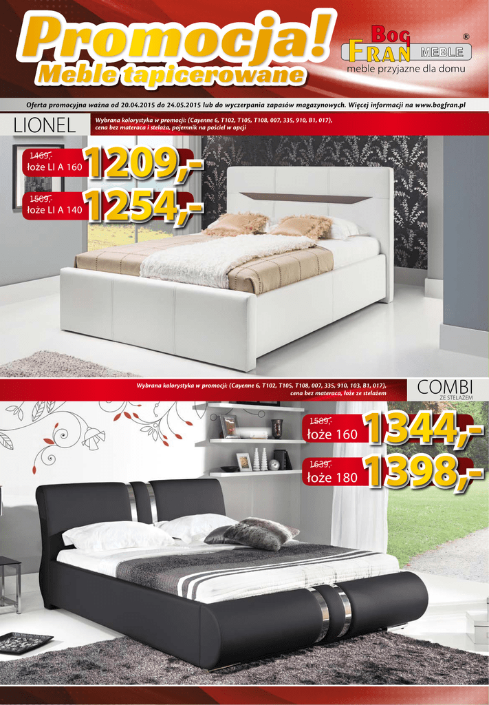 Promocja! Meble tapicerowane Oferta promocyjna ważna od 20.04.2015 do 24.05.2015 lub do wyczerpania zapasów magazynowych. Więcej informacji na www.bogfran.pl LIONEL 1469,- Wybrana kolorystyka w promocji: (Cayenne 6, T102, T105, T108, 007, 335, 910, B1, 017), cena bez materaca i stelaża, pojemnik na pościel w opcji 1209,1254,- łoże LI A 160 1509,- łoże LI A 140 Wybrana kolorystyka w promocji: (Cayenne 6, T102, T105, T108, 007, 335, 910, 103, B1, 017), cena bez materaca, łoże ze stelażem 1589,- łoże 160 1639,- łoże 180 COMBI ze stelażem 1344,1398,- Oferta promocyjna ważna od 20.04.2015 do 24.05.2015 lub do wyczerpania zapasów magazynowych. Więcej informacji na www.bogfran.pl Avalon Wybrana kolorystyka w promocji: (Cayenne 6, T105, T108, 007, 335, 910, B1, 017), cena bez materaca i stelaża, pojemnik na pościel w opcji 1349,- łoże 160 1379,- łoże 180 1099,1119,- Wybrana kolorystyka w promocji: (Cayenne 6, T105, T108, 007, 335, 910, 103, B1, 017), cena bez materaca i stelaża, pojemnik na pościel w opcji 1539,- łoże 140 1579,- łoże 160 1629,- łoże 180 1282,1308,- FORREST 1344,- SIMONA Wybrana kolorystyka w promocji: (115 - odpowiednik Cherry/103, 910/006), cena bez materaca i stelaża 1705,- łoże 140 1732,- łoże 160 1765,- łoże 180 1259,1279,1299,- Oferta promocyjna ważna od 20.04.2015 do 24.05.2015 lub do wyczerpania zapasów magazynowych. Więcej informacji na www.bogfran.pl Jazz NOWOŚĆ! szer./gł./wys. 198/89/91 pow. spania: 198/142 1129,- 2 1309,- 1 3 APOLLO szer./gł./wys. 228/142/92 pow. spania 195/142 1499,- 1579,1769,- Apollo bez automatu 22 1829,- Apollo z automatem 23 24 CAR 1099,- szer./gł./wys. 198/90/90 pow. spania: 198/145 1289,- 3 2 4 wszystkie wymiary w centymetrach Oferta promocyjna ważna od 20.04.2015 do 24.05.2015 lub do wyczerpania zapasów magazynowych. Więcej informacji na www.bogfran.pl DIANA 1199,- szer./gł./wys. 198/89/91 pow. spania: 198/143 1389,- 2 1 5 VECTOR szer./gł./wys. 198/89/87 pow. spania: 198/142 19 25 24 1169,- 1339,- PLAza 999,- szer./gł./wys. 198/89/91 pow. spania: 198/145 1239,- 4 10 12 wszystkie wymiary w centymetrach Oznaczenia: Sprężyna bonel Pojemnik na pościel Automatyczny system rozkładania BOG-FRAN Spółka z ograniczoną odpowiedzialnością Sp.k. ul. Rozbrat 10/14 lok. 3, 00-451 Warszawa, Dział handlowy: 36-130 Raniżów, Osiedle Borki 5, tel./fax +48 (17) 22 85 065 w. 13,16, +48 (17) 22 85 430 e-mail: [email protected], Meble tapicerowane: 37-110 Żołynia. Smolarzyny 1, tel. +48 (17) 22 61 298, fax +48 (17) 22 59 186 e-mail: [email protected] W ramach stałego udoskonalania produktów zgodnie z wymogami rynkowymi i prawnymi producent BOG-FRAN Spółka z ograniczoną odpowiedzialnością Sp. k. zastrzega sobie prawo do wprowadzania w dowolnej chwili zmian konstrukcyjnych oraz wymiarów w oferowanych meblach, nie zmieniając ich ogólnego charakteru. Wszystkie prezentowane meble sprzedawane są w paczkach do samodzielnego montażu. Tylko prawidłowy, czyli zgodny z instrukcją montaż mebli gwarantuje osiągnięcie satysfakcji z ich użytkowania. Prezentowana na planszy oferta nie stanowi oferty w rozumieniu Kodeksu Cywilnego. Ze względu na ograniczenia wynikające z techniki druku, kolory reprodukowane na planszy mogą różnić się od rzeczywistych kolorów oferowanych mebli. Wykorzystane na zdjęciach dekoracje nie są wliczone w cenę mebli. PUNKT SPRZEDAŻY: