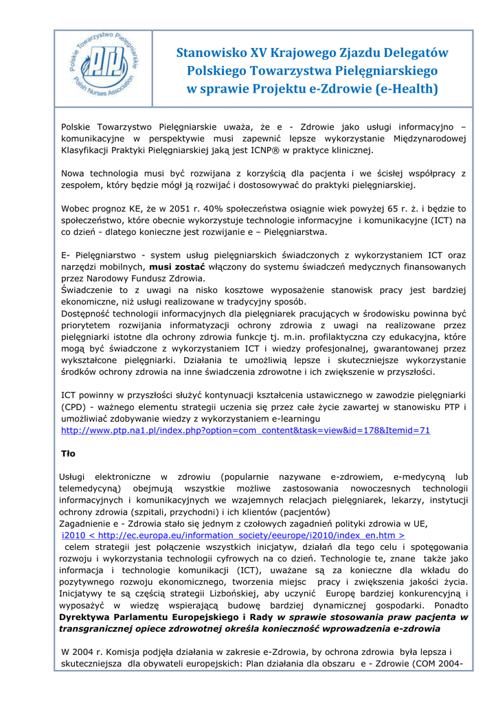 Stanowisko XV Krajowego Zjazdu Delegatów Polskiego Towarzystwa Pielęgniarskiego w sprawie Projektu e-Zdrowie (e-Health) Polskie Towarzystwo Pielęgniarskie uważa, że e - Zdrowie jako usługi informacyjno – komunikacyjne w perspektywie musi zapewnić lepsze wykorzystanie Międzynarodowej Klasyfikacji Praktyki Pielęgniarskiej jaką jest ICNP® w praktyce klinicznej. Nowa technologia musi być rozwijana z korzyścią dla pacjenta i we ścisłej współpracy z zespołem, który będzie mógł ją rozwijać i dostosowywać do praktyki pielęgniarskiej. Wobec prognoz KE, że w 2051 r. 40% społeczeństwa osiągnie wiek powyżej 65 r. ż. i będzie to społeczeństwo, które obecnie wykorzystuje technologie informacyjne i komunikacyjne (ICT) na co dzień - dlatego konieczne jest rozwijanie e – Pielęgniarstwa. E- Pielęgniarstwo - system usług pielęgniarskich świadczonych z wykorzystaniem ICT oraz narzędzi mobilnych, musi zostać włączony do systemu świadczeń medycznych finansowanych przez Narodowy Fundusz Zdrowia. Świadczenie to z uwagi na nisko kosztowe wyposażenie stanowisk pracy jest bardziej ekonomiczne, niż usługi realizowane w tradycyjny sposób. Dostępność technologii informacyjnych dla pielęgniarek pracujących w środowisku powinna być priorytetem rozwijania informatyzacji ochrony zdrowia z uwagi na realizowane przez pielęgniarki istotne dla ochrony zdrowia funkcje tj. m.in. profilaktyczna czy edukacyjna, które mogą być świadczone z wykorzystaniem ICT i wiedzy profesjonalnej, gwarantowanej przez wykształcone pielęgniarki. Działania te umożliwią lepsze i skuteczniejsze wykorzystanie środków ochrony zdrowia na inne świadczenia zdrowotne i ich zwiększenie w przyszłości. ICT powinny w przyszłości służyć kontynuacji kształcenia ustawicznego w zawodzie pielęgniarki (CPD) - ważnego elementu strategii uczenia się przez całe życie zawartej w stanowisku PTP i umożliwiać zdobywanie wiedzy z wykorzystaniem e-learningu http://www.ptp.na1.pl/index.php?option=com_content&task=view&id=178&Itemid=71 Tło Usługi elektroniczne w zdrowiu (popularnie nazywane e-zdrowiem, e-medycyną lub telemedycyną) obejmują wszystkie możliwe zastosowania nowoczesnych technologii informacyjnych i komunikacyjnych we wzajemnych relacjach pielęgniarek, lekarzy, instytucji ochrony zdrowia (szpitali, przychodni) i ich klientów (pacjentów) Zagadnienie e - Zdrowia stało się jednym z czołowych zagadnień polityki zdrowia w UE, i2010 < http://ec.europa.eu/information_society/eeurope/i2010/index_en.htm > celem strategii jest połączenie wszystkich inicjatyw, działań dla tego celu i spotęgowania rozwoju i wykorzystania technologii cyfrowych na co dzień. Technologie te, znane także jako informacja i technologie komunikacji (ICT), uważane są za konieczne dla wkładu do pozytywnego rozwoju ekonomicznego, tworzenia miejsc pracy i zwiększenia jakości życia. Inicjatywy te są częścią strategii Lizbońskiej, aby uczynić Europę bardziej konkurencyjną i wyposażyć w wiedzę wspierającą budowę bardziej dynamicznej gospodarki. Ponadto Dyrektywa Parlamentu Europejskiego i Rady w sprawie stosowania praw pacjenta w transgranicznej opiece zdrowotnej określa konieczność wprowadzenia e-zdrowia W 2004 r. Komisja podjęła działania w zakresie e-Zdrowia, by ochrona zdrowia była lepsza i skuteczniejsza dla obywateli europejskich: Plan działania dla obszaru e - Zdrowie (COM 2004- Stanowisko XV Krajowego Zjazdu Delegatów Polskiego Towarzystwa Pielęgniarskiego w sprawie Projektu e-Zdrowie (e-Health) 27.11.09 356) http://eur-lex.europa.eu/LexUriServ/LexUriServ.do?uri=COM:2008:0689:FIN:PL:PDF przedstawia jak zmiany w ochronie zdrowia, takie jak starzenie się populacji, brak zasobów ludzkich i wzrastające koszty opieki zdrowotnej wpływają na wysoką jakość i dostępność opieki. e - Zdrowie, chociaż trudne do zdefiniowania, zawiera wszystkie ww. inicjatywy, a które umożliwiają ulepszoną administrację w zakresie zdrowia i poprawę przepływu informacji i jej upowszechnianie np. dla promowania zdrowia, elektronicznych zapisów zdrowia, telemedycyny i innych usług jak np. przepisywanie leków, możliwych do wykorzystania z pomocą przenośnych systemów, które porozumiewają się miedzy sobą, portali zdrowia i wielu innych ICT – narzędzia wspierające i pomagające w zapobieganiu chorobom, diagnozowaniu, opiece, monitorowaniu zdrowia i zarządzaniu stylem życia. Korzyści z e - Zdrowia są ogromne, między innymi technologia ICT może zaoferować: Ulepszony dostęp do informacji: Pacjenci mogą otrzymać lepszą informację o różnych metodach leczenia, umożliwiających poprawę stanu zdrowia. Narzędzia dostępne on-line mogą pomóc pacjentom lepiej zrozumieć ich sytuację zdrowotną i dostarczyć prostą informację ułatwiającą zrozumienie, z wykorzystaniem forum dyskusyjnego, którego uczestnikami są osoby z podobnym problemem zdrowotnym. Ponadto, e - Zdrowie może uprościć profesjonalistom proces samej ochrony zdrowia populacji, łatwiej jest uzyskać dostęp do informacji i podzielić się nimi, zarówno w zakresie ogólnym jak i w konkretnym przypadku pacjent – sytuacja/problem. Wykorzystanie elektronicznych zapisów dokumentacji pozwala profesjonalistom ochrony zdrowia dowiedzieć się dużo więcej z dokumentacji medycznej jednostki niż z wykorzystaniem tradycyjnych kartek papieru (często nieczytelnych), a dzięki temu ulepszyć komunikację między szpitalami i POZ. Ponadto stan pacjenta może być monitorowany na odległość ułatwiając ciągłość opieki i wprowadzając dostępność do nowości w POZ i opiece szpitalnej. Zwiększenie koncentracji ochrony zdrowia nad pacjentem: Powszechne wprowadzenie e - Zdrowia może umożliwić zwiększony dostęp do usług ochrony zdrowia, które coraz bardziej się rozwijają. Pozwoli to profesjonalistom ochrony zdrowia stać się elastyczniejszymi i bardziej zdolnymi, by ukierunko
