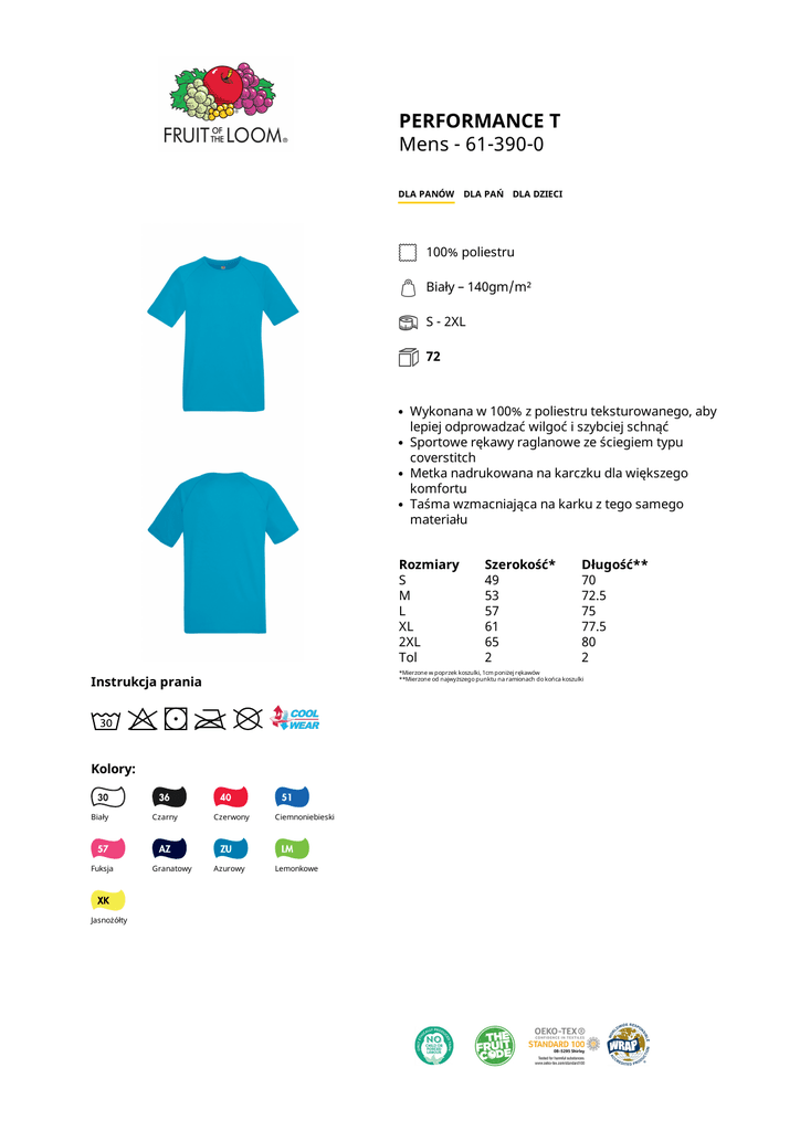 PERFORMANCE T Mens - 61-390-0 DLA PANÓW DLA PAŃ DLA DZIECI 100% poliestru Biały – 140gm/m² S - 2XL 72 Wykonana w 100% z poliestru teksturowanego, aby lepiej odprowadzać wilgoć i szybciej schnąć Sportowe rękawy raglanowe ze ściegiem typu coverstitch Metka nadrukowana na karczku dla większego komfortu Taśma wzmacniająca na karku z tego samego materiału Rozmiary S M L XL 2XL Tol Długość** 70 72.5 75 77.5 80 2 *Mierzone w poprzek koszulki, 1cm poniżej rękawów **Mierzone od najwyższego punktu na ramionach do końca koszulki Instrukcja prania Kolory: Biały Czarny Czerwony Ciemnoniebieski Fuksja Granatowy Azurowy Lemonkowe Jasnożółty Szerokość* 49 53 57 61 65 2