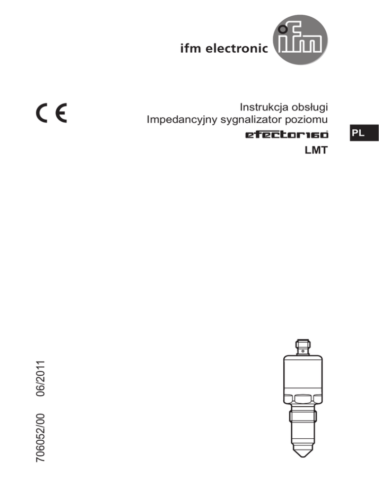 Instrukcja obsługi Impedancyjny sygnalizator poziomu PL 706052/0006/2011 LMT Spis treści 1 Uwaga wstępna���������������������������������������������������������������������������������������������������3 1.1 Symbole���������������������������������������������������������������������������������������������������������3 2 Instrukcje dotyczące bezpieczeństwa�����������������������������������������������������������������3 3 Funkcje i własności����������������������������������������������������������������������������������������������4 3.1 Obszar zastosowań���������������������������������������������������������������������������������������4 3.2 Ograniczenia w stosowaniu���������������������������������������������������������������������������5 4 Działanie��������������������������������������������������������������������������������������������������������������5 4.1 Zasada pomiaru���������������������������������������������������������������������������������������������5 4.2 Przetwarzanie zmierzonych sygnałów�����������������������������������������������������������5 4.3 Cechy urządzenia������������������������������������������������������������������������������������������5 4.4 Przykłady aplikacji�����������������������������������������������������������������������������������������6 5 Montaż�����������������������������������������������������������������������������������������������������������������6 5.1 Miejsce montażu��������������������������������������������������������������������������������������������6 5.2 Montaż�����������������������������������������������������������������������������������������������������������7 5.2.1 Adapter tri-clamp / do rur����������������������������������������������������������������������8 5.2.2 Adapter do wspawania / wkręcenia������������������������������������������������������8 5.3 Uwagi na temat montażu zgodnego z 3A������������������������������������������������������9 5.4 Uwagi na temat użytkowania zgodnego z EHEDG���������������������������������������9 6 Podłączenie elektryczne������������������������������������������������������������������������������������10 7 Działanie������������������������������������������������������������������������������������������������������������10 8 Konserwacja, naprawa i utylizacja���������������������������������������������������������������������10 9 Rysunek wymiarowy����������������