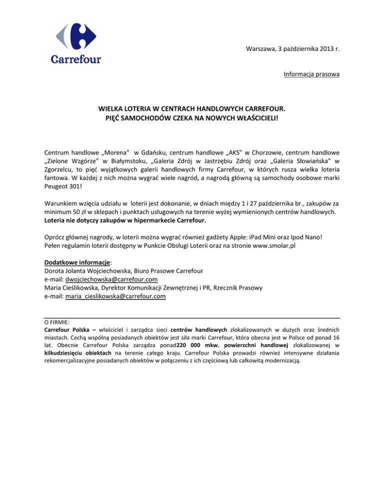 Warszawa, 3 października 2013 r. Informacja prasowa WIELKA LOTERIA W CENTRACH HANDLOWYCH CARREFOUR. PIĘĆ SAMOCHODÓW CZEKA NA NOWYCH WŁAŚCICIELI! Centrum handlowe „Morena” w Gdańsku, centrum handlowe „AKS” w Chorzowie, centrum handlowe „Zielone Wzgórze” w Białymstoku, „Galeria Zdrój w Jastrzębiu Zdrój oraz „Galeria Słowiańska” w Zgorzelcu, to pięć wyjątkowych galerii handlowych firmy Carrefour, w których rusza wielka loteria fantowa. W każdej z nich można wygrać wiele nagród, a nagrodą główną są samochody osobowe marki Peugeot 301! Warunkiem wzięcia udziału w loterii jest dokonanie, w dniach między 1 i 27 października br., zakupów za minimum 50 zł w sklepach i punktach usługowych na terenie wyżej wymienionych centrów handlowych. Loteria nie dotyczy zakupów w hipermarkecie Carrefour. Oprócz głównej nagrody, w loterii można wygrać również gadżety Apple: iPad Mini oraz Ipod Nano! Pełen regulamin loterii dostępny w Punkcie Obsługi Loterii oraz na stronie www.smolar.pl Dodatkowe informacje: Dorota Jolanta Wojciechowska, Biuro Prasowe Carrefour e-mail: [email protected] Maria Cieślikowska, Dyrektor Komunikacji Zewnętrznej i PR, Rzecznik Prasowy e-mail: [email protected] O FIRMIE: Carrefour Polska – właściciel i zarządca sieci centrów handlowych zlokalizowanych w dużych oraz średnich miastach. Cechą wspólną posiadanych obiektów jest siła marki Carrefour, która obecna jest w Polsce od ponad 16 lat. Obecnie Carrefour Polska zarządza ponad220 000 mkw. powierzchni handlowej zlokalizowanej w kilkudziesięciu obiektach na terenie całego kraju. Carrefour Polska prowadzi również intensywne działania rekomercjalizacyjne posiadanych obiektów w połączeniu z ich częściową lub całkowitą modernizacją.