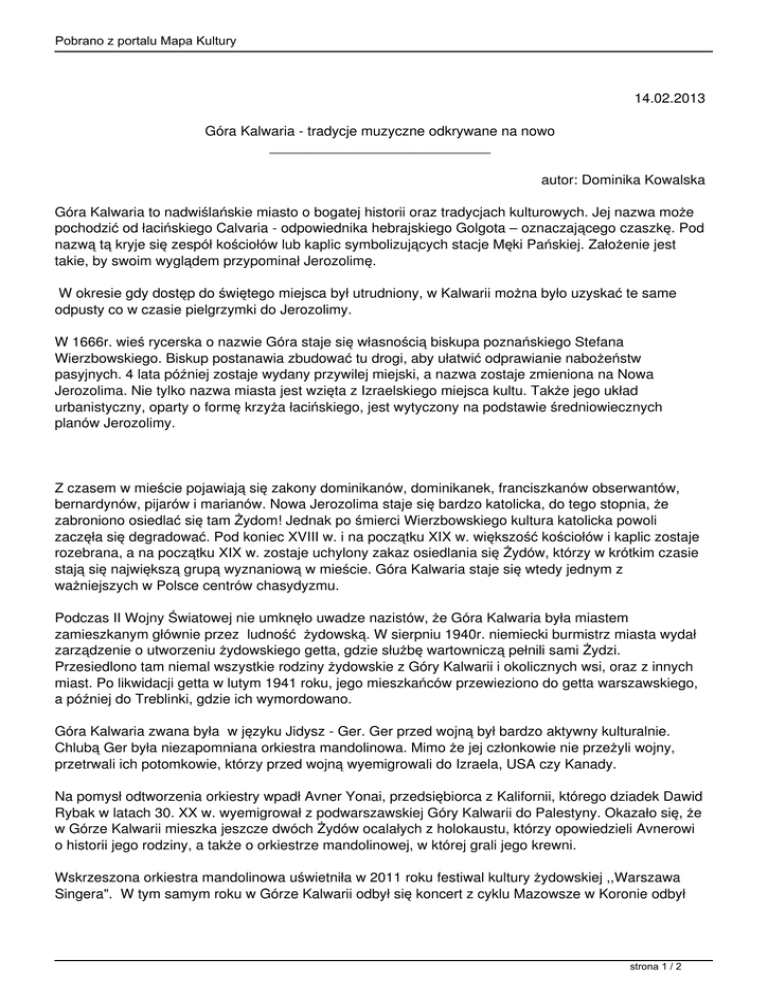 Pobrano z portalu Mapa Kultury 14.02.2013 Góra Kalwaria - tradycje muzyczne odkrywane na nowo ____________________________ autor: Dominika Kowalska Góra Kalwaria to nadwiślańskie miasto o bogatej historii oraz tradycjach kulturowych. Jej nazwa może pochodzić od łacińskiego Calvaria - odpowiednika hebrajskiego Golgota – oznaczającego czaszkę. Pod nazwą tą kryje się zespół kościołów lub kaplic symbolizujących stacje Męki Pańskiej. Założenie jest takie, by swoim wyglądem przypominał Jerozolimę. W okresie gdy dostęp do świętego miejsca był utrudniony, w Kalwarii można było uzyskać te same odpusty co w czasie pielgrzymki do Jerozolimy. W 1666r. wieś rycerska o nazwie Góra staje się własnością biskupa poznańskiego Stefana Wierzbowskiego. Biskup postanawia zbudować tu drogi, aby ułatwić odprawianie nabożeństw pasyjnych. 4 lata później zostaje wydany przywilej miejski, a nazwa zostaje zmieniona na Nowa Jerozolima. Nie tylko nazwa miasta jest wzięta z Izraelskiego miejsca kultu. Także jego układ urbanistyczny, oparty o formę krzyża łacińskiego, jest wytyczony na podstawie średniowiecznych planów Jerozolimy. Z czasem w mieście pojawiają się zakony dominikanów, dominikanek, franciszkanów obserwantów, bernardynów, pijarów i marianów. Nowa Jerozolima staje się bardzo katolicka, do tego stopnia, że zabroniono osiedlać się tam Żydom! Jednak po śmierci Wierzbowskiego kultura katolicka powoli zaczęła się degradować. Pod koniec XVIII w. i na początku XIX w. większość kościołów i kaplic zostaje rozebrana, a na początku XIX w. zostaje uchylony zakaz osiedlania się Żydów, którzy w krótkim czasie stają się największą grupą wyznaniową w mieście. Góra Kalwaria staje się wtedy jednym z ważniejszych w Polsce centrów chasydyzmu. Podczas II Wojny Światowej nie umknęło uwadze nazistów, że Góra Kalwaria była miastem zamieszkanym głównie przez ludność żydowską. W sierpniu 1940r. niemiecki burmistrz miasta wydał zarządzenie o utworzeniu żydowskiego getta, gdzie służbę wartowniczą pełnili sami Żydzi. Przesiedlono tam niemal wszystkie rodziny żydowskie z Góry Kalwarii i okolicznych wsi, oraz z innych miast. Po likwidacji getta w lutym 1941 roku, jego mieszkańców przewieziono do getta warszawskiego, a później do Treblinki, gdzie ich wymordowano. Góra Kalwaria zwana była w języku Jidysz - Ger. Ger przed wojną był bardzo aktywny kulturalnie. Chlubą Ger była niezapomniana orkiestra mandolinowa. Mimo że jej członkowie nie przeżyli wojny, przetrwali ich potomkowie, którzy przed wojną wyemigrowali do Izraela, USA czy Kanady. Na pomysł odtworzenia orkiestry wpadł Avner Yonai, przedsiębiorca z Kalifornii, którego dziadek Dawid Rybak w latach 30. XX w. wyemigrował z podwarszawskiej Góry Kalwarii do Palestyny. Okazało się, że w Górze Kalwarii mieszka jeszcze dwóch Żydów ocalałych z holokaustu, którzy opowiedzieli Avnerowi o historii jego rodziny, a także o orkiestrze mandolinowej, w której grali jego krewni. Wskrzeszona orkiestra mandolinowa uświetniła w 2011 roku festiwal kultury żydowskiej ,,Warszawa Singera". W tym samym roku w Górze Kalwarii odbył się koncert z cyklu Mazowsze w Koronie odbył strona 1 / 2 Pobrano z portalu Mapa Kultury się 19 listopada w Kościele parafialnym pw. Niepokalanego Poczęcia NMP. Mogliśmy wysłuchać repertuaru "Ojcze Nasz" w wykonaniu chóru Szkoły Głównej Handlowej pod batutą Tomasza Hynka. Kościół w Górze Kalwarii to perła architektury mazowieckiej zarówno pod względem wizualnym jak i akustycznym. Idealny do goszczenia tego typu koncertów. Góra Kalwaria jest na pewno miejscem wartym uwagi, zwłaszcza ze względu na swoją historię. Jest to miejsce idealne na weekendowy wypad za miasto, tym bardziej, że leży niespełna 30km od Warszawy. strona 2 / 2