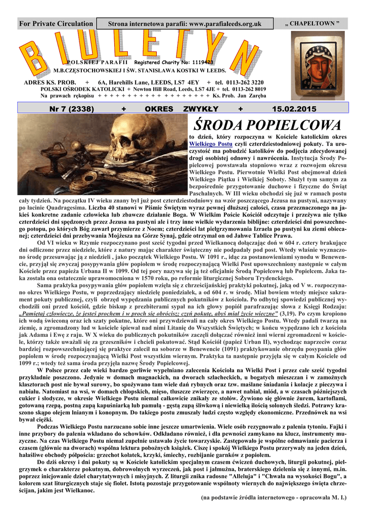 For Private Circulation Strona internetowa parafii: www.parafialeeds.org.uk P O L SK I E J P A R A F I I „ CHAPELTOWN ” Registered Charity No: 1119423 M.B.CZĘSTOCHOWSKIEJ I ŚW. STANISŁAWA KOSTKI W LEEDS. ADRES KS. PROB. + 6A, Harehills Lane, LEEDS, LS7 4EY + tel. 0113-262 3220 POLSKI OŚRODEK KATOLICKI + Newton Hill Road, Leeds, LS7 4JE + tel. 0113-262 8019 Na prawach rękopisu + + + + + + + + + + + + + + + + + + + Ks. Prob. Jan Zaręba Nr 7 (2338) + OKRES ZWYKŁY + 15.02.2015 ŚRODA POPIELCOWA to dzień, który rozpoczyna w Kościele katolickim okres Wielkiego Postu czyli czterdziestodniowej pokuty. Ta uroczystość ma pobudzić katolików do podjęcia zdecydowanej drogi osobistej odnowy i nawrócenia. Instytucja Środy Popielcowej powstawała stopniowo wraz z rozwojem okresu Wielkiego Postu. Pierwotnie Wielki Post obejmował dzień Wielkiego Piątku i Wielkiej Soboty. Służył tym samym za bezpośrednie przygotowanie duchowe i fizyczne do Świąt Paschalnych. W III wieku obchodzi się już w ramach postu cały tydzień. Na początku IV wieku znany był już post czterdziestodniowy na wzór poszczącego Jezusa na pustyni, nazywany po łacinie Quadragesima. Liczba 40 stanowi w Piśmie Świętym wyraz pewnej dłuższej całości, czasu przeznaczonego na jakieś konkretne zadanie człowieka lub zbawcze działanie Boga. W Wielkim Poście Kościół odczytuje i przeżywa nie tylko czterdzieści dni spędzonych przez Jezusa na pustyni ale i trzy inne wielkie wydarzenia biblijne: czterdzieści dni powszechnego potopu, po których Bóg zawarł przymierze z Noem; czterdzieści lat pielgrzymowania Izraela po pustyni ku ziemi obiecanej; czterdzieści dni przebywania Mojżesza na Górze Synaj, gdzie otrzymał on od Jahwe Tablice Prawa. Od VI wieku w Rzymie rozpoczynano post sześć tygodni przed Wielkanocą dołączając doń w 604 r. cztery brakujące dni odliczone przez niedziele, które z natury mając charakter świąteczny nie podpadały pod post. Wtedy właśnie wyznaczono środę przesuwając ją z niedzieli , jako początek Wielkiego Postu. W 1091 r., idąc za postanowieniami synodu w Benewencie, przyjął się zwyczaj posypywania głów popiołem w środę rozpoczynającą Wielki Post upowszechniony następnie w całym Kościele przez papieża Urbana II w 1099. Od tej pory nazywa się ją też oficjalnie Środą Popielcową lub Popielcem. Jaka taka została ona ostatecznie uprawomocniona w 1570 roku, po reformie liturgicznej Soboru Trydenckiego. Sama praktyka posypywania głów popiołem wzięła się z chrześcijańskiej praktyki pokutnej, jaką od V w. rozpoczynano okres Wielkiego Postu, w poprzedzający niedzielę poniedziałek, a od 604 r. w środę. Miał bowiem wtedy miejsce sakrament pokuty publicznej, czyli obrzęd wypędzania publicznych pokutników z kościoła. Po odbytej spowiedzi publicznej wychodzili oni przed kościół, gdzie biskup z prezbiterami sypał na ich głowy popiół parafrazując słowa z Księgi Rodzaju: „Pamiętaj człowiecze, że jesteś prochem i w proch się obrócisz; czyń pokutę, abyś miał życie wieczne” (3,19). Po czym kropiono ich wodą świeconą oraz ich szaty pokutne, które oni przywdziewali na cały okres Wielkiego Postu. Wtedy padali twarzą na ziemię, a zgromadzony lud w kościele śpiewał nad nimi Litanię do Wszystkich Świętych; w końcu wypędzano ich z kościoła jak Adama i Ewę z raju. W X wieku do publicznych pokutników zaczęli dołączać również inni wierni zgromadzeni w kościele, którzy także uważali się za grzeszników i chcieli pokutować. Stąd Kościół (papież Urban II), wychodząc naprzeciw coraz bardziej rozpowszechniającej się praktyce zalecił na soborze w Benewencie (1091) praktykowanie obrzędu posypania głów popiołem w środę rozpoczynającą Wielki Post wszystkim wiernym. Praktyka ta następnie przyjęła się w całym Kościele od 1099 r.; wtedy też sama środa przyjęła nazwę Środy Popielcowej. W Polsce przez całe wieki bardzo gorliwie wypełniano zalecenia Kościoła na Wielki Post i przez całe sześć tygodni przykładnie poszczono. Jedynie w domach magnackich, na dworach szlacheckich, u bogatych mieszczan i w zamożnych klasztorach post nie bywał surowy, bo spożywano tam wiele dań rybnych oraz tzw. maślane śniadania i kolacje z pieczywa i nabiału. Natomiast na wsi, w domach chłopskich, mięso, tłuszcze zwierzęce, a nawet nabiał, miód, a w czasach późniejszych cukier i słodycze, w okresie Wielkiego Postu niemal całkowicie znikały ze stołów. Żywiono się głównie żurem, kartoflami, gotowaną rzepą, postną zupą kapuśniarką lub pamułą - gęstą zupą śliwkową i niewielką ilością solonych śledzi. Potrawy kraszono skąpo olejem lnianym i konopnym. Do takiego postu zmuszały ludzi często względy ekonomiczne. Przednówek na wsi bywał ciężki. Podczas Wielkiego Postu narzucano sobie inne jeszcze umartwienia. Wiele osób rezygnowało z palenia tytoniu. Fajki i inne przybory do palenia wkładano do schowków. Odkładano również, i dla pewności zamykano na klucz, instrumenty muzyczne. Na czas Wielkiego Postu niemal zupełnie ustawało życie towarzyskie. Zastępowało je wspólne odmawianie pacierza i czasem (głównie na dworach) wspólna lektura pobożnych książek. Ciszę i spokój Wielkiego Postu przerywały na jeden dzień, hałaśliwe obchody półpościa: grzechot kołatek, krzyki, śmiechy, rozbijanie garnków z popiołem. Do dziś okresy i dni pokuty są w Kościele katolickim specjalnym czasem ćwiczeń duchowych, liturgii pokutnej, pielgrzymek o charakterze pokutnym, dobrowolnych wyrzeczeń, jak post i jałmużna, braterskiego dzielenia się z innymi, m.in. poprzez inicjowanie dzieł charytatywnych i misyjnych. Z liturgii znika radosne "Alleluja" i "Chwała na wysokości Bogu", a kolorem szat liturgicznych staje się fiolet. Istotą pozostaje przygotowanie wspólnoty wiernych do największego święta chrześcijan, jakim jest Wielkanoc.