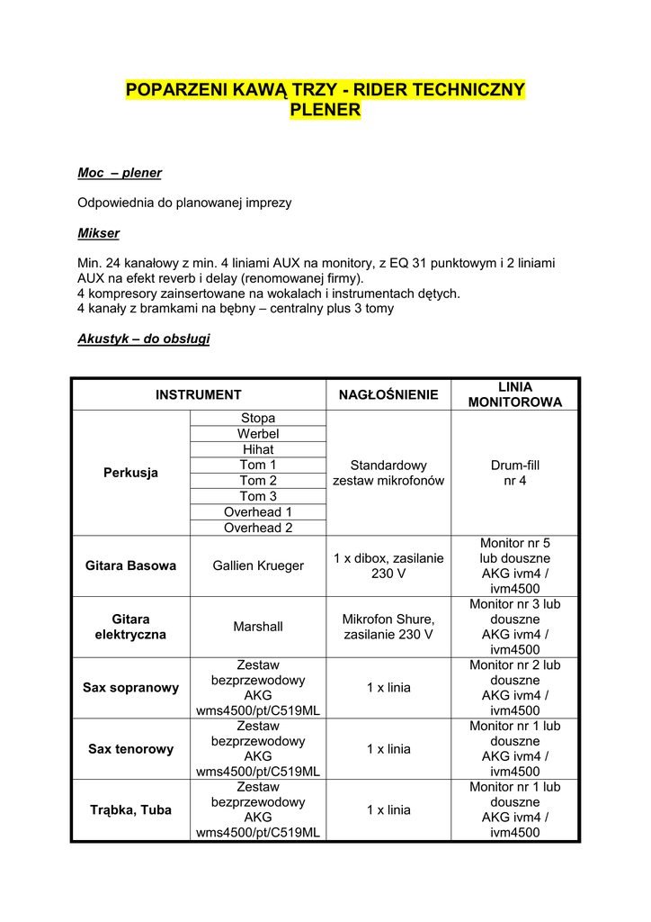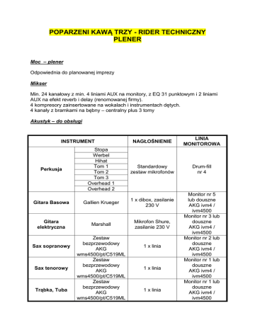POPARZENI KAWĄ TRZY - RIDER TECHNICZNY PLENER Moc – plener Odpowiednia do planowanej imprezy Mikser Min. 24 kanałowy z min. 4 liniami AUX na monitory, z EQ 31 punktowym i 2 liniami AUX na efekt reverb i delay (renomowanej firmy). 4 kompresory zainsertowane na wokalach i instrumentach dętych. 4 kanały z bramkami na bębny – centralny plus 3 tomy Akustyk – do obsługi NAGŁOŚNIENIE LINIA MONITOROWA Stopa Werbel Hihat Tom 1 Tom 2 Tom 3 Overhead 1 Overhead 2 Standardowy zestaw mikrofonów Drum-fill nr 4 Gitara Basowa Gallien Krueger 1 x dibox, zasilanie 230 V Gitara elektryczna Marshall Mikrofon Shure, zasilanie 230 V INSTRUMENT Perkusja Sax sopranowy Sax tenorowy Trąbka, Tuba Zestaw bezprzewodowy AKG wms4500/pt/C519ML Zestaw bezprzewodowy AKG wms4500/pt/C519ML Zestaw bezprzewodowy AKG wms4500/pt/C519ML 1 x linia 1 x linia 1 x linia Monitor nr 5 lub douszne AKG ivm4 / ivm4500 Monitor nr 3 lub douszne AKG ivm4 / ivm4500 Monitor nr 2 lub douszne AKG ivm4 / ivm4500 Monitor nr 1 lub douszne AKG ivm4 / ivm4500 Monitor nr 1 lub douszne AKG ivm4 / ivm4500 AKG D-40 Mikrofon dynamiczny Puzon LD Systems Wokal główny chórki Mikrofon dynamiczny 3 x mikrofon Shure Monitor nr 1 lub douszne AKG ivm4 / ivm4500 Monitor nr 2 POPARZENI KAWĄ TRZY – Ustawienie na scenie Widownia MIC 2 1 3 MIC MIC KRTEK PUZON VOKAL 5 2 1 MIC 3 ROMEK SAX ALT LID-VOKAL KRZYŚ TRĄBKA, TUBA, VOKAL SKAWA GITARA VOKAL MARIANO SAX TENOR VOKAL MARIO BASS 2m 1 4 WOJTEK PERKUSJA 3m